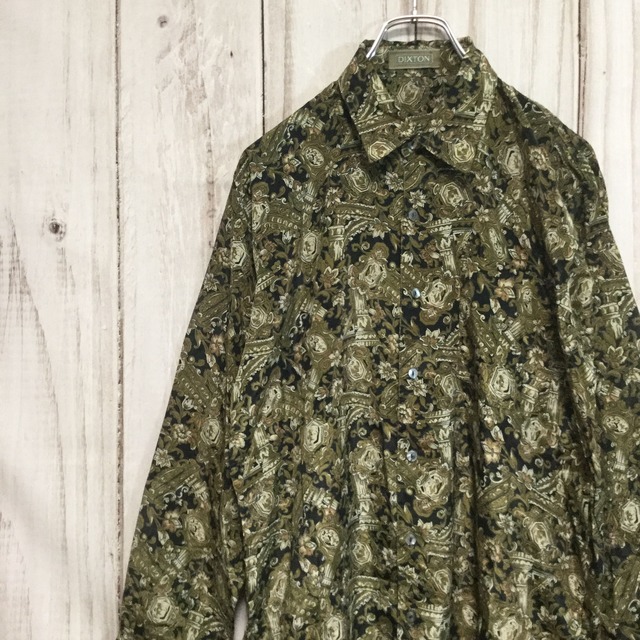 【レトロ ダークカラー ペイズリー 長袖総柄シャツ】ヴィンテージ 90s L相当 ダークグリーン 古着 [240929-007]