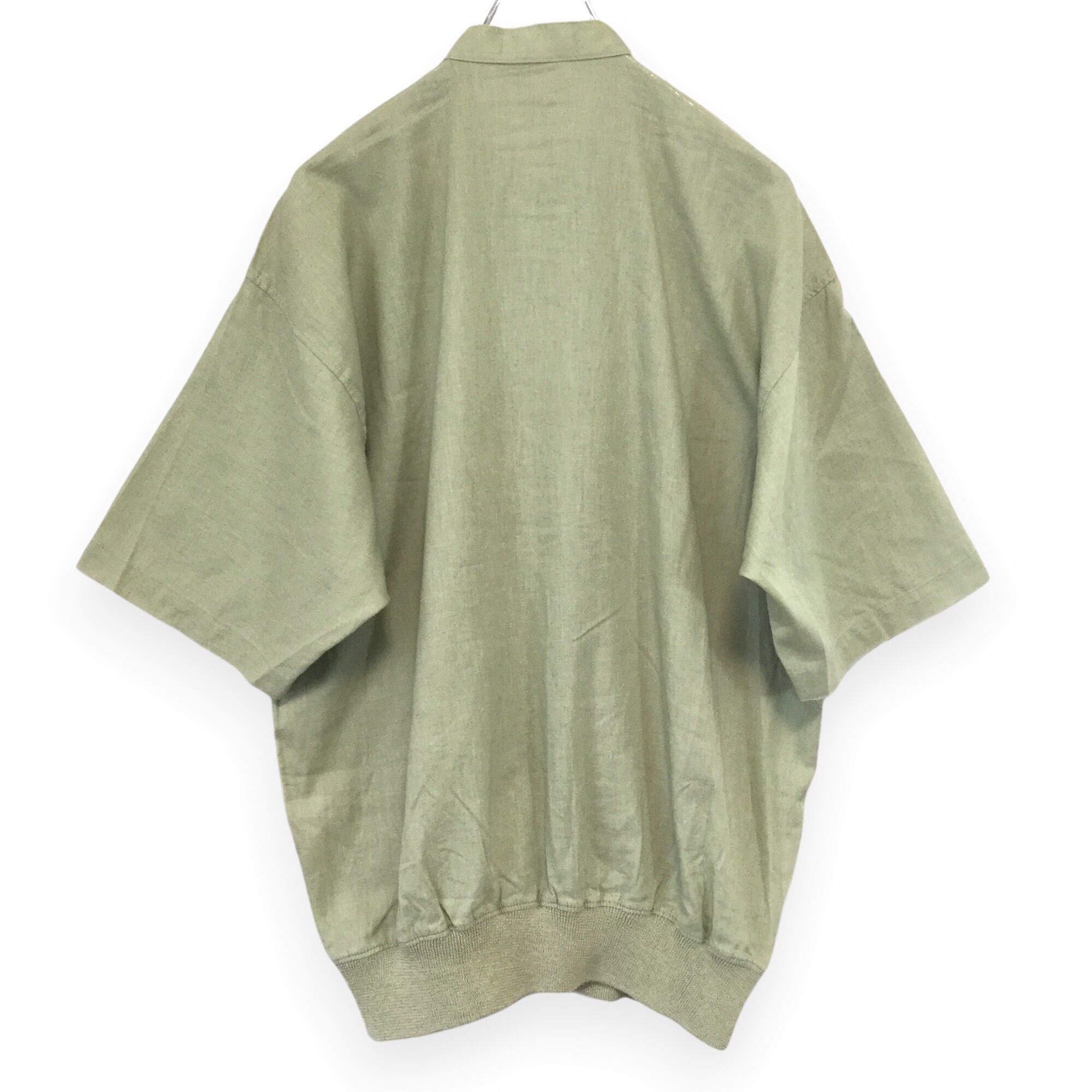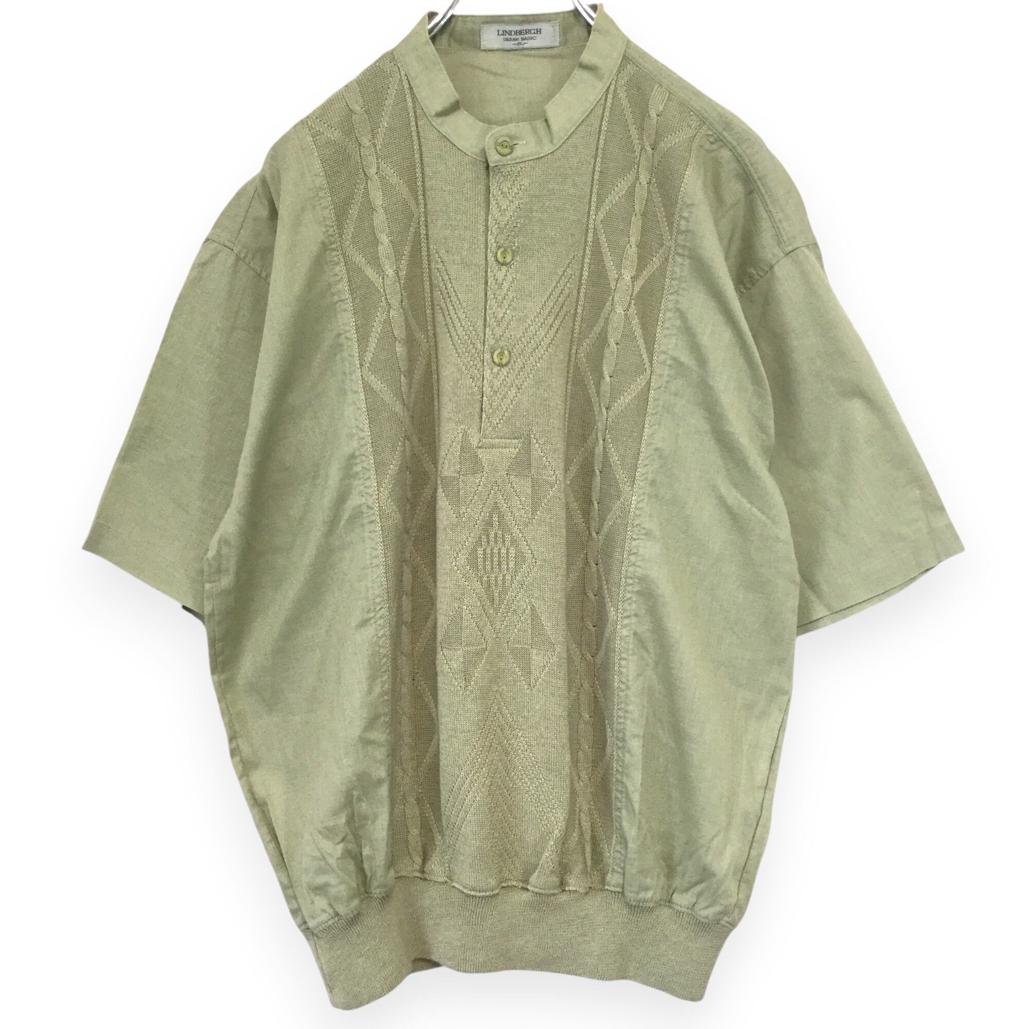 【昭和レトロ 麻混 半袖ポロシャツ】 ケーブル編み 日本製 裾リブ バンドカラー XL カーキ 古着 [230526-002]