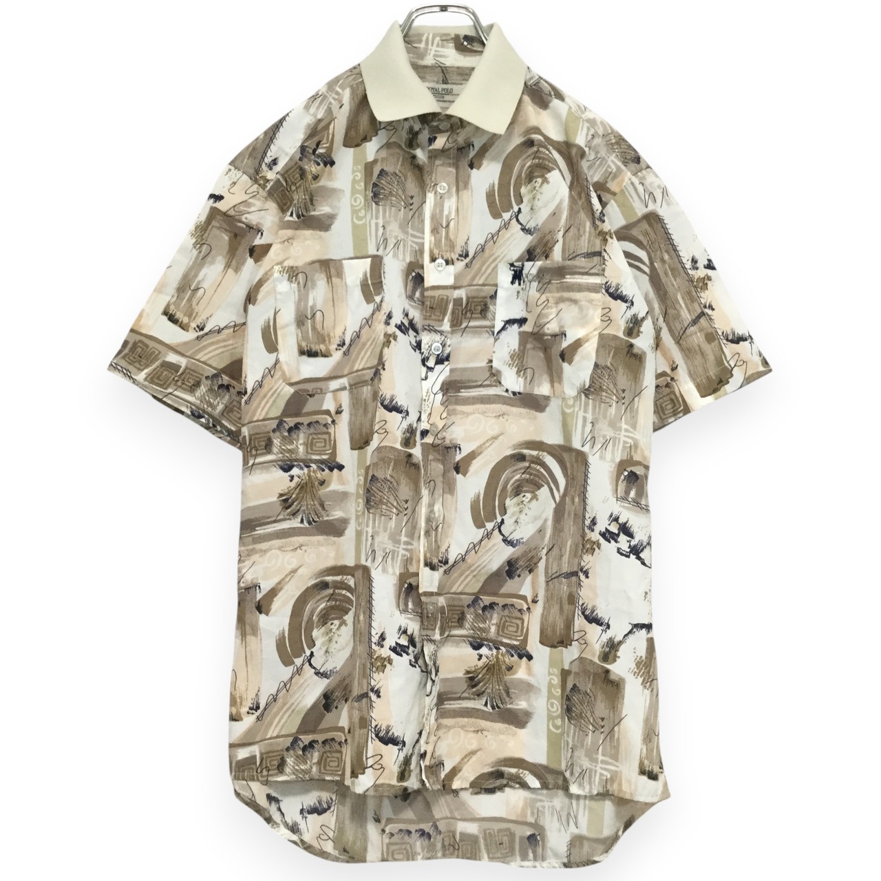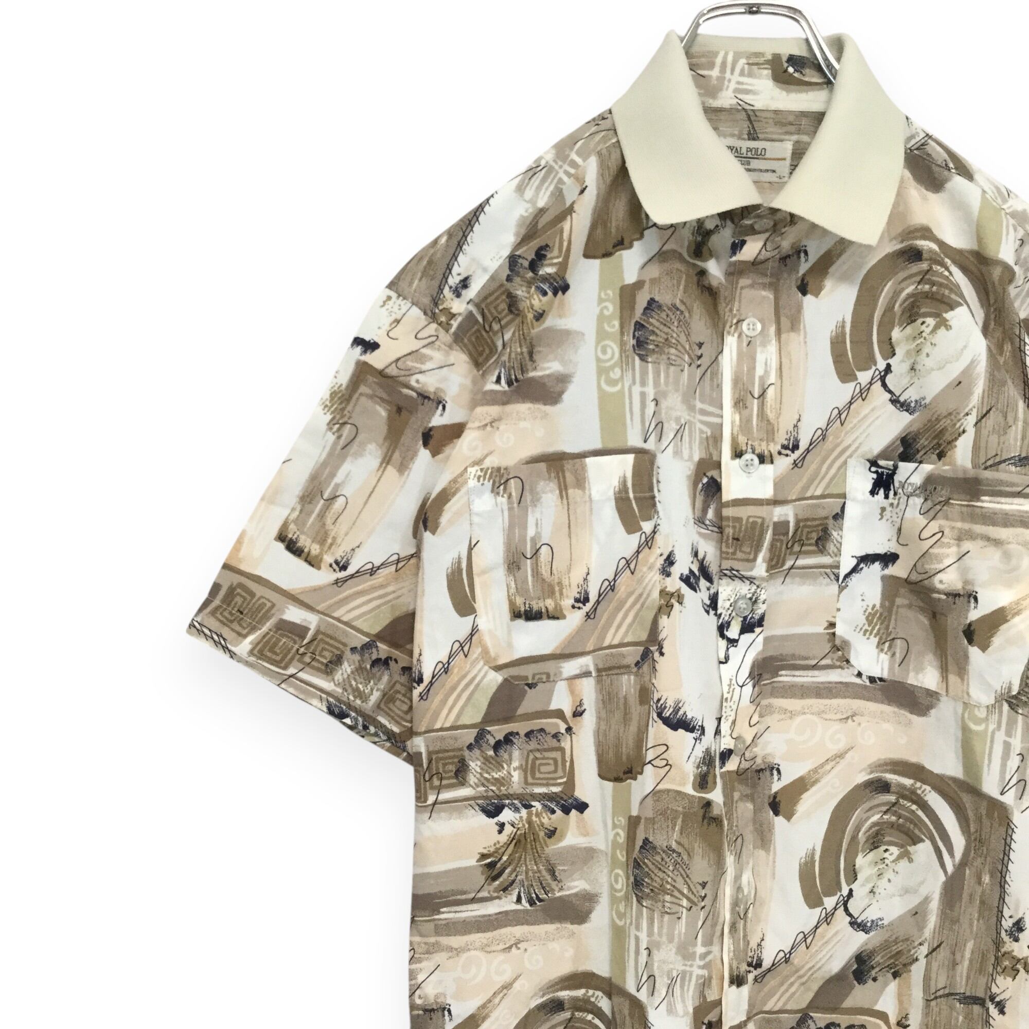 【昭和レトロ 半袖シャツ】総柄 襟色違い L ベージュ 古着 [230526-038]