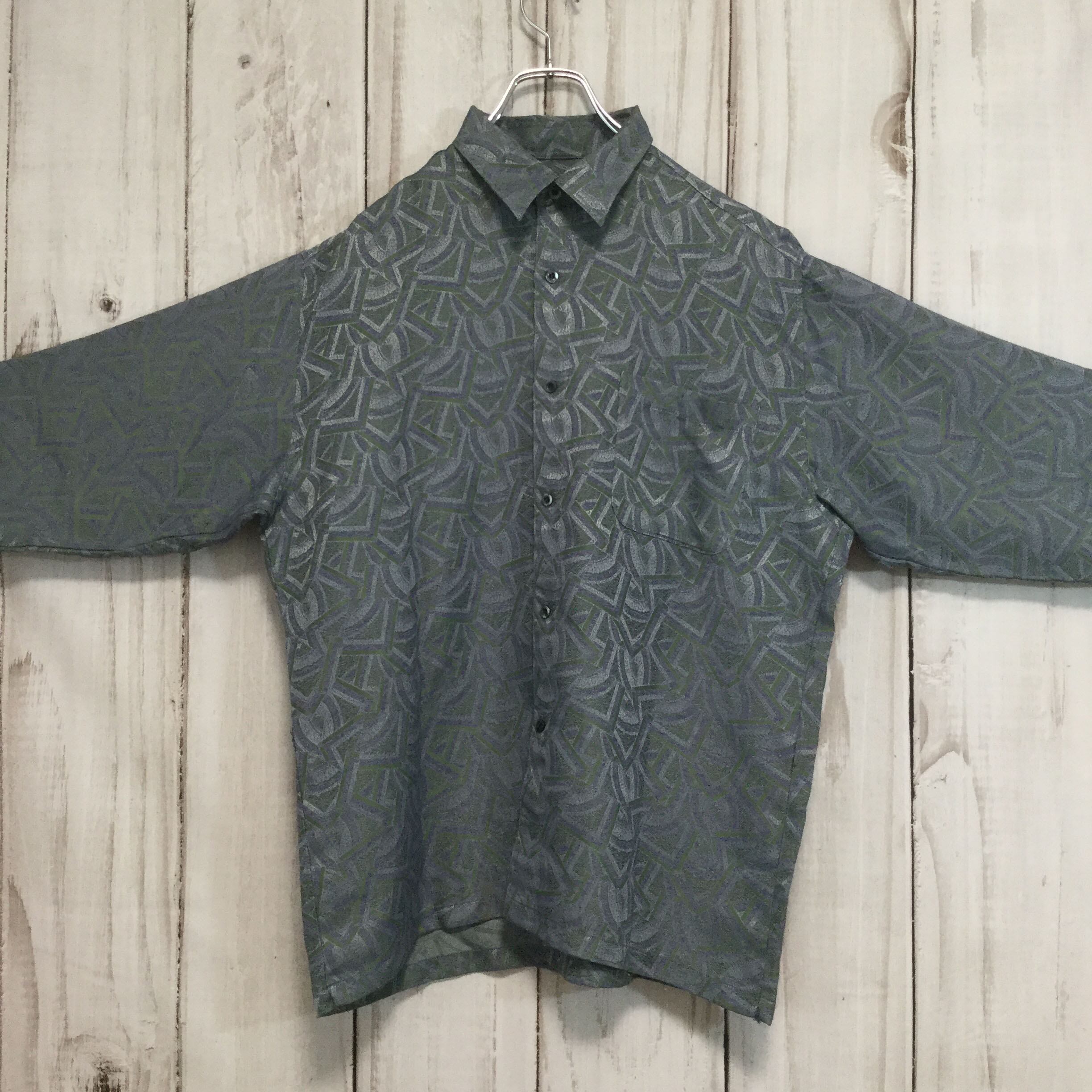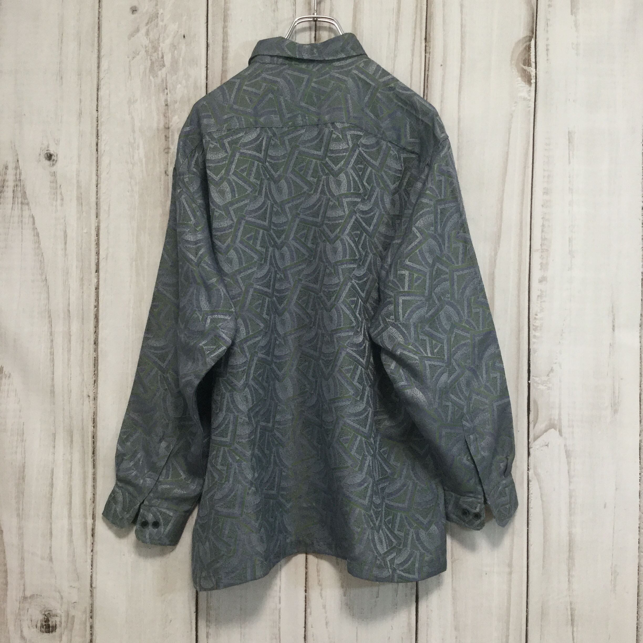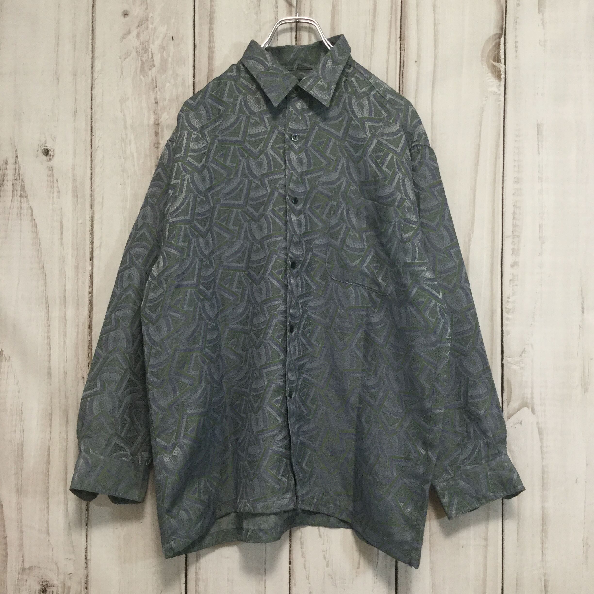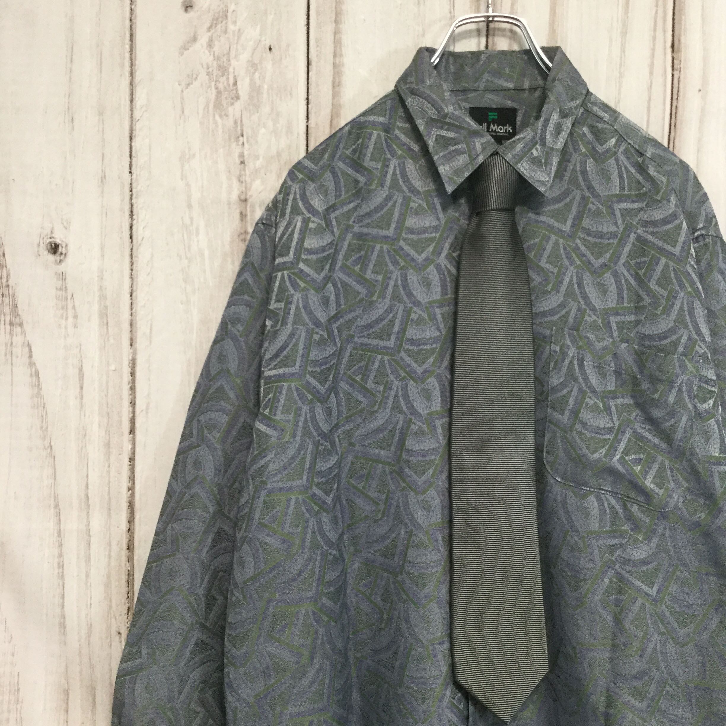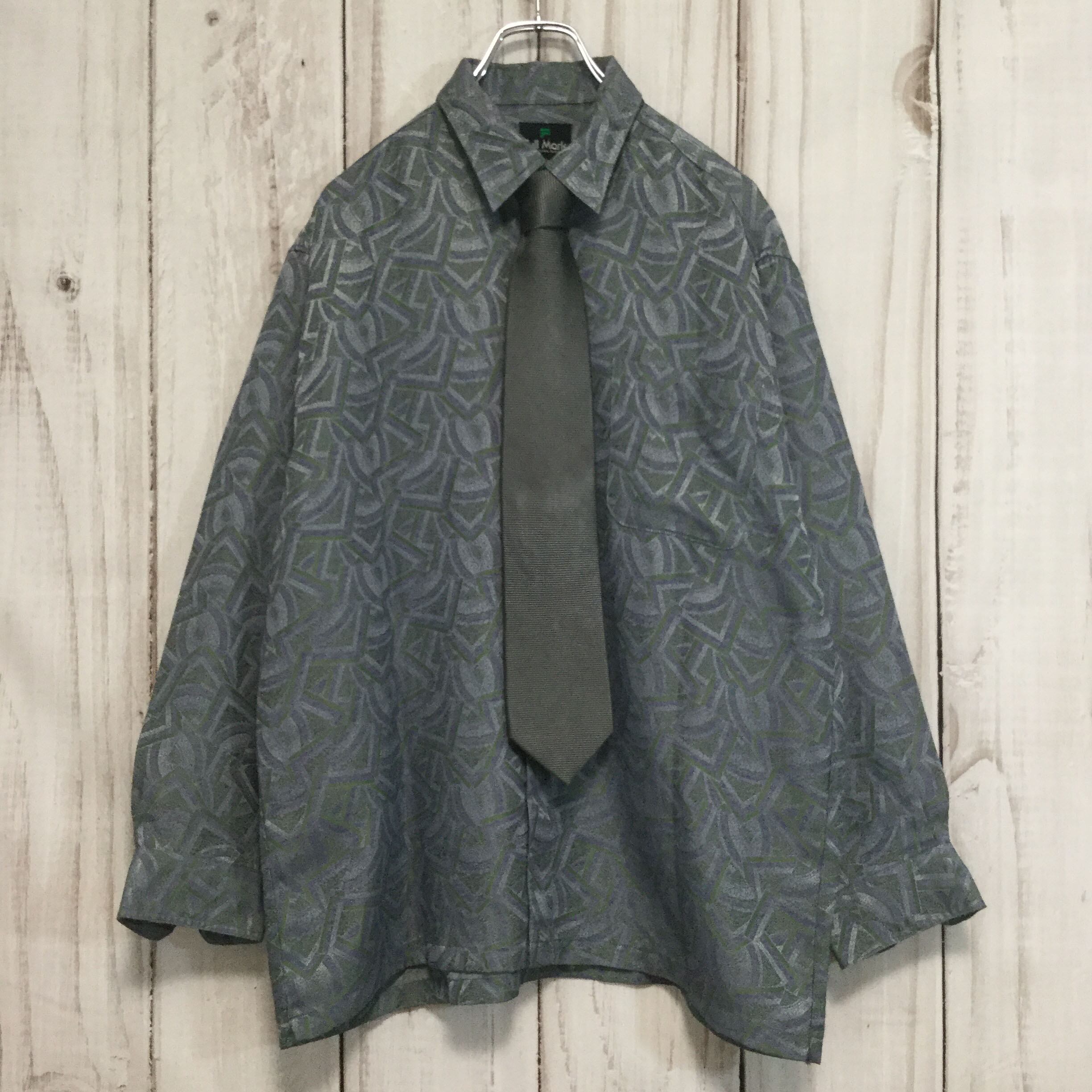 【ネクタイ付長袖シャツ】光沢総柄 ネクタイシャツ L シルバー 古着 [240211-020]