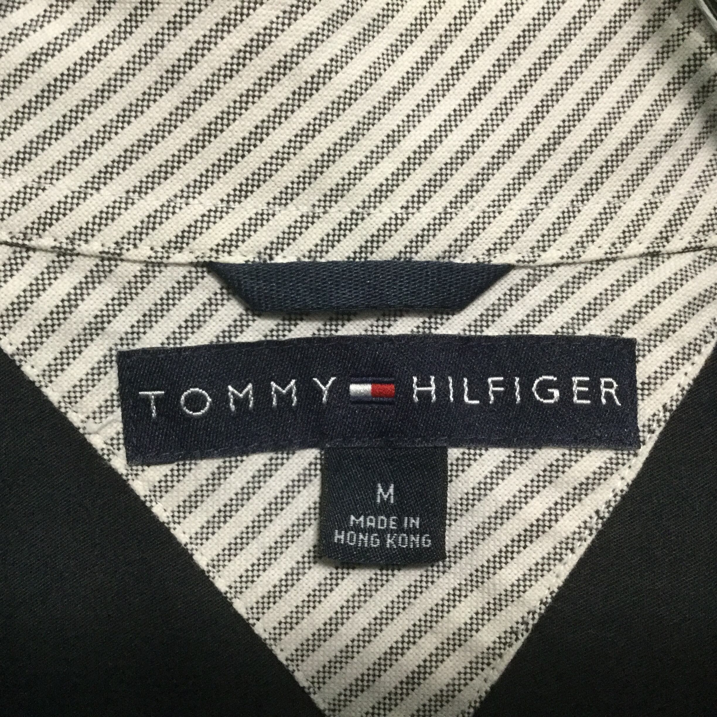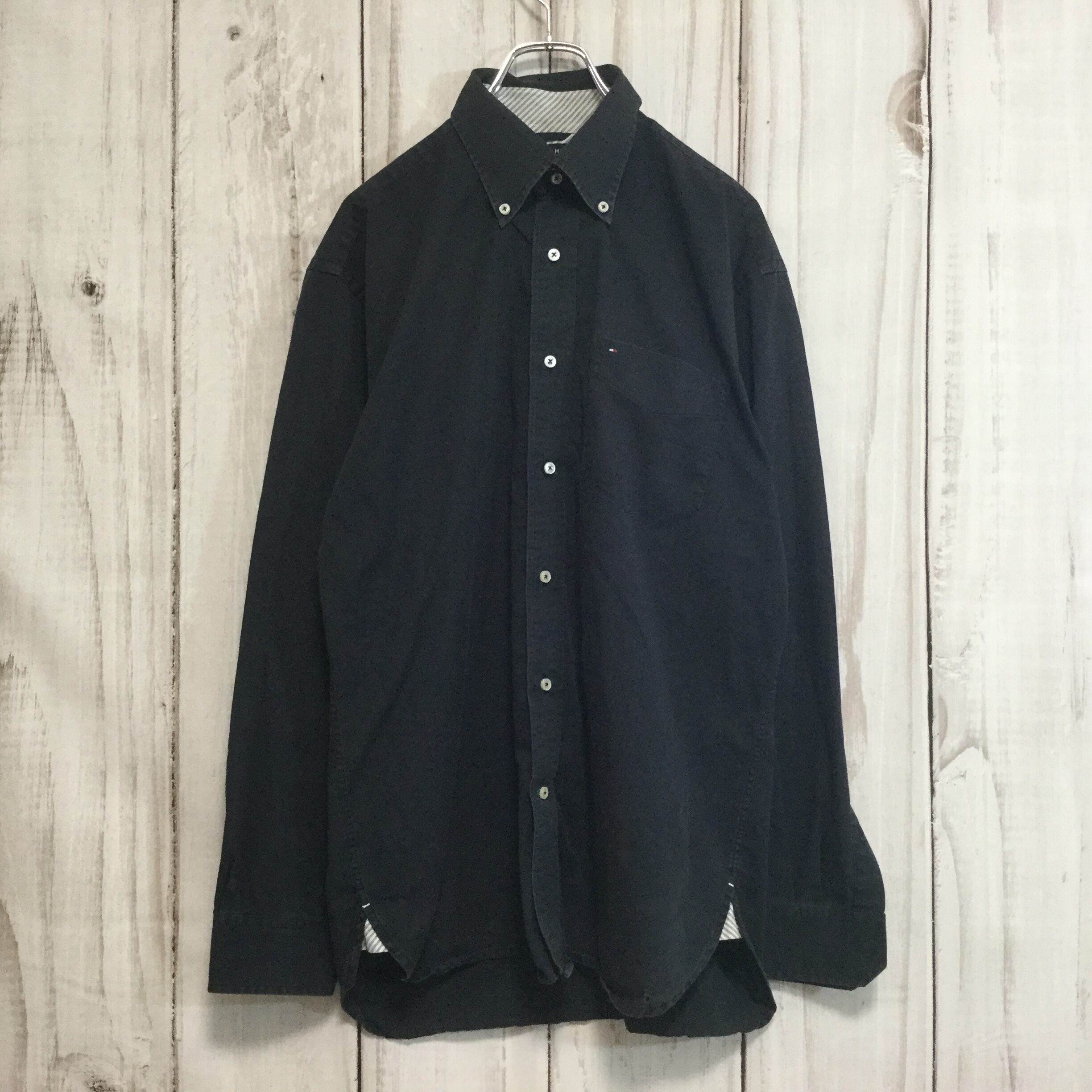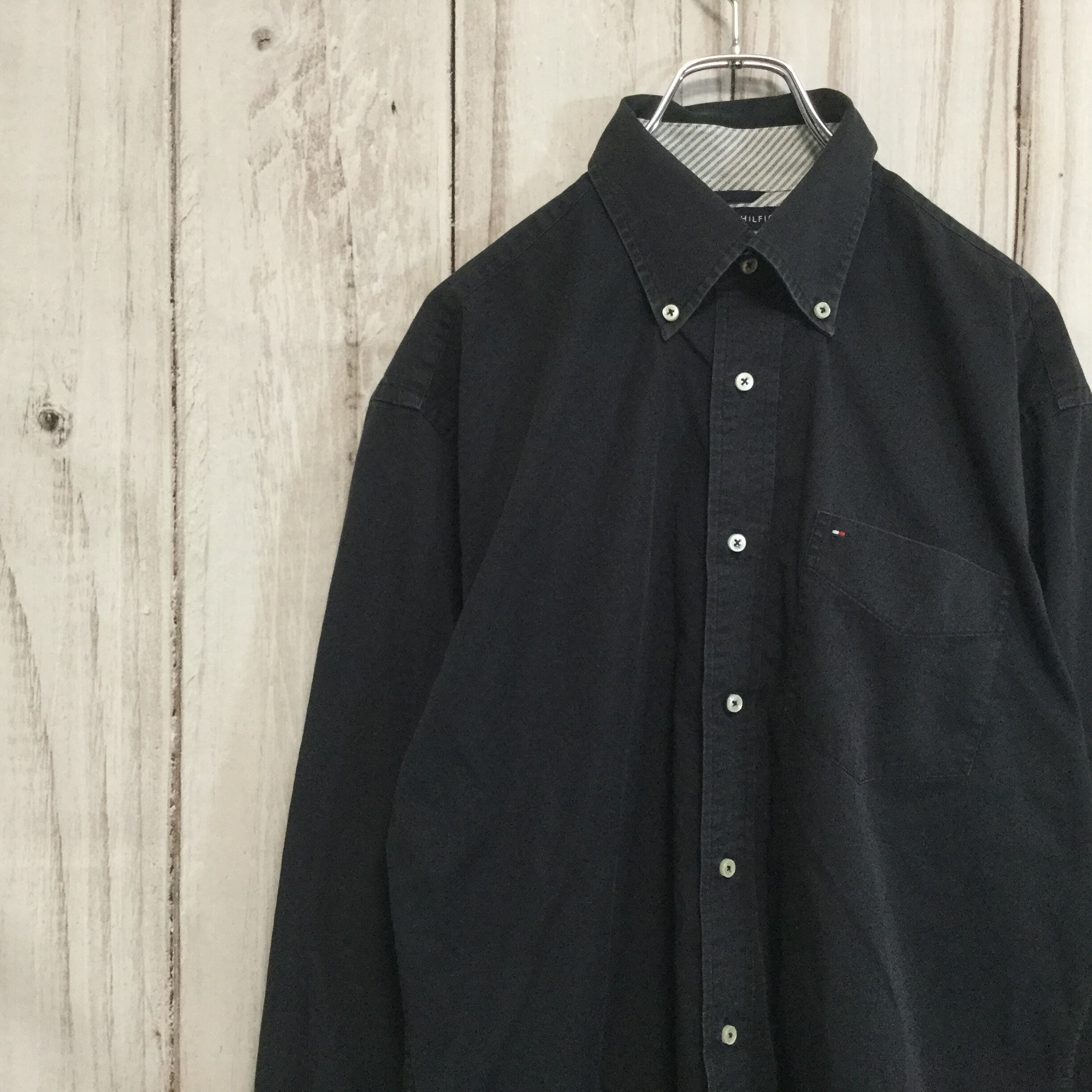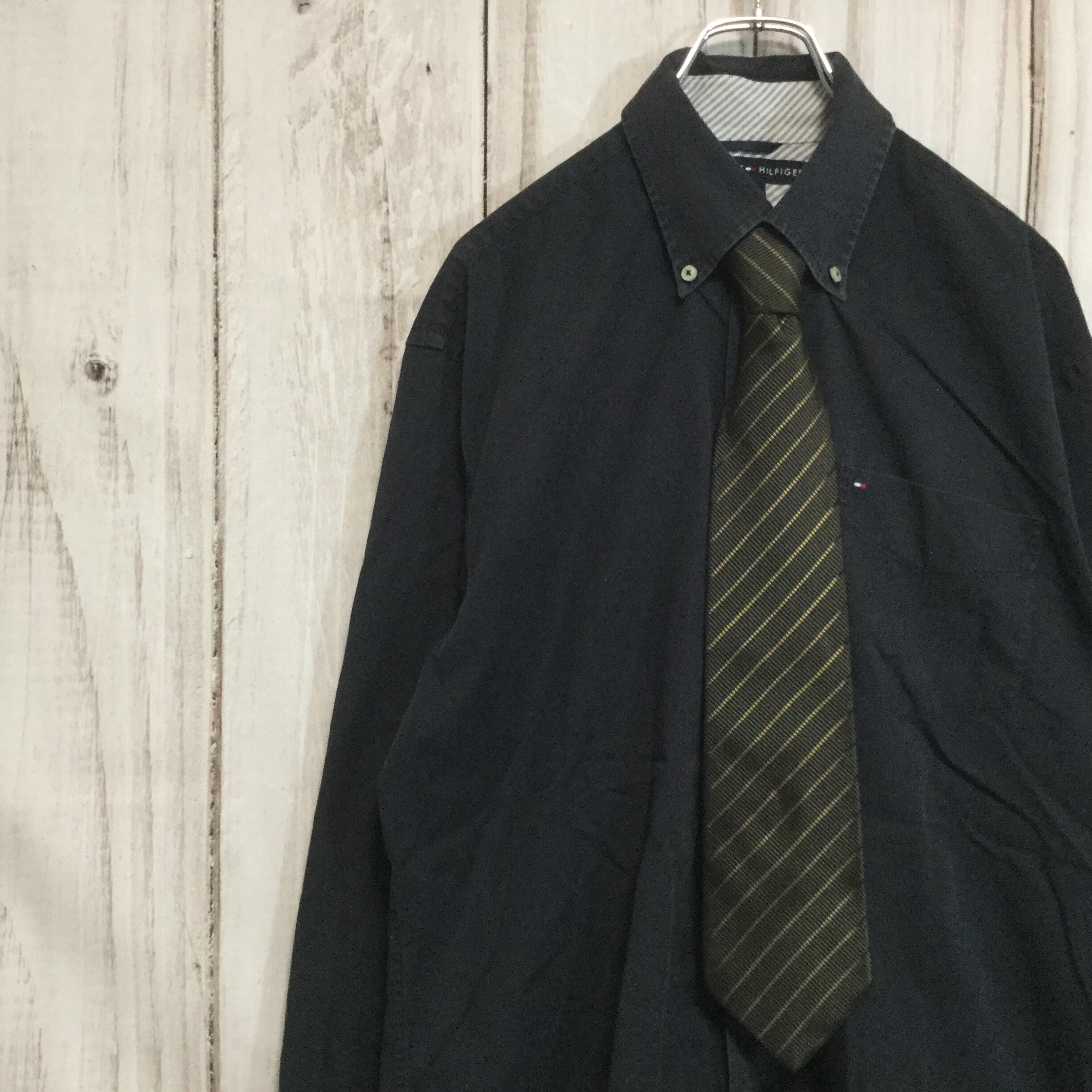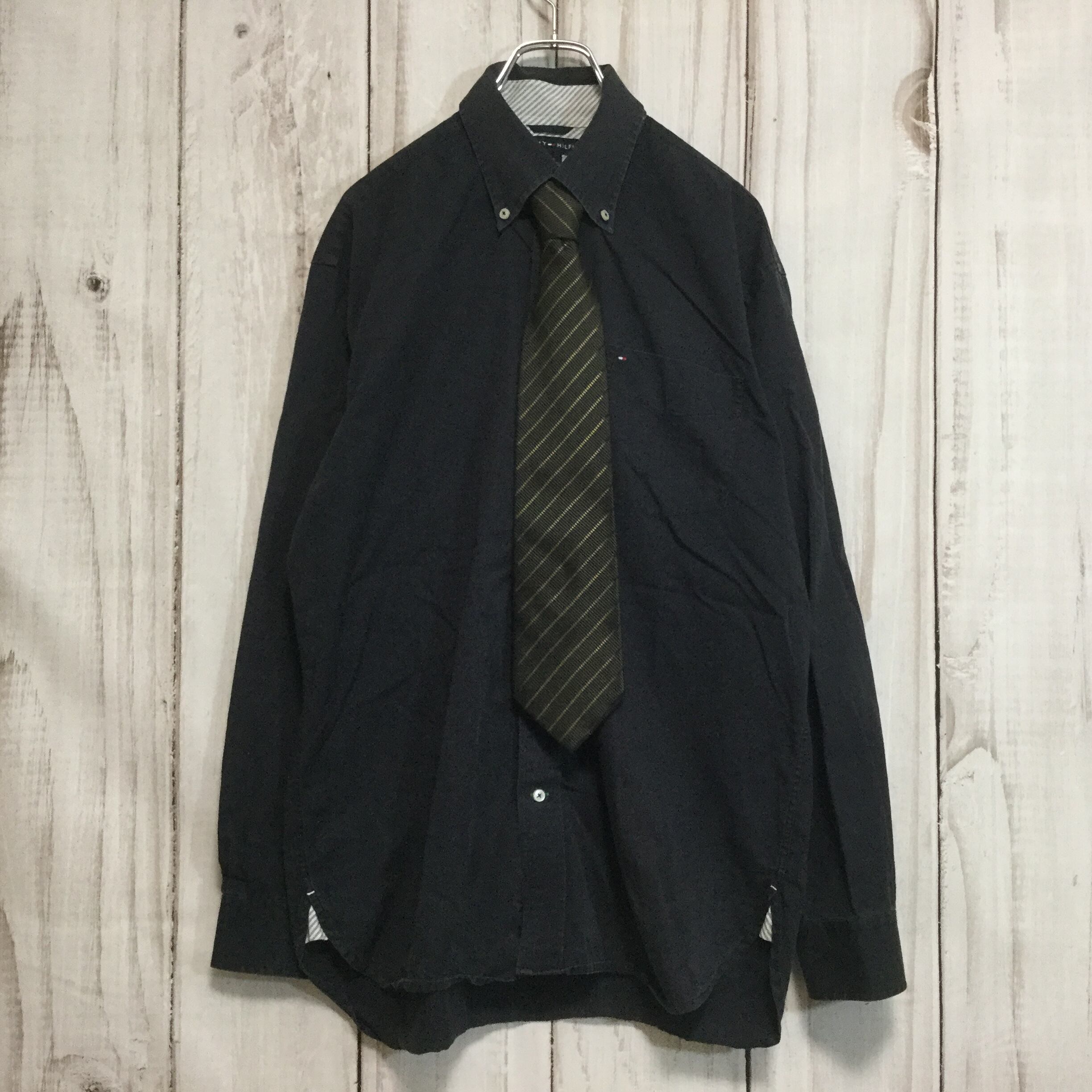 【トミーヒルフィガー ネクタイ付長袖シャツ】ロゴ刺繍 コーデセット L相当 黒 TOMMY HILFIGER 古着 [240220-021]