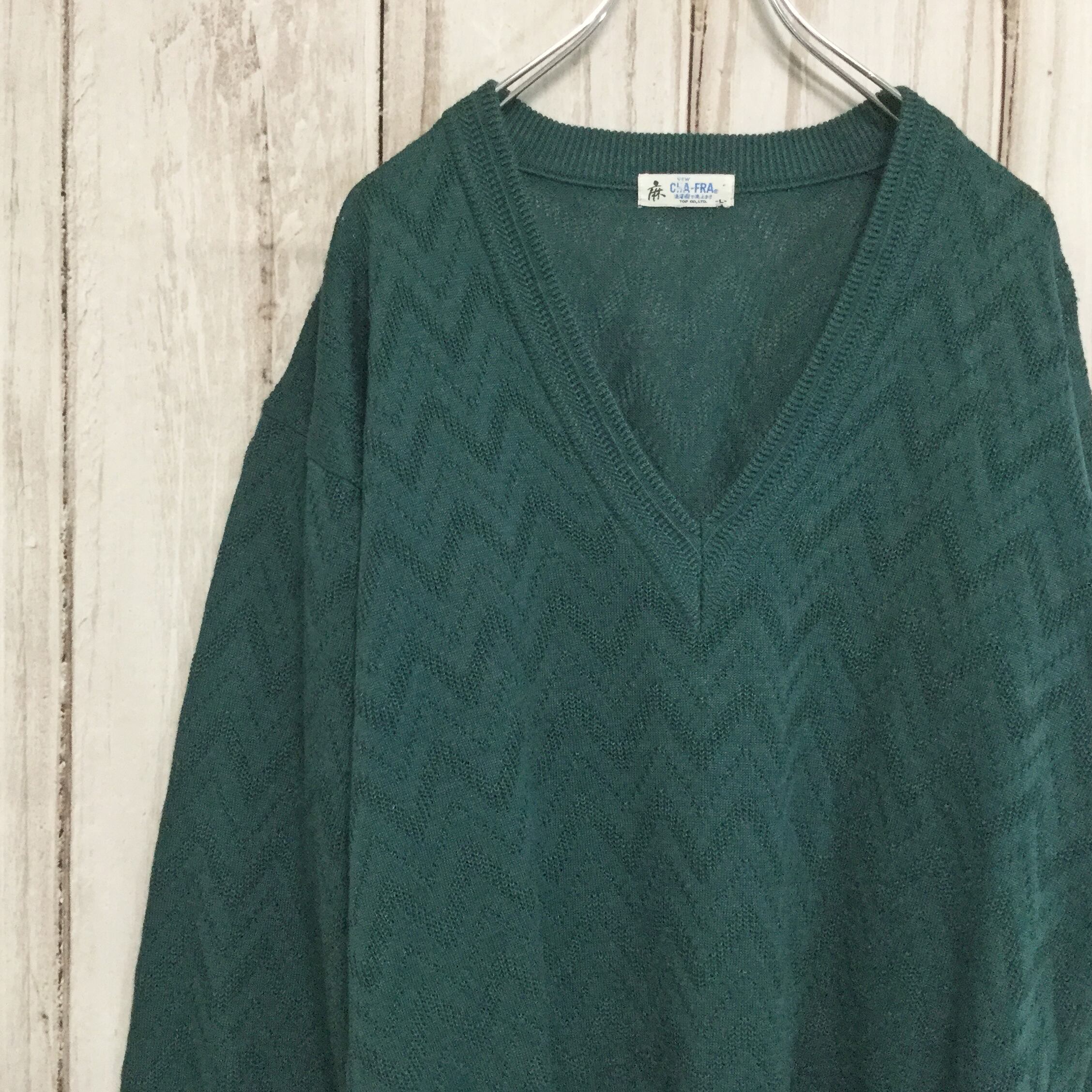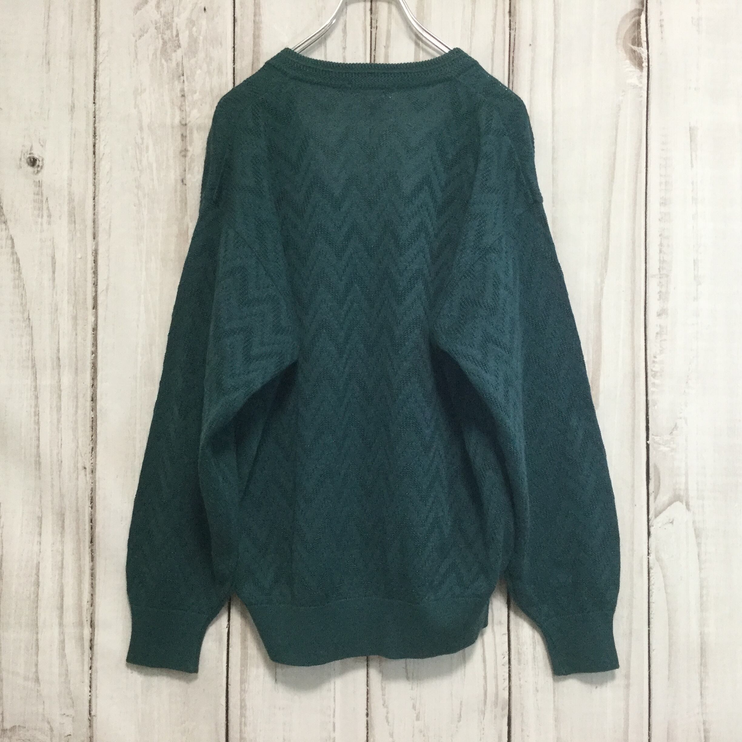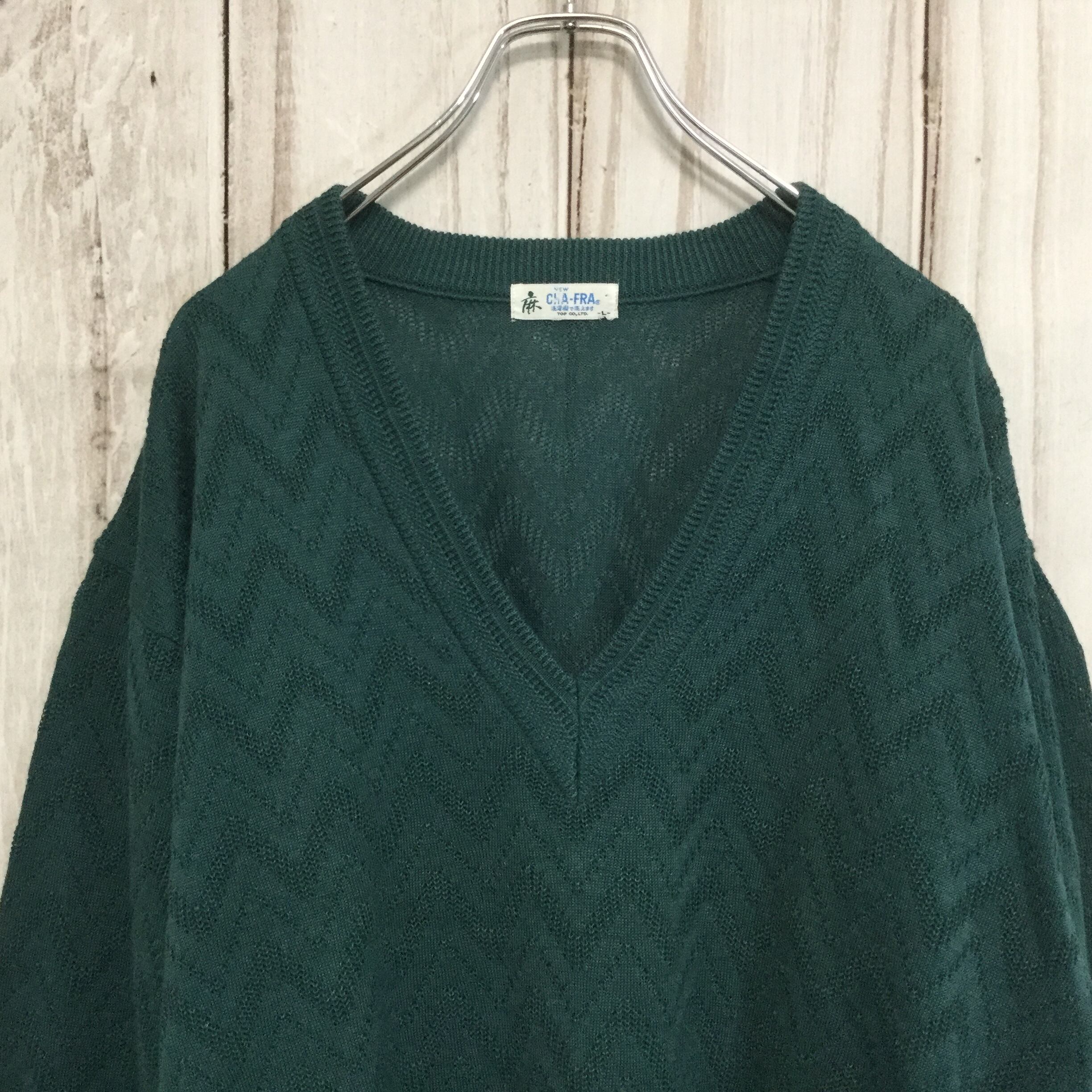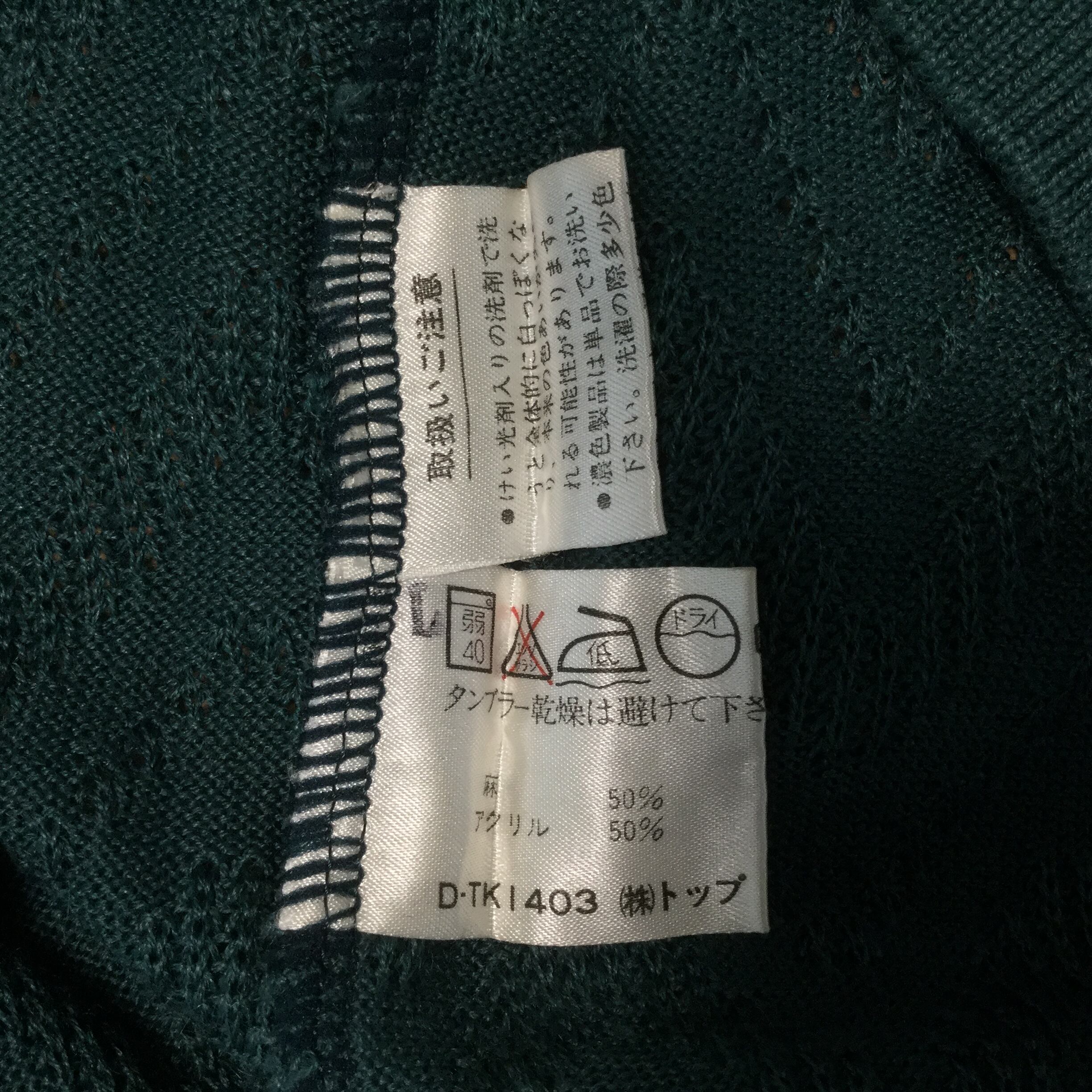 【ニット】ヴィンテージ リネン混 透かし編み セーター L 緑 古着 [240301-027]