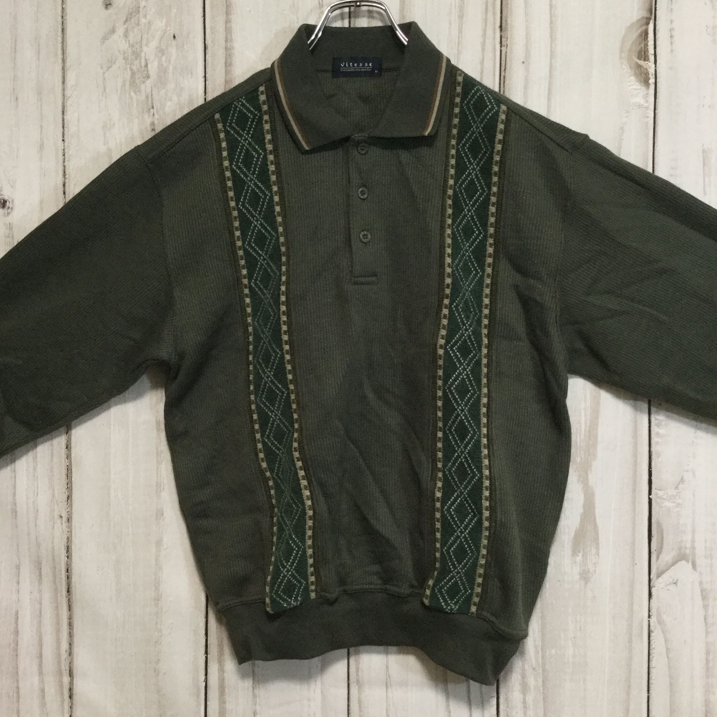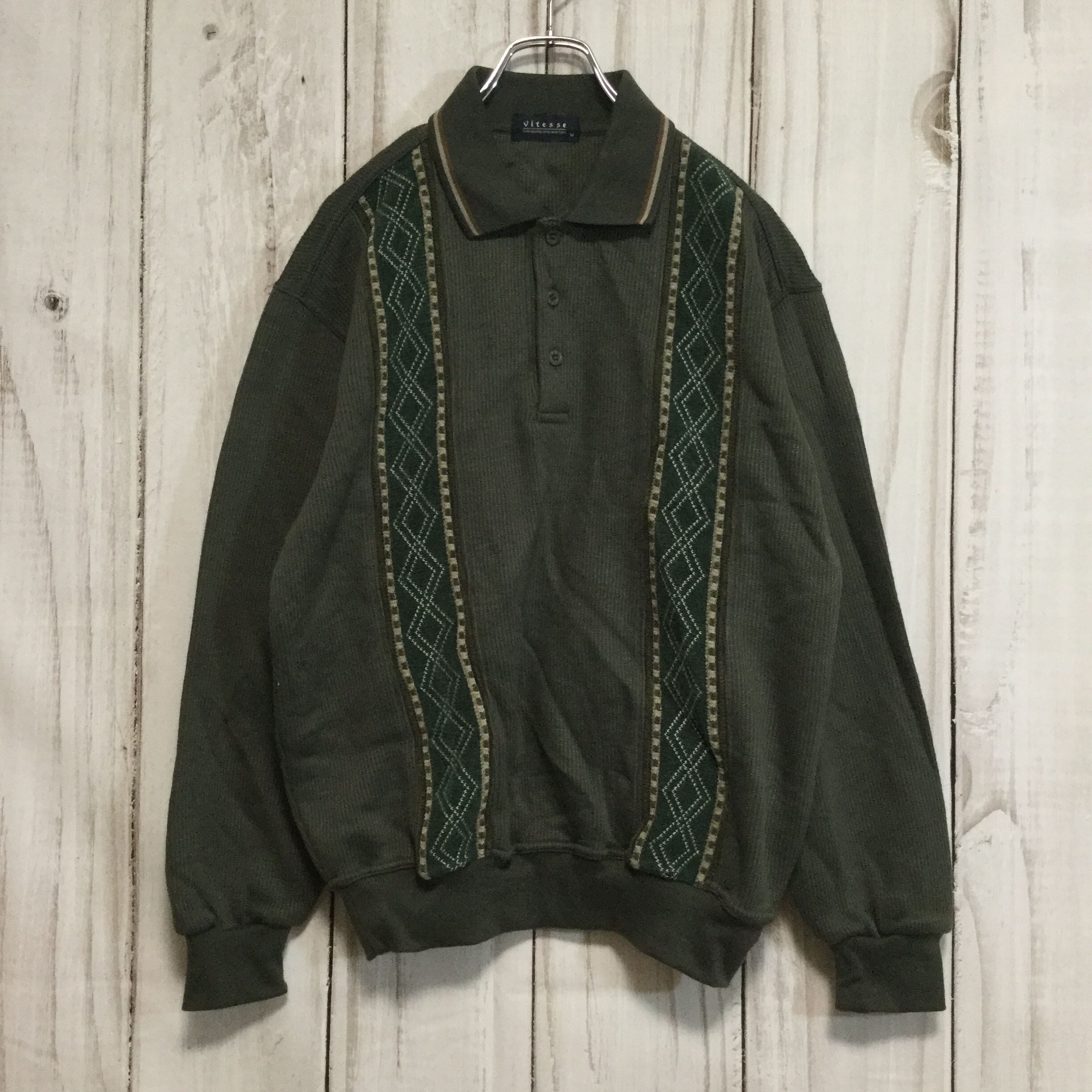 【襟付き アクリルニット】 裏起毛 襟ライン セーター M カーキ 古着 [231203-012]
