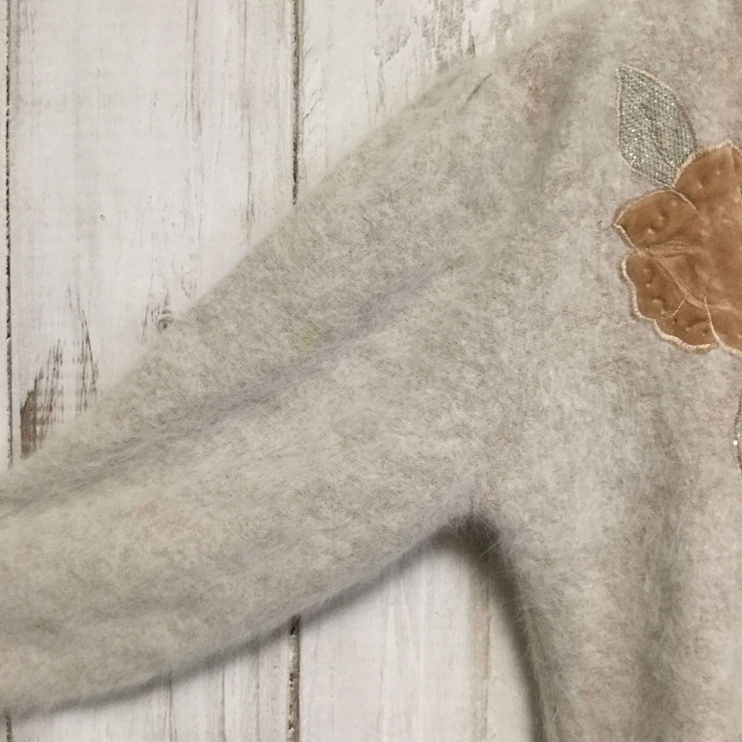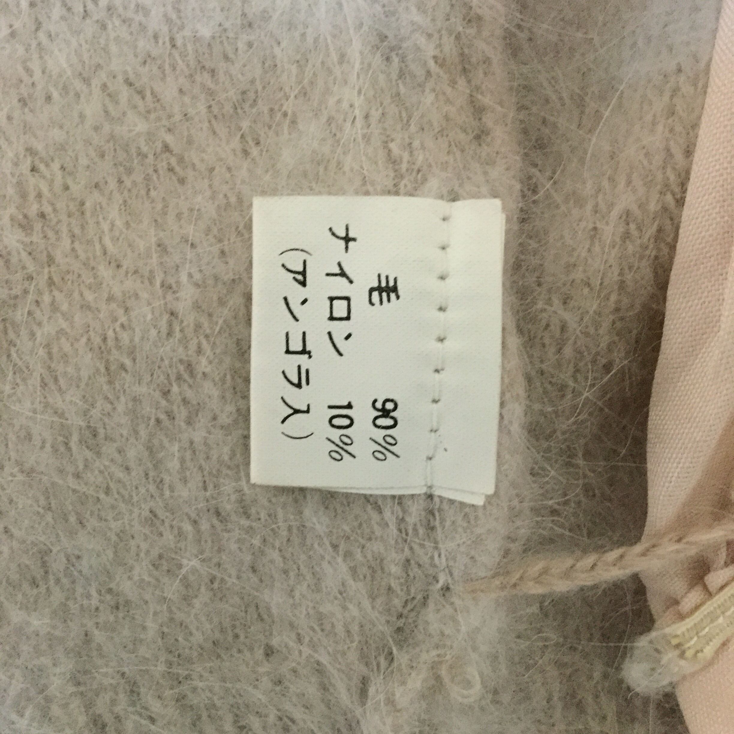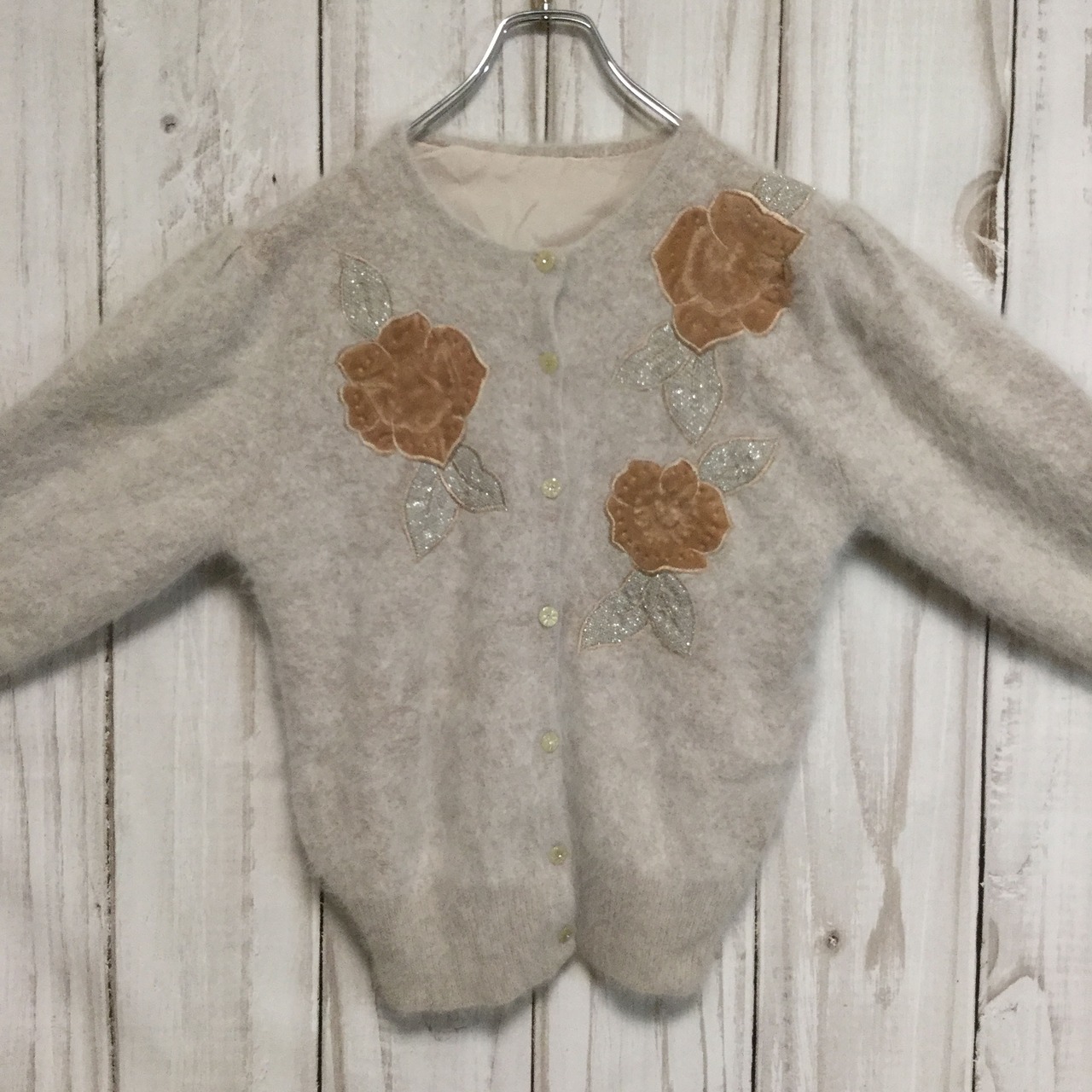 【花デザイン モヘアカーディガン】 ヴィンテージ ふわふわ アンゴラ ニット レトロボタン L相当 ベージュ 古着