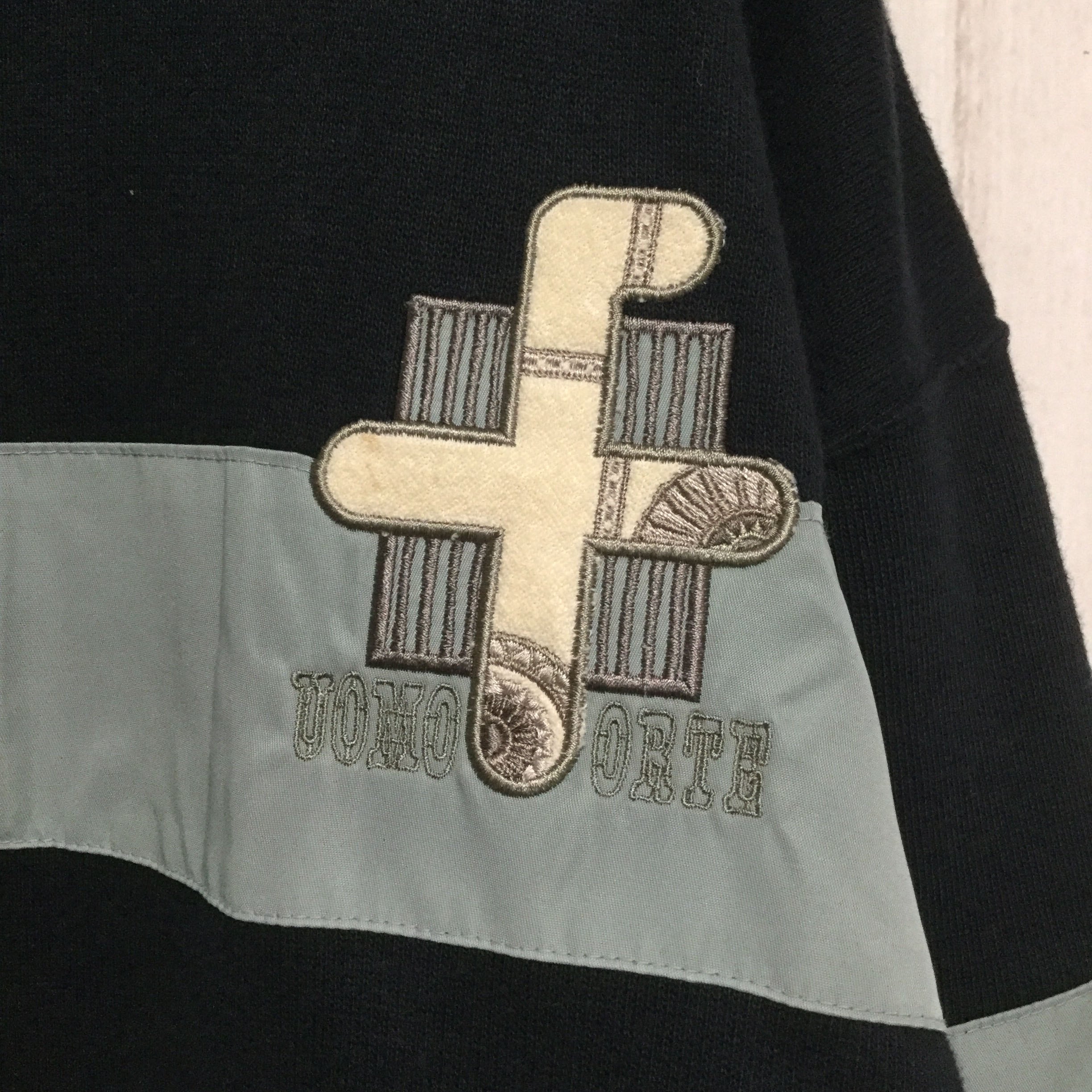 【背面ビッグロゴ刺繍 スウェット】 美品 レトロ 切り替え M 黒 古着 [231203-028]