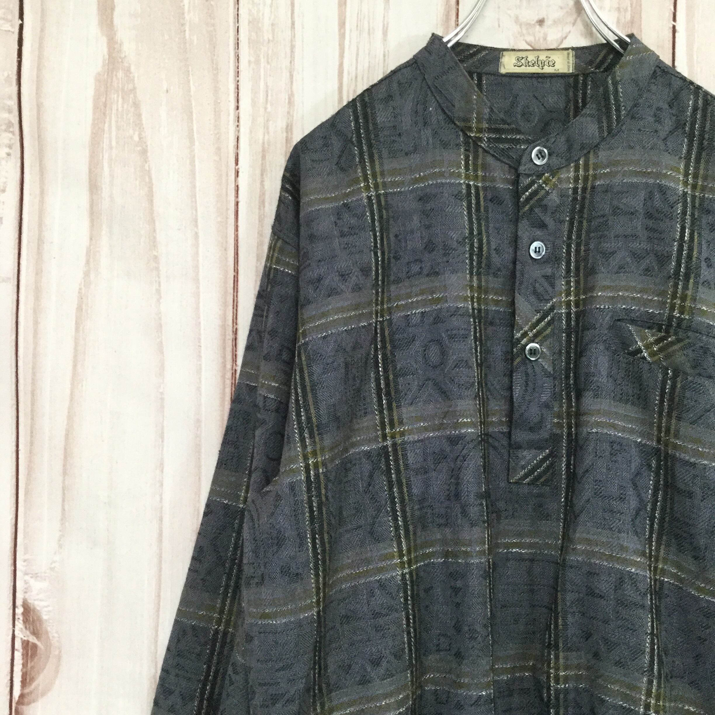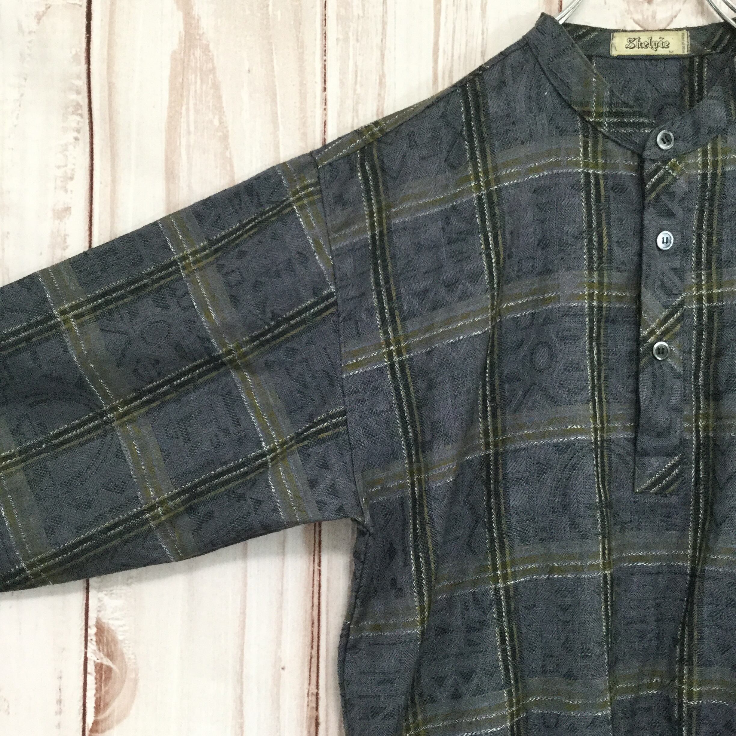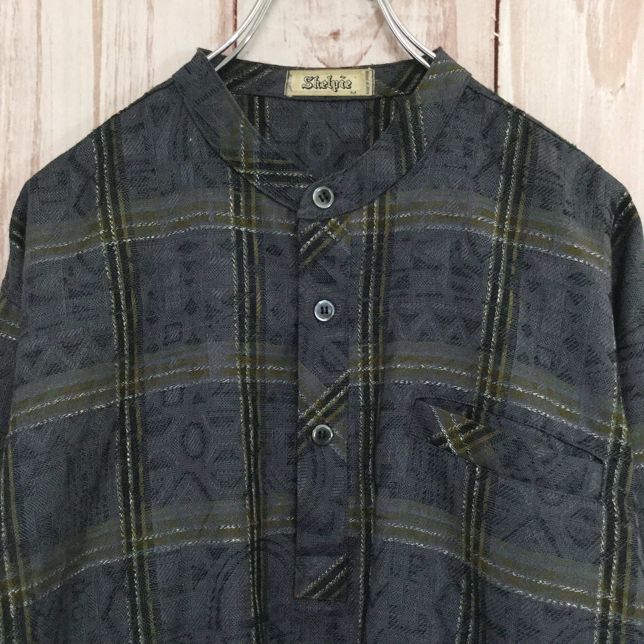 【ヴィンテージ 長袖シャツ】昭和レトロ ゴブラン織り バンドカラー ダークカラー M VINTAGE 古着 [220829-011]