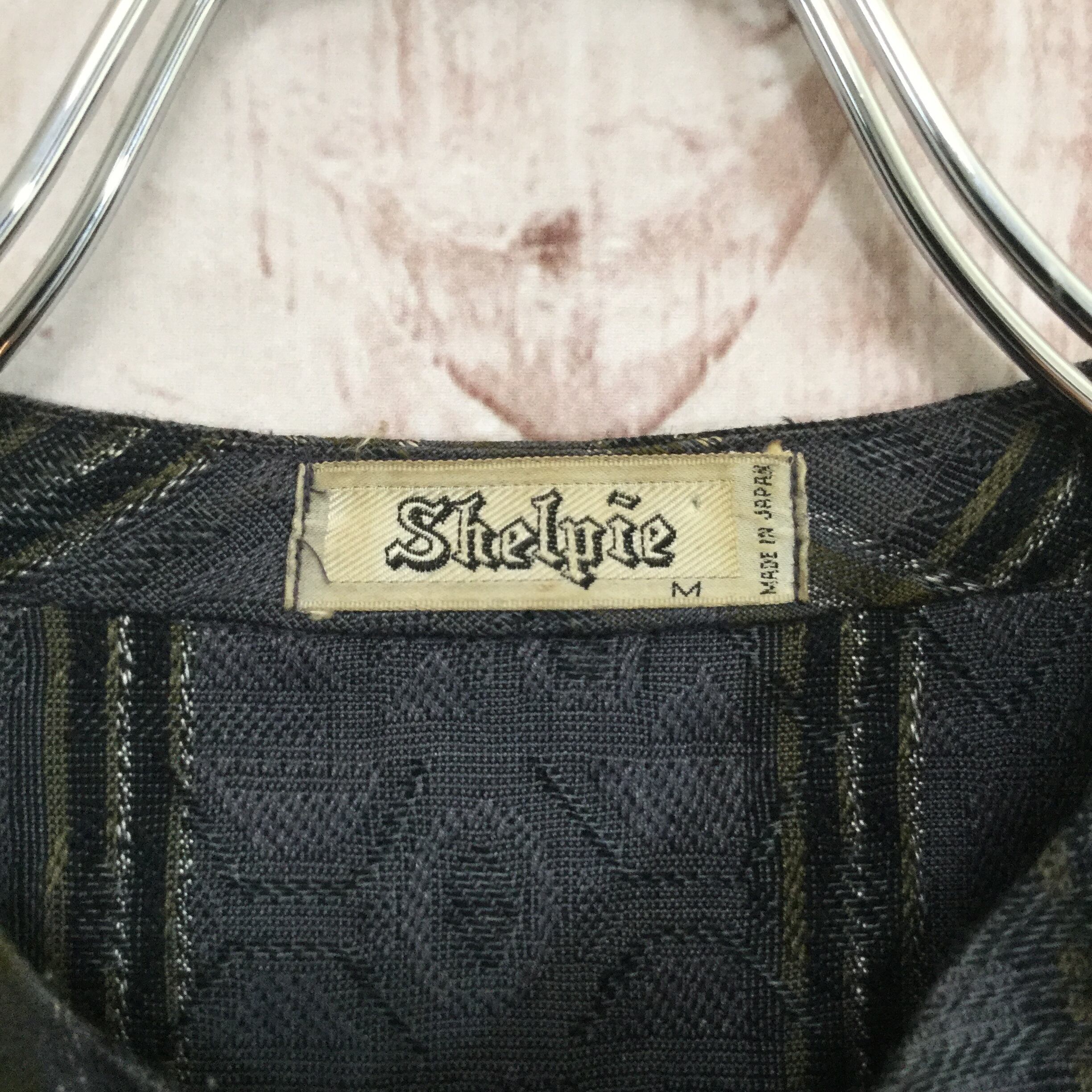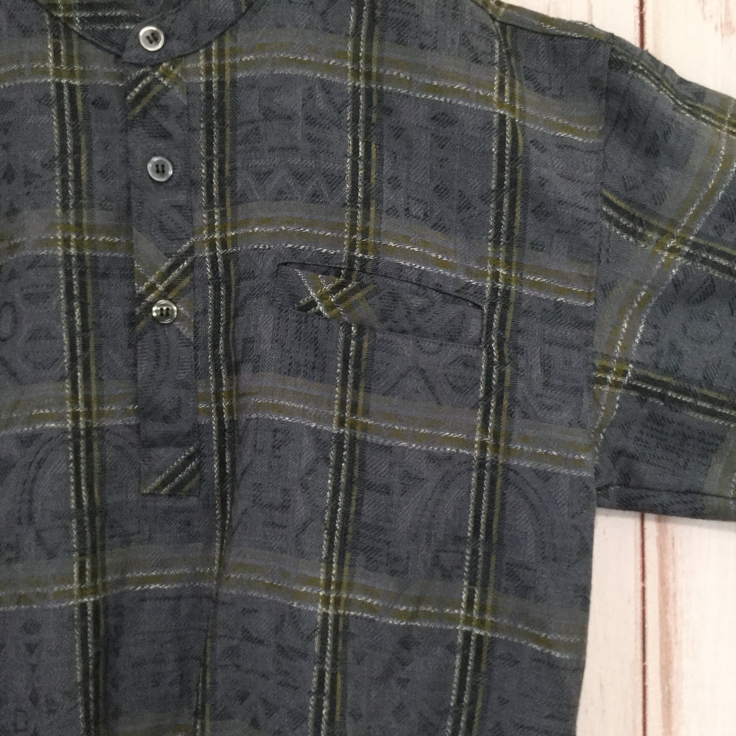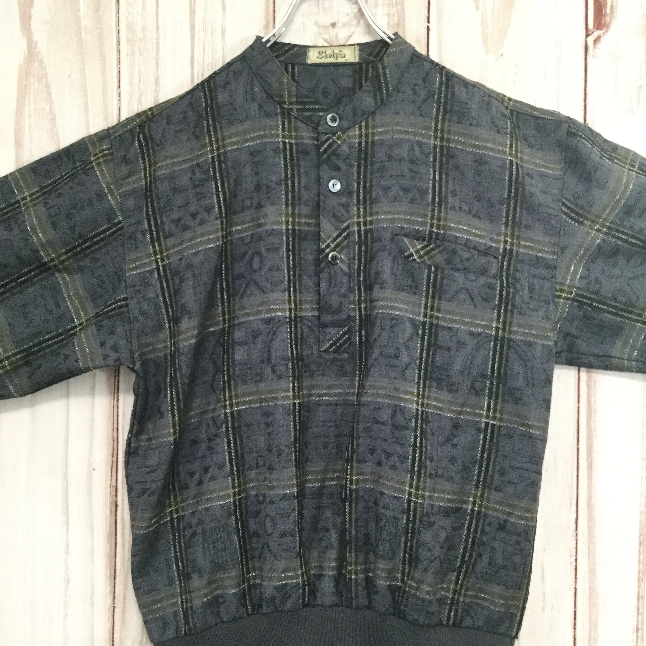 【ヴィンテージ 長袖シャツ】昭和レトロ ゴブラン織り バンドカラー ダークカラー M VINTAGE 古着 [220829-011]