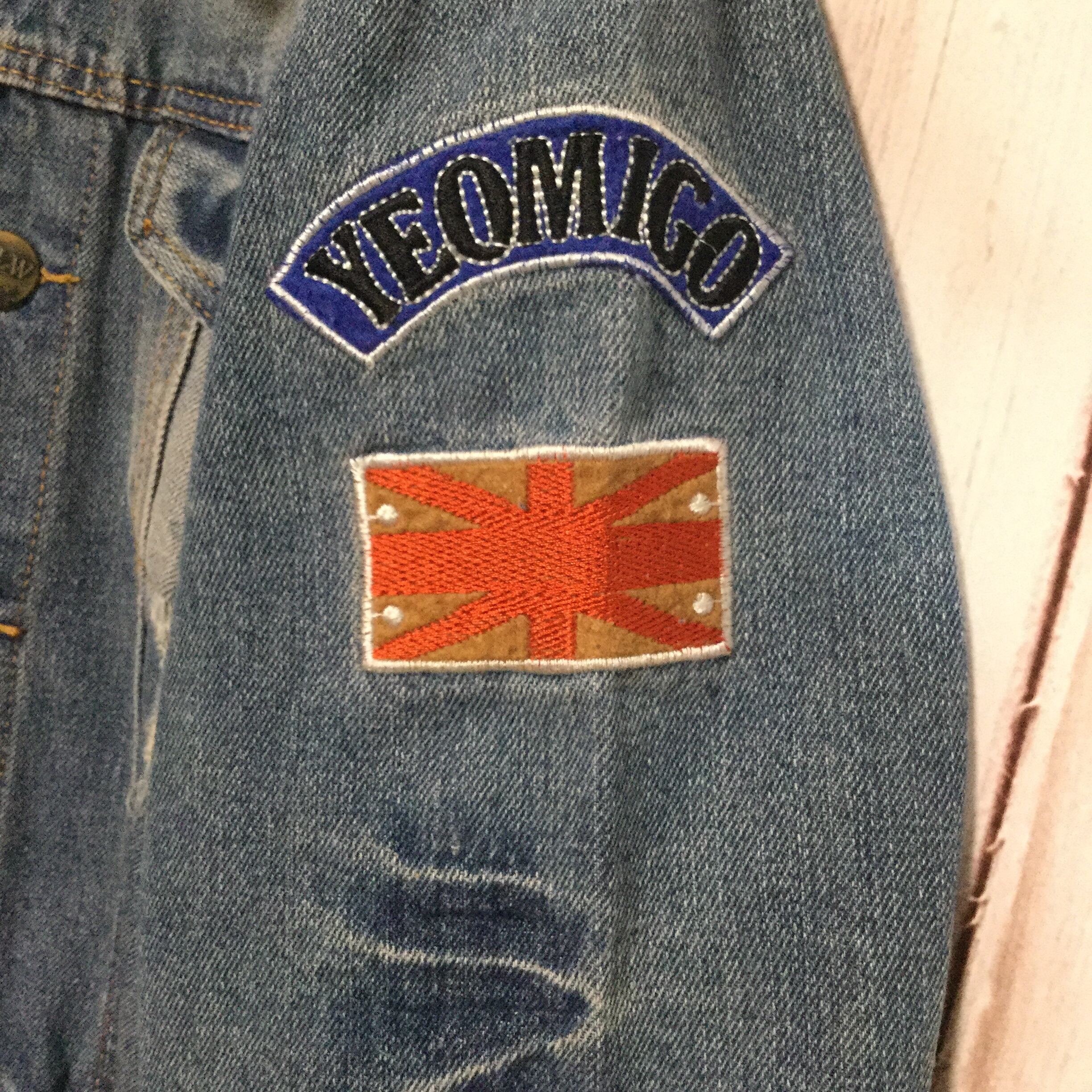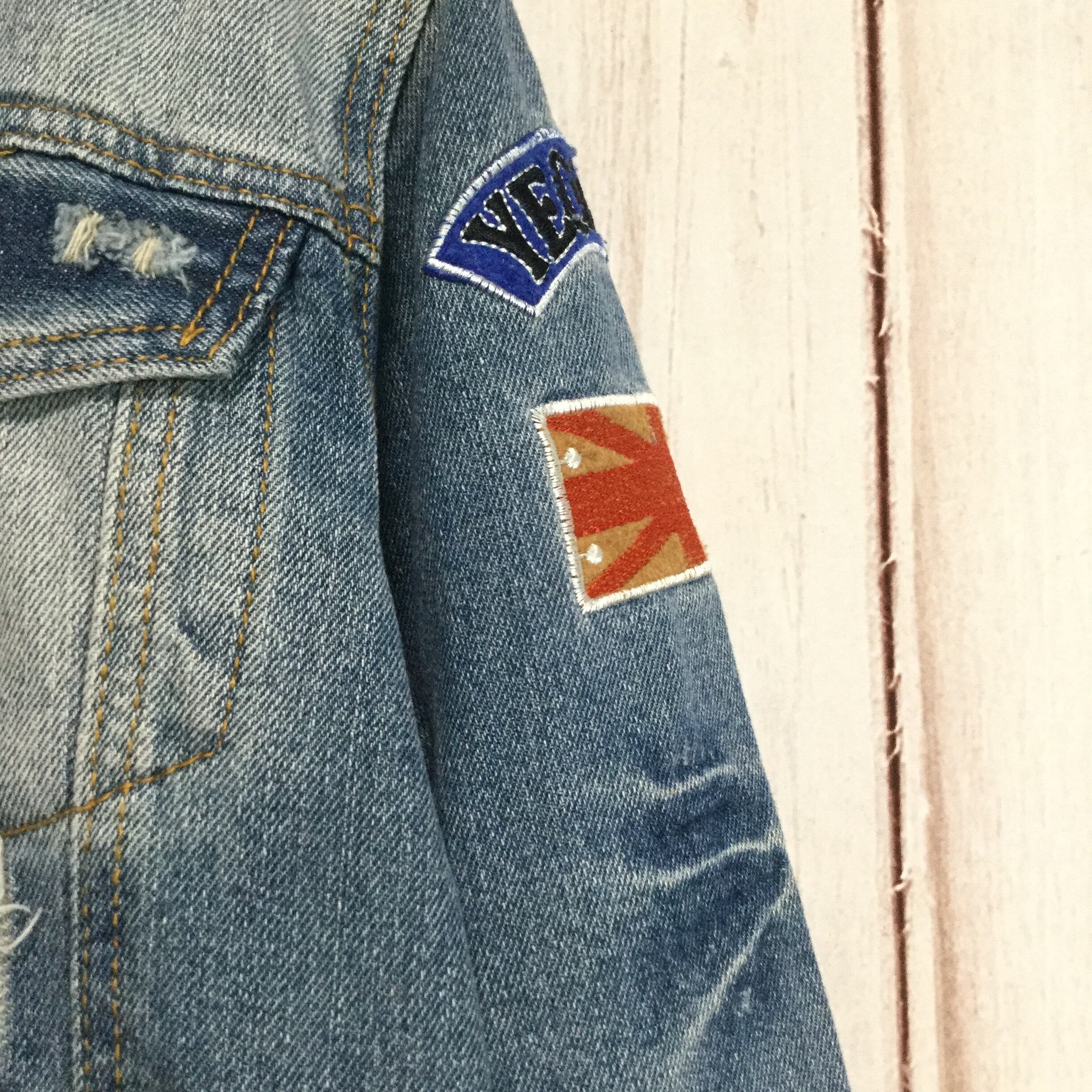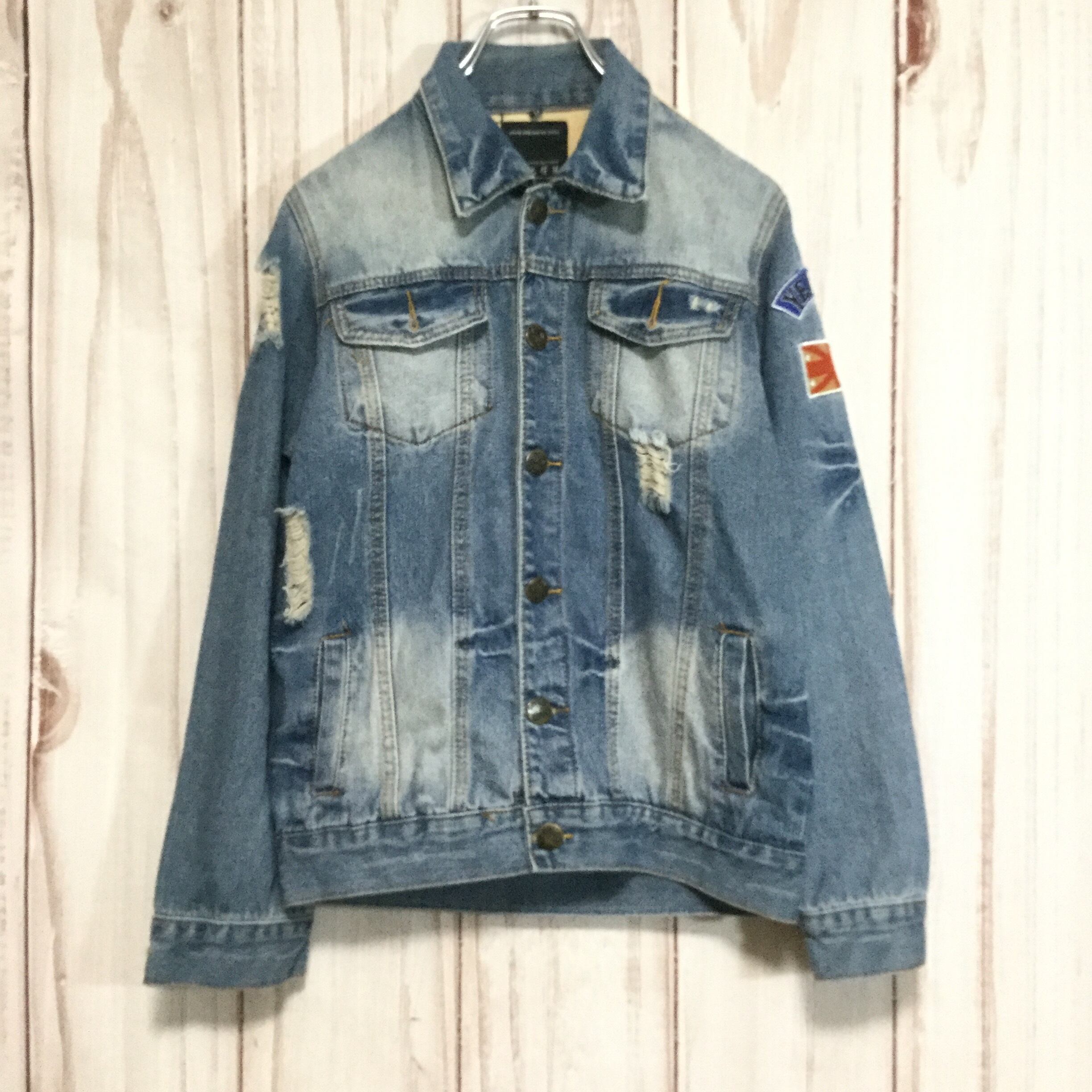 【デニムジャケット】 ワッペン ダメージ加工 切り替え M 青 古着