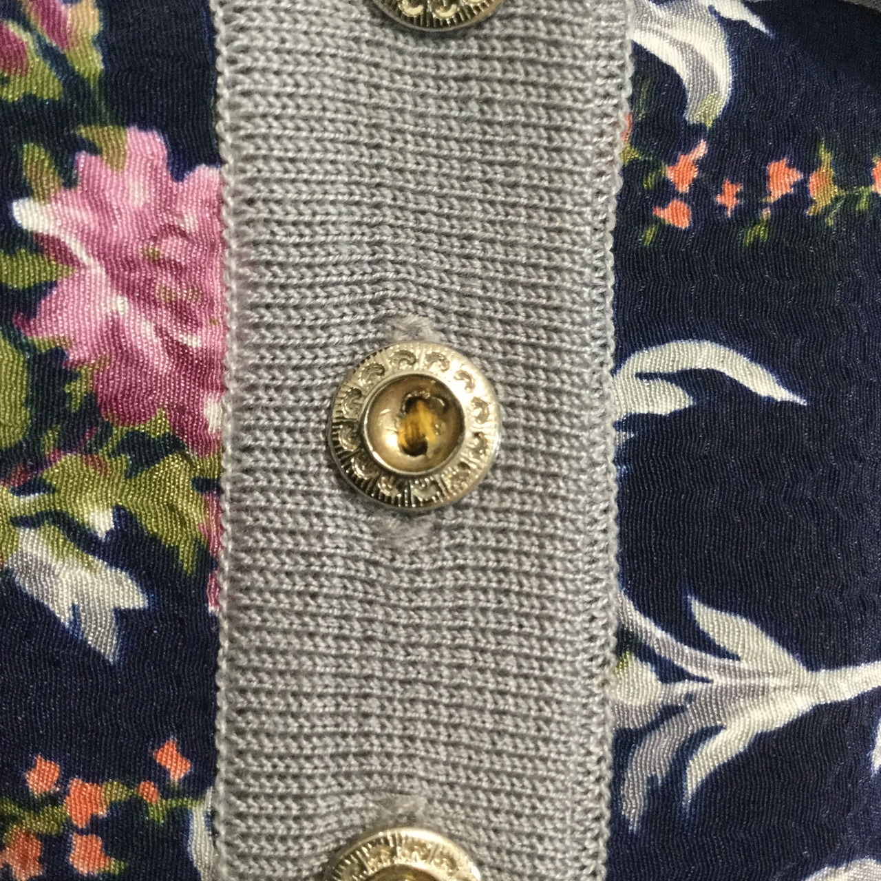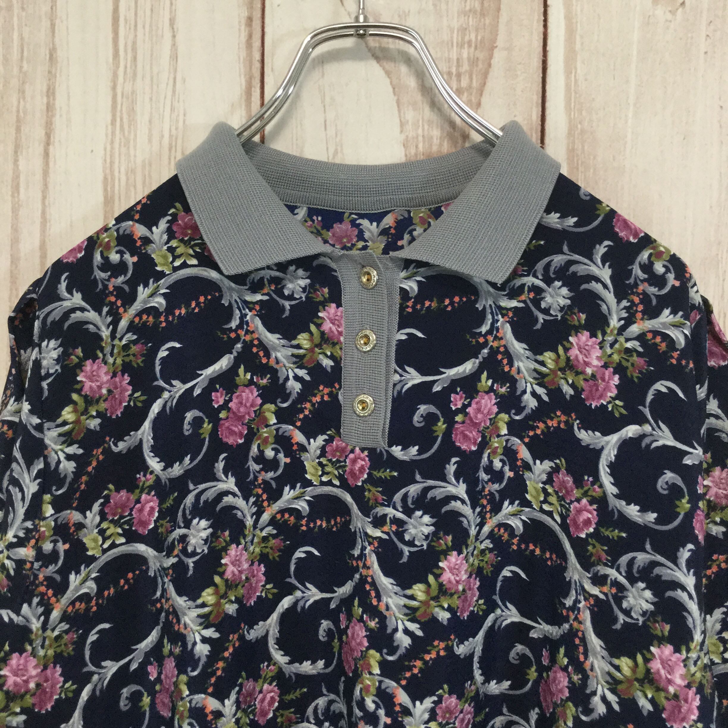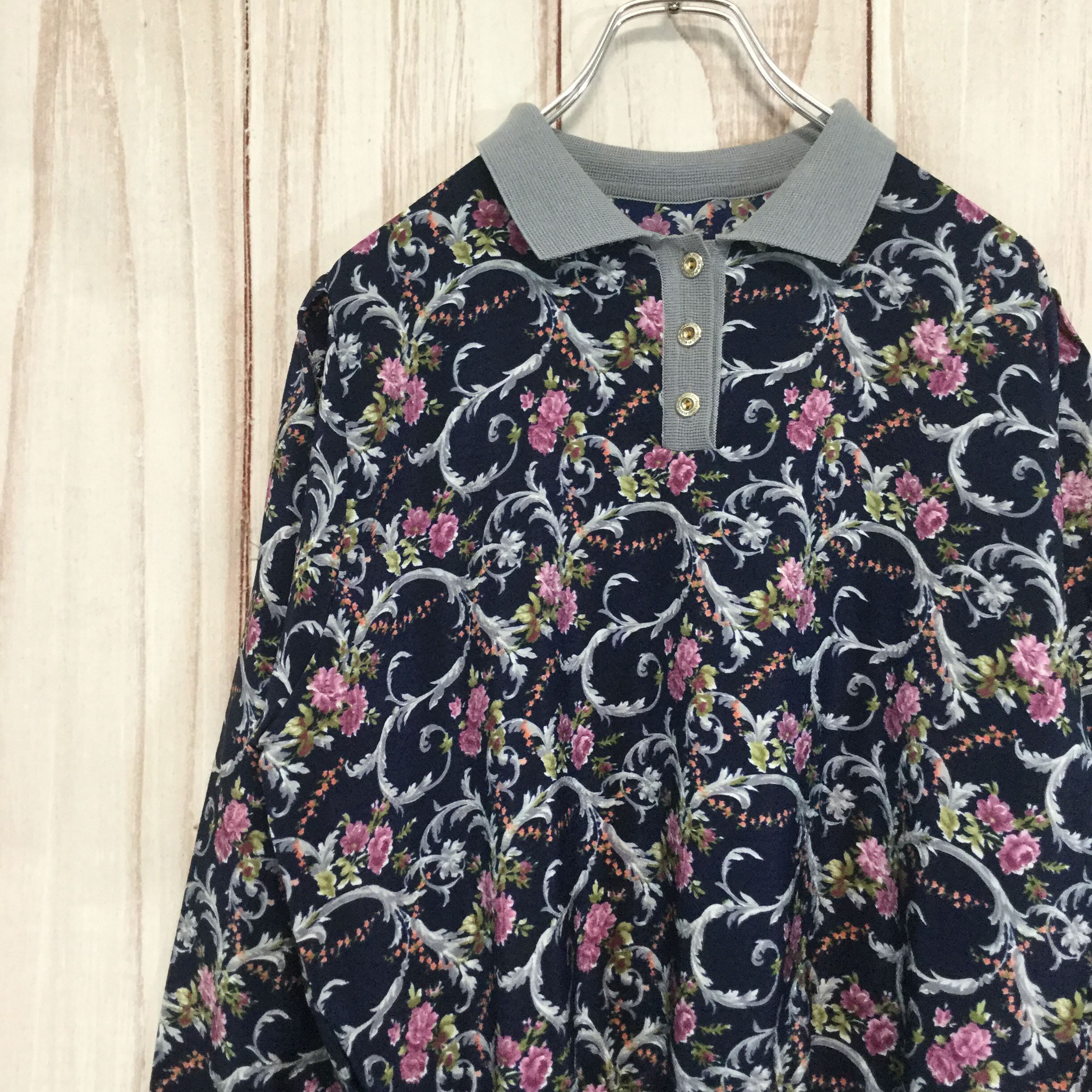 【レトロ 長袖ポロシャツ】花柄 リブ襟 M相当 ネイビー 古着 [231022-010]