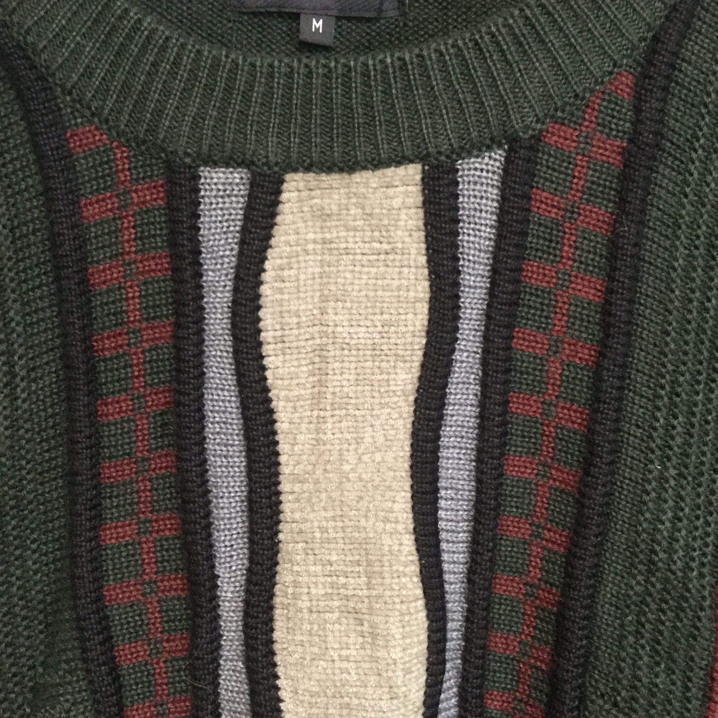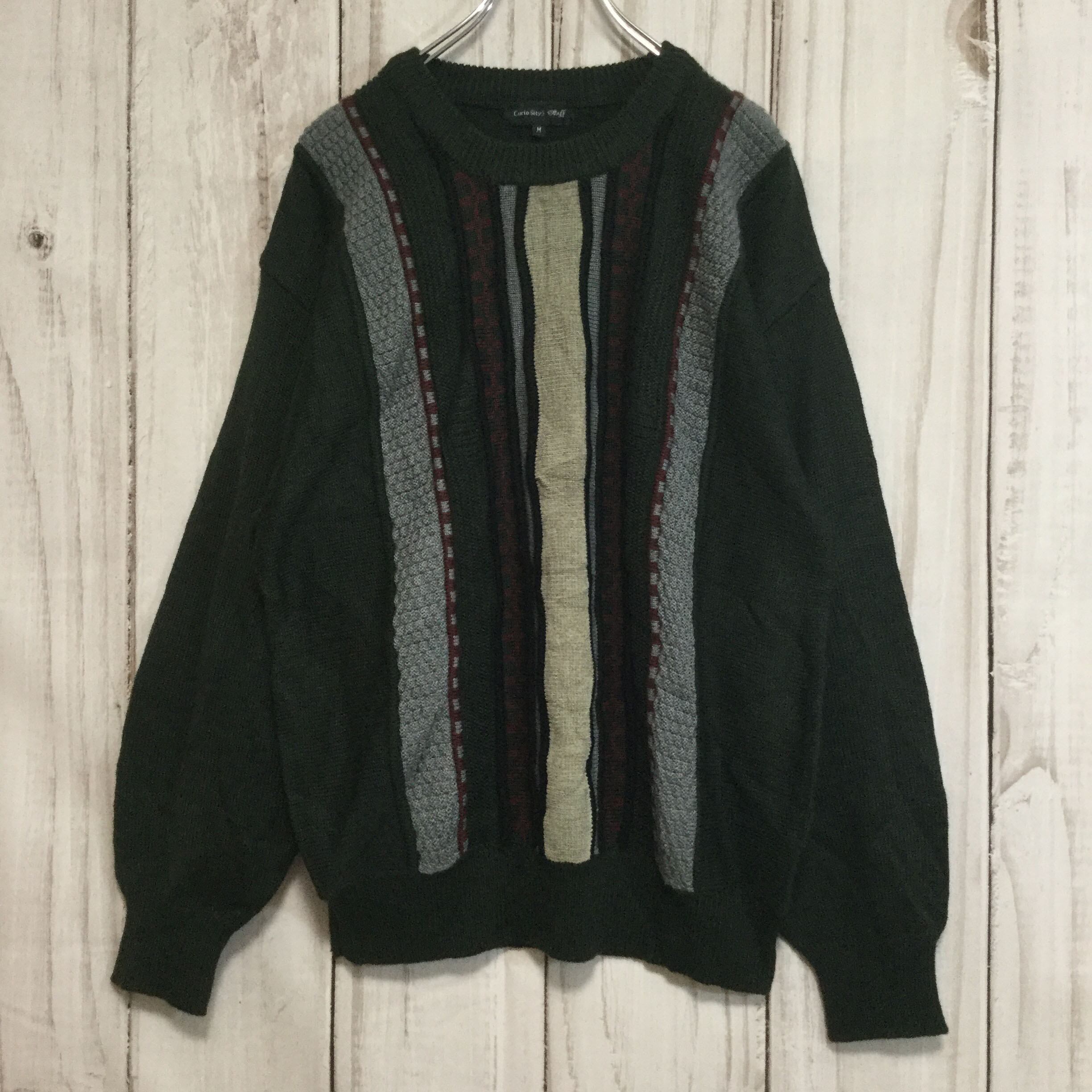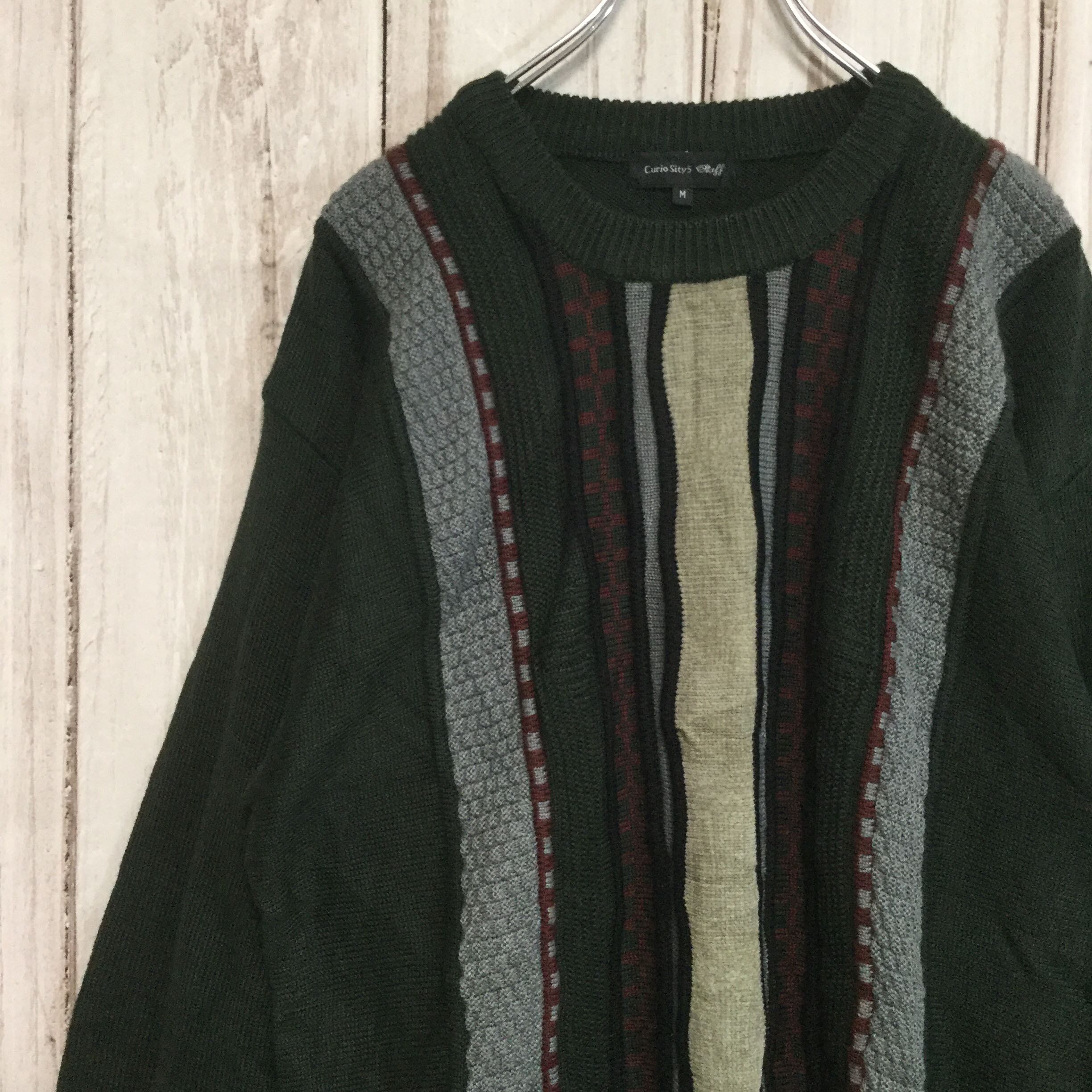 【ストライプ 3Dニット】美品 ダークカラー セーター M 緑 古着 [240126-016]