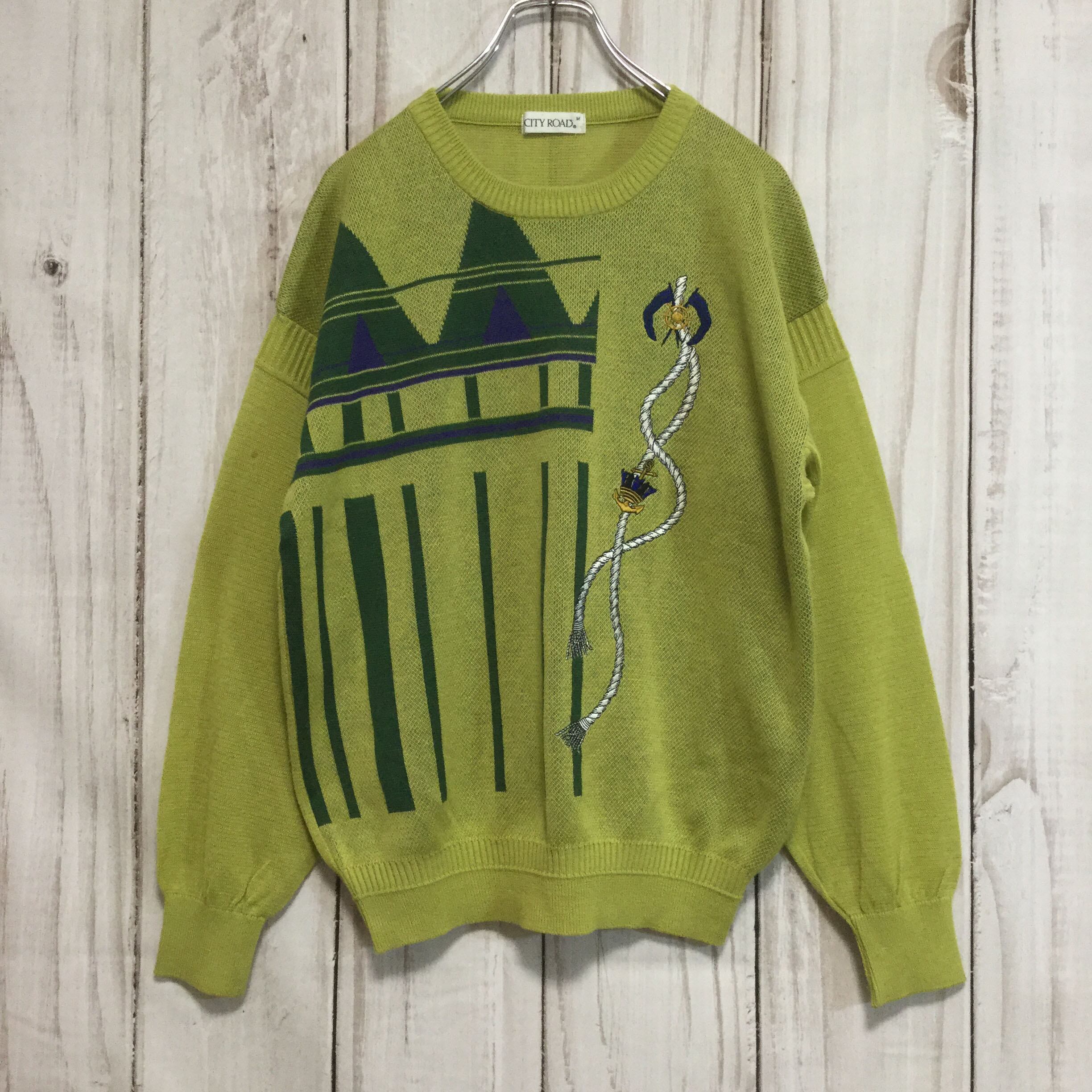 【刺繍入りニット】麻混 アシンメトリー セーター M 黄緑 古着 [240126-018]