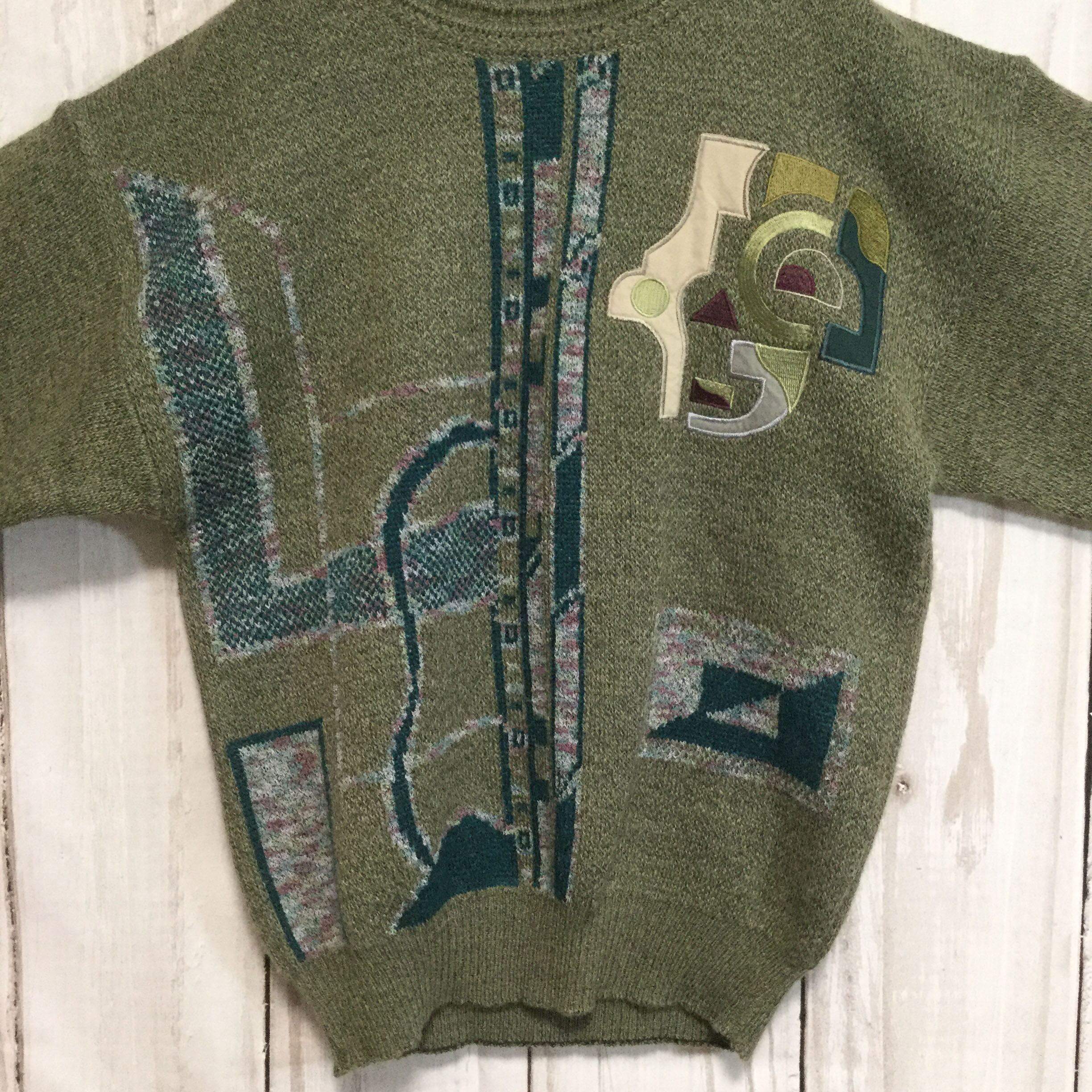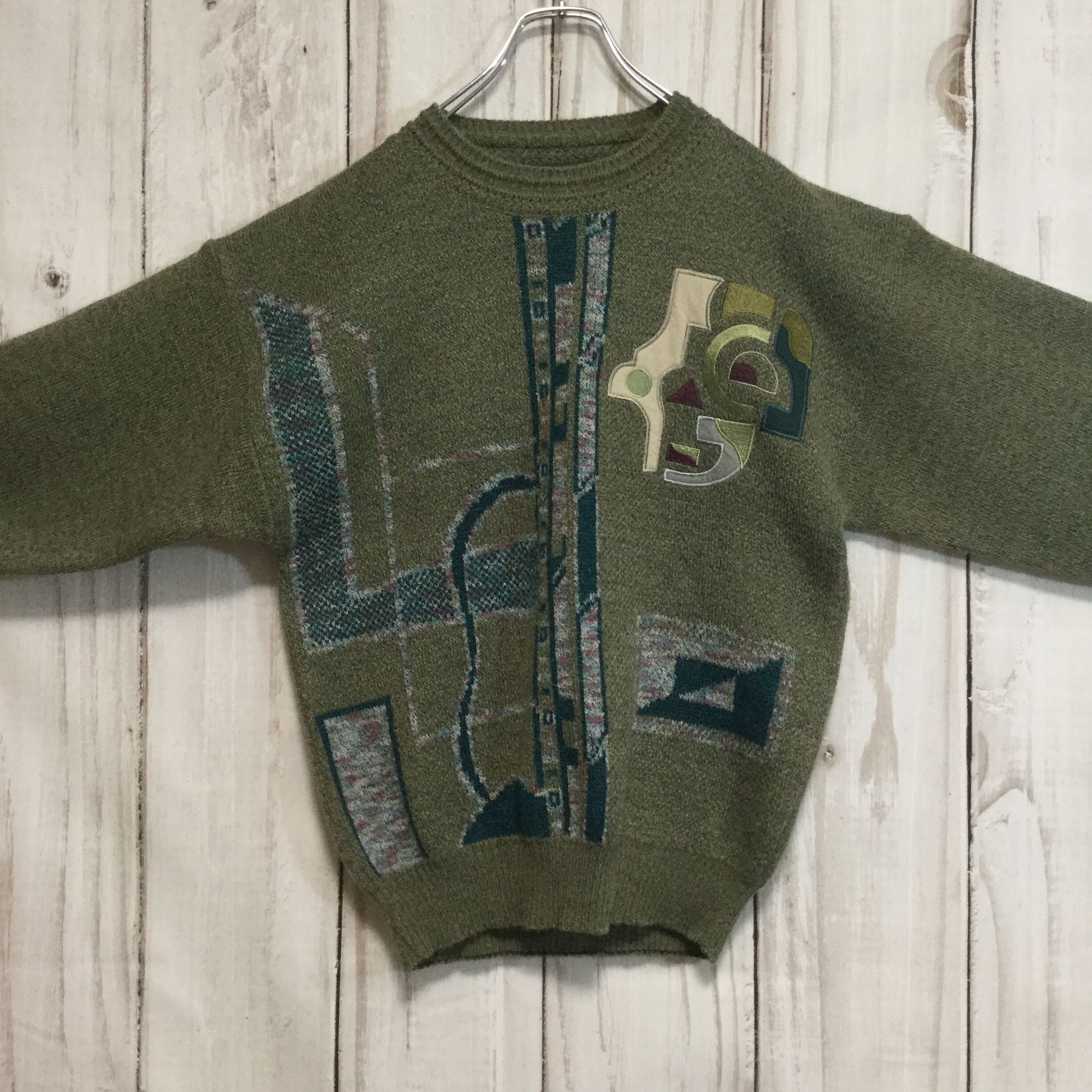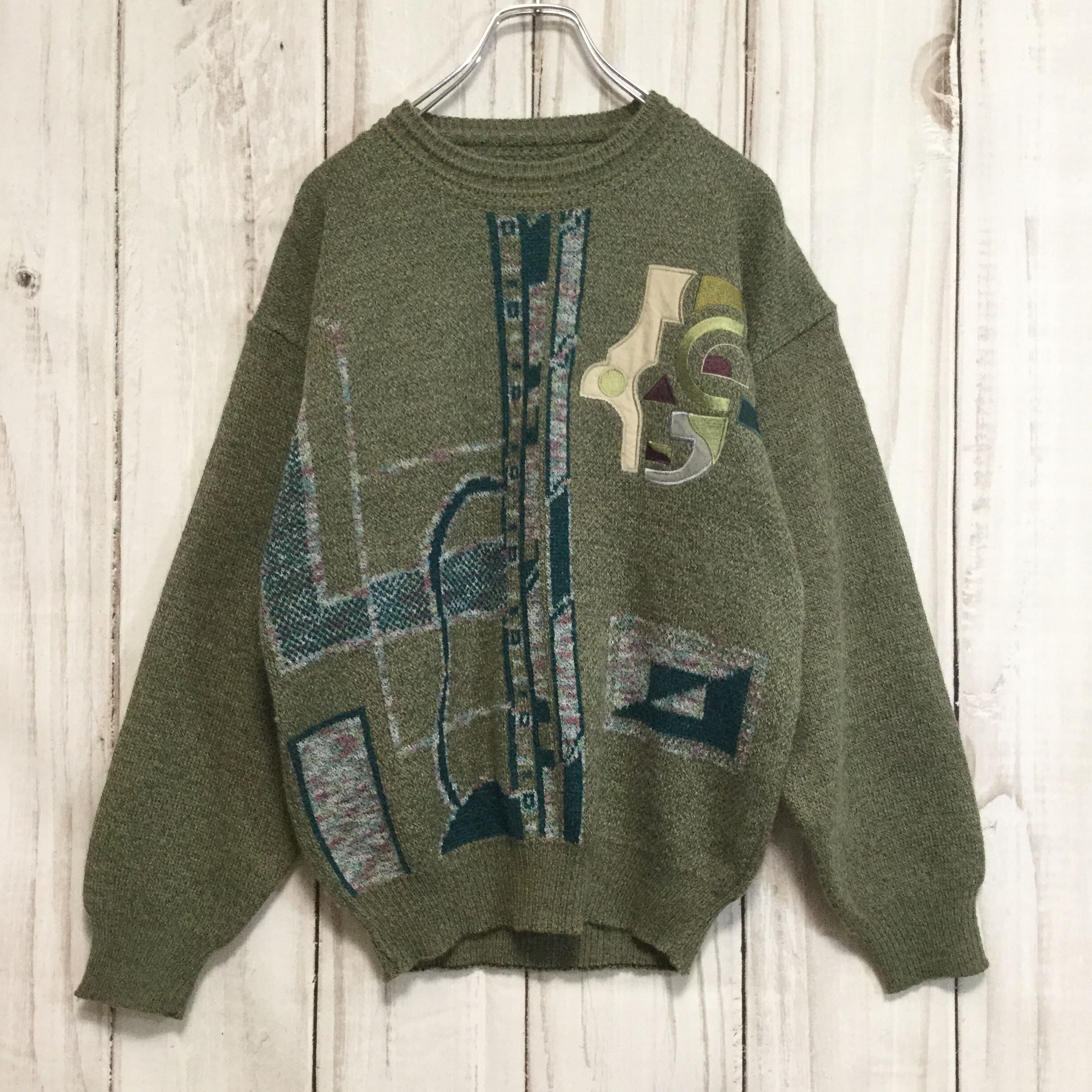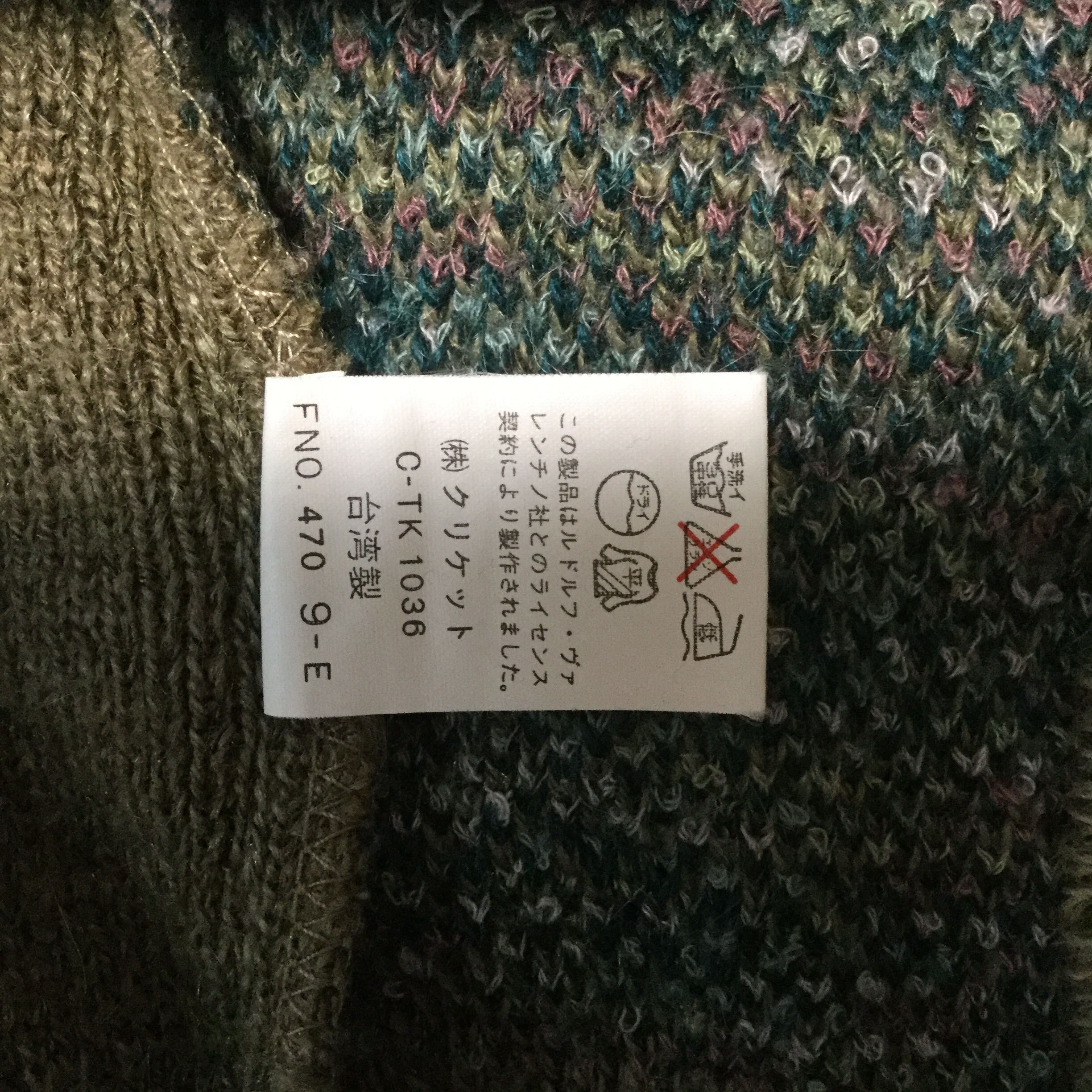 【ルドルフヴァレンチノ 刺繍入りニット】 ミックスカラー セーター M カーキ Rudolph Valentino 古着 [240126-021]