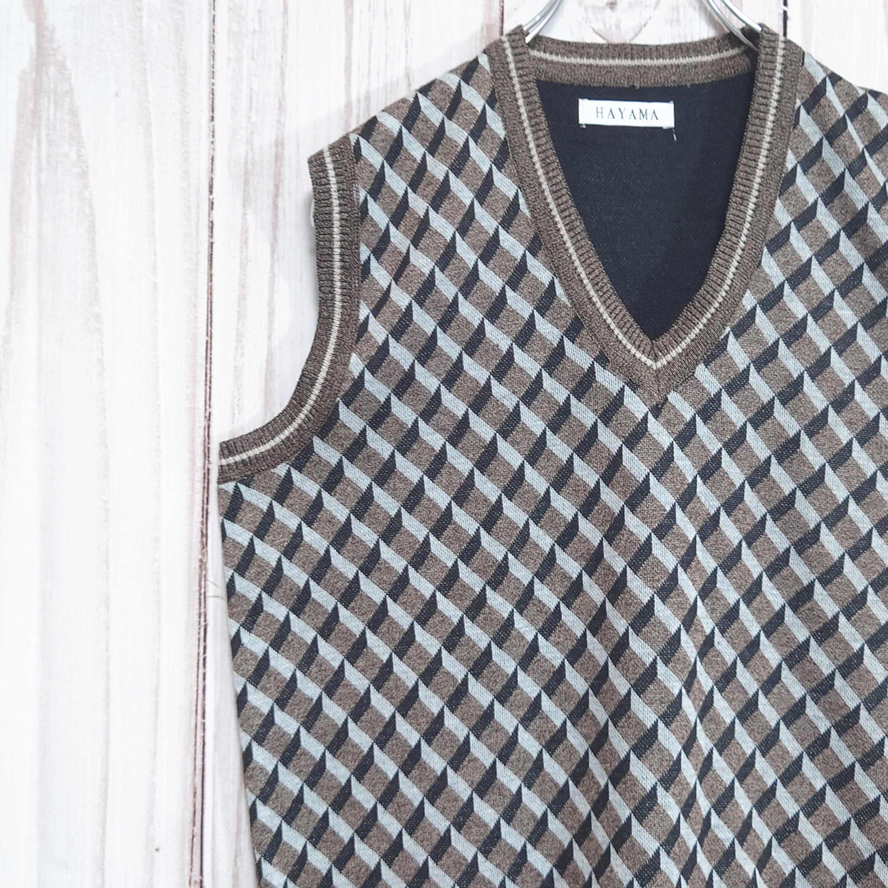 【ニットベスト】 美品 総柄 レトロコーデ Vネック M相当 茶 古着 [230429-007]