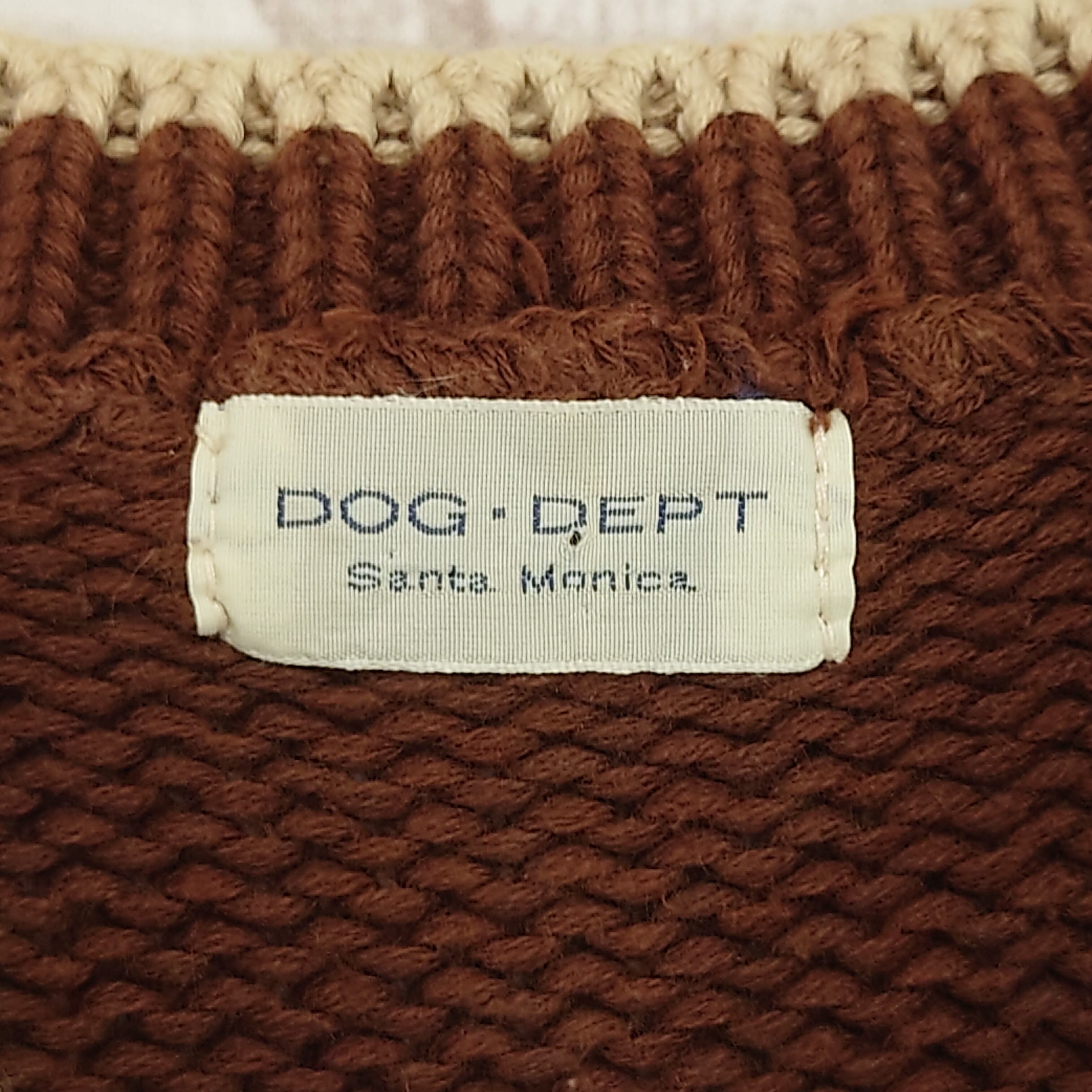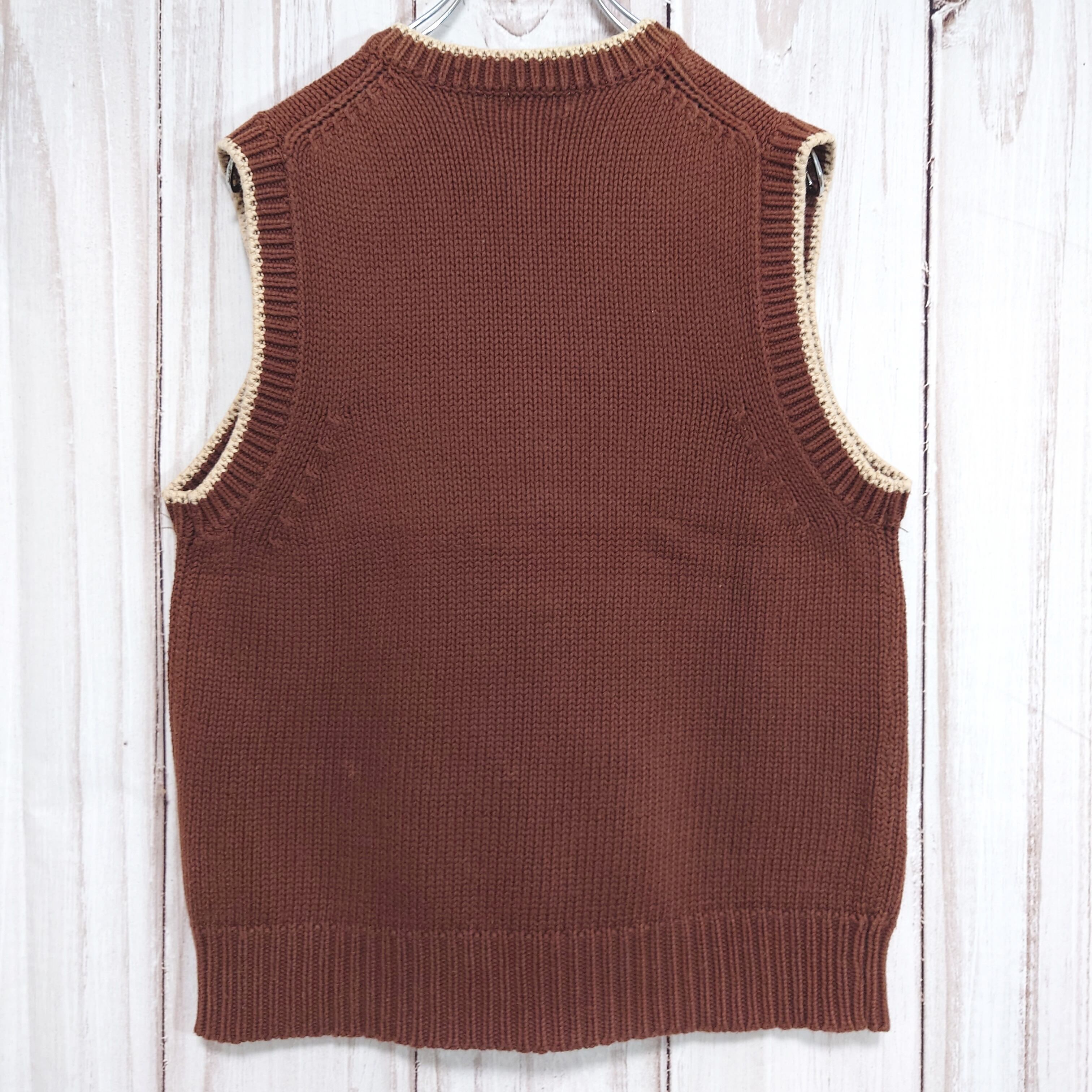 【ニットベスト】 レトロ ワンポイント刺繍 犬 Vネック リブライン M相当 茶 古着 [230429-009]