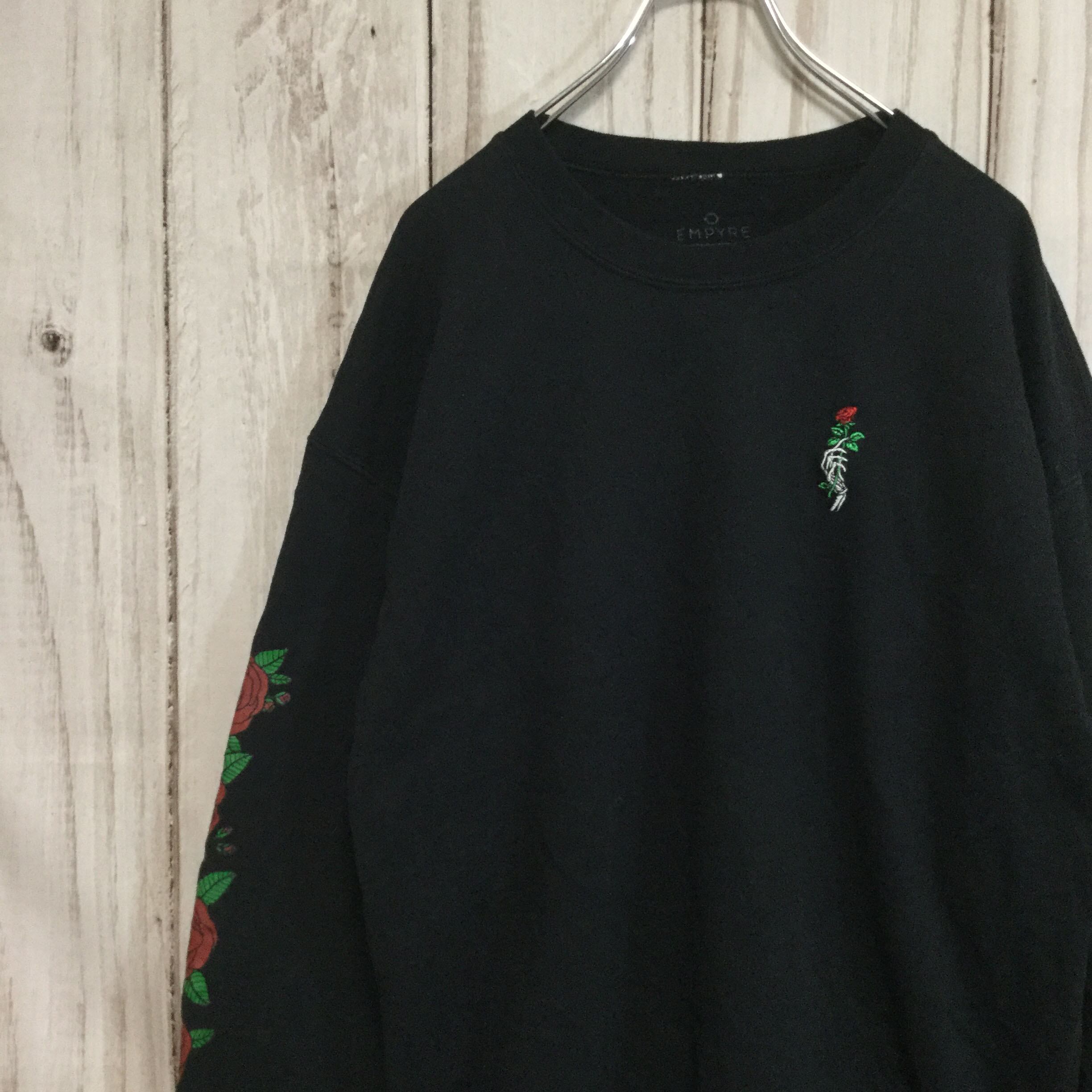 【刺繍デザインスウェット】袖薔薇プリント 裏起毛 トレーナー L 黒 古着 [240127-023]