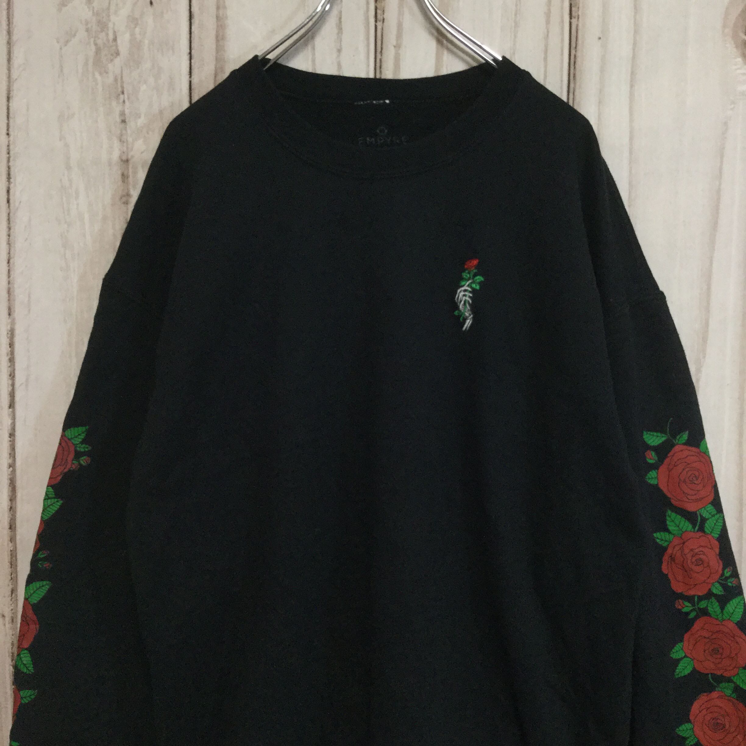 袖薔薇プリント 裏起毛 トレーナー L 黒 古着
