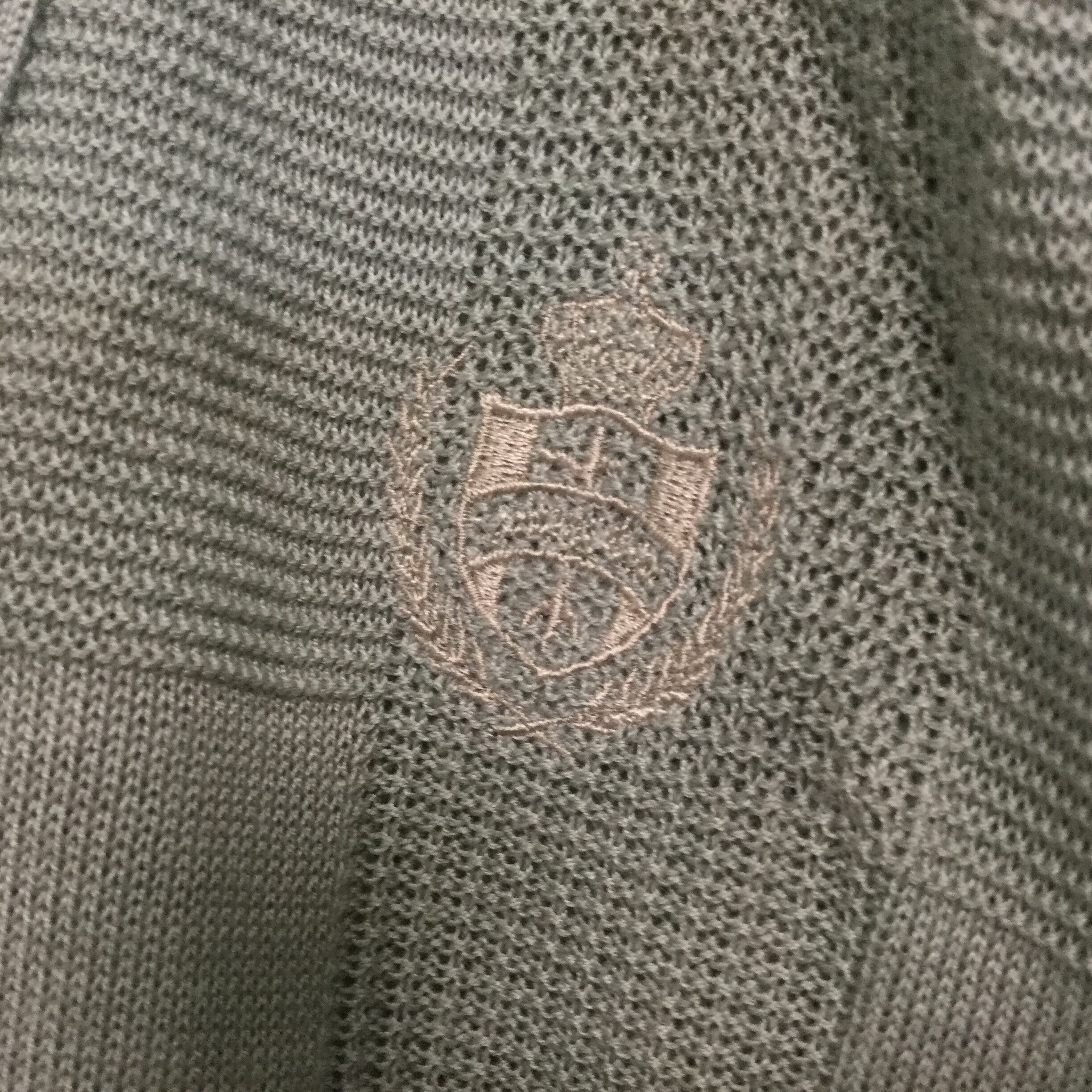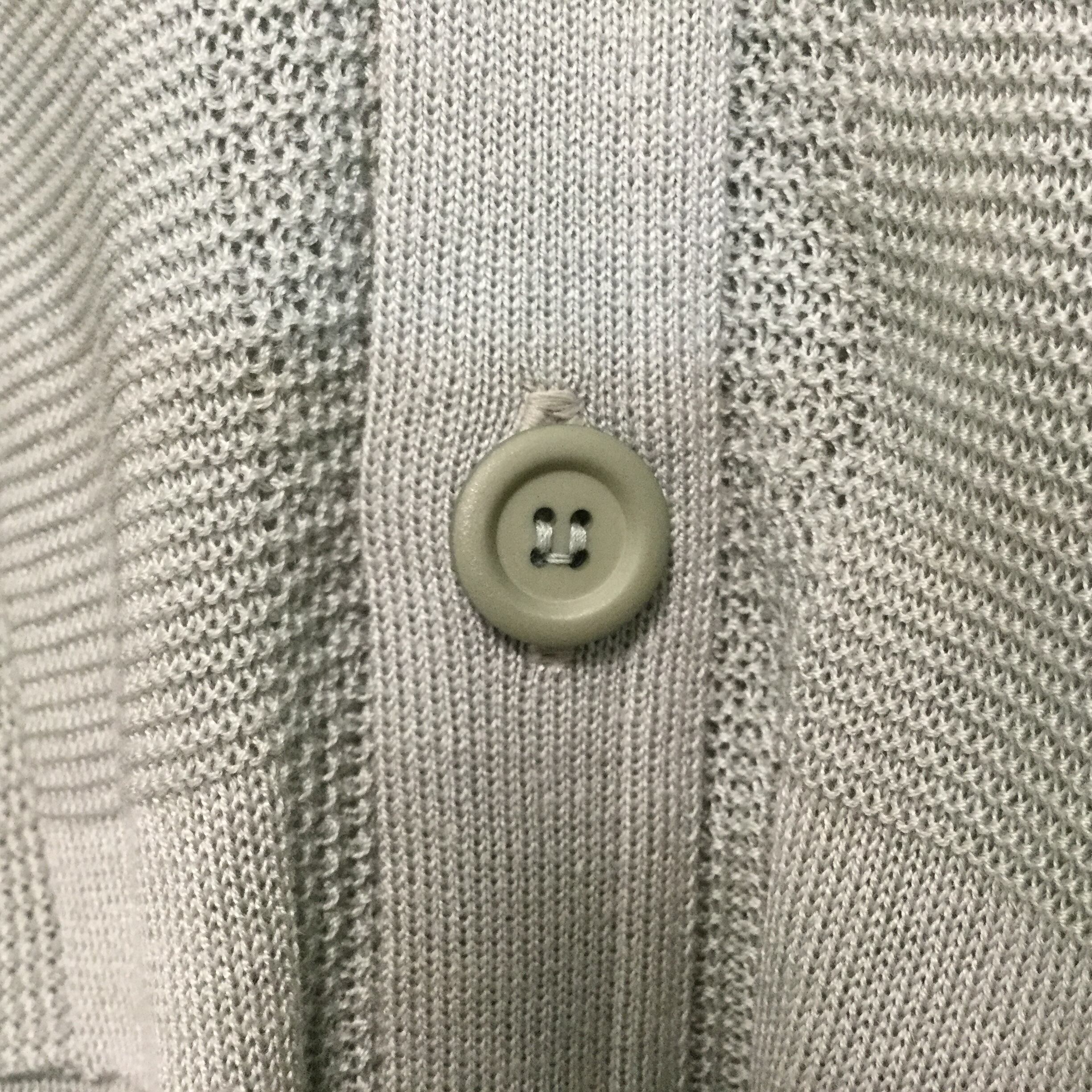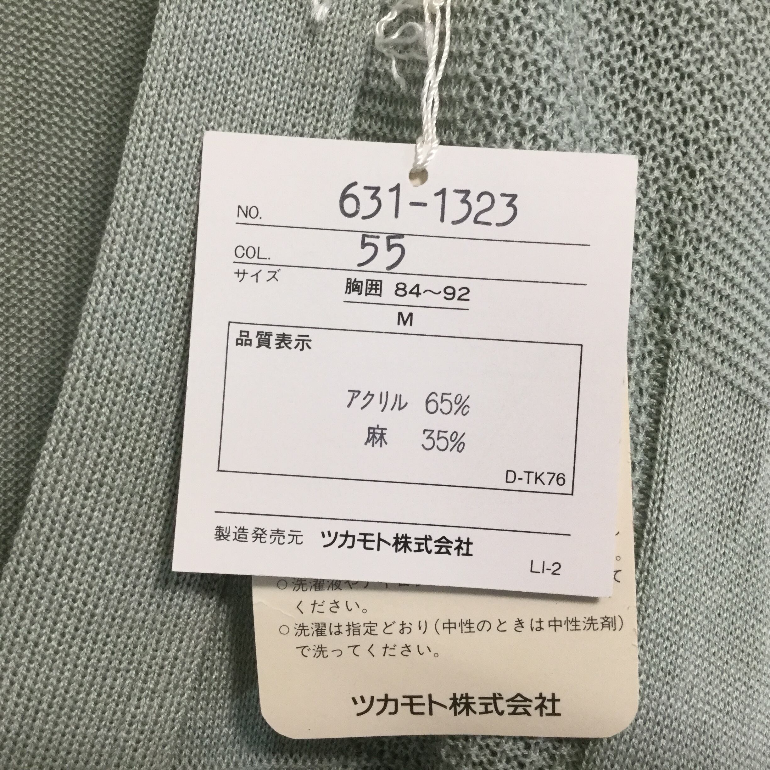 【未使用 麻混 透かし編み 薄手 カーディガン】リネン混 ロゴ刺繍 ポケット M 緑 古着 [240301-028]