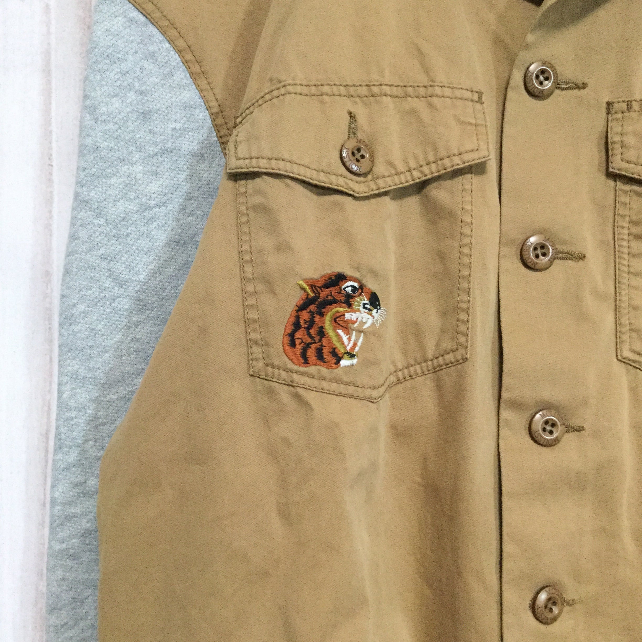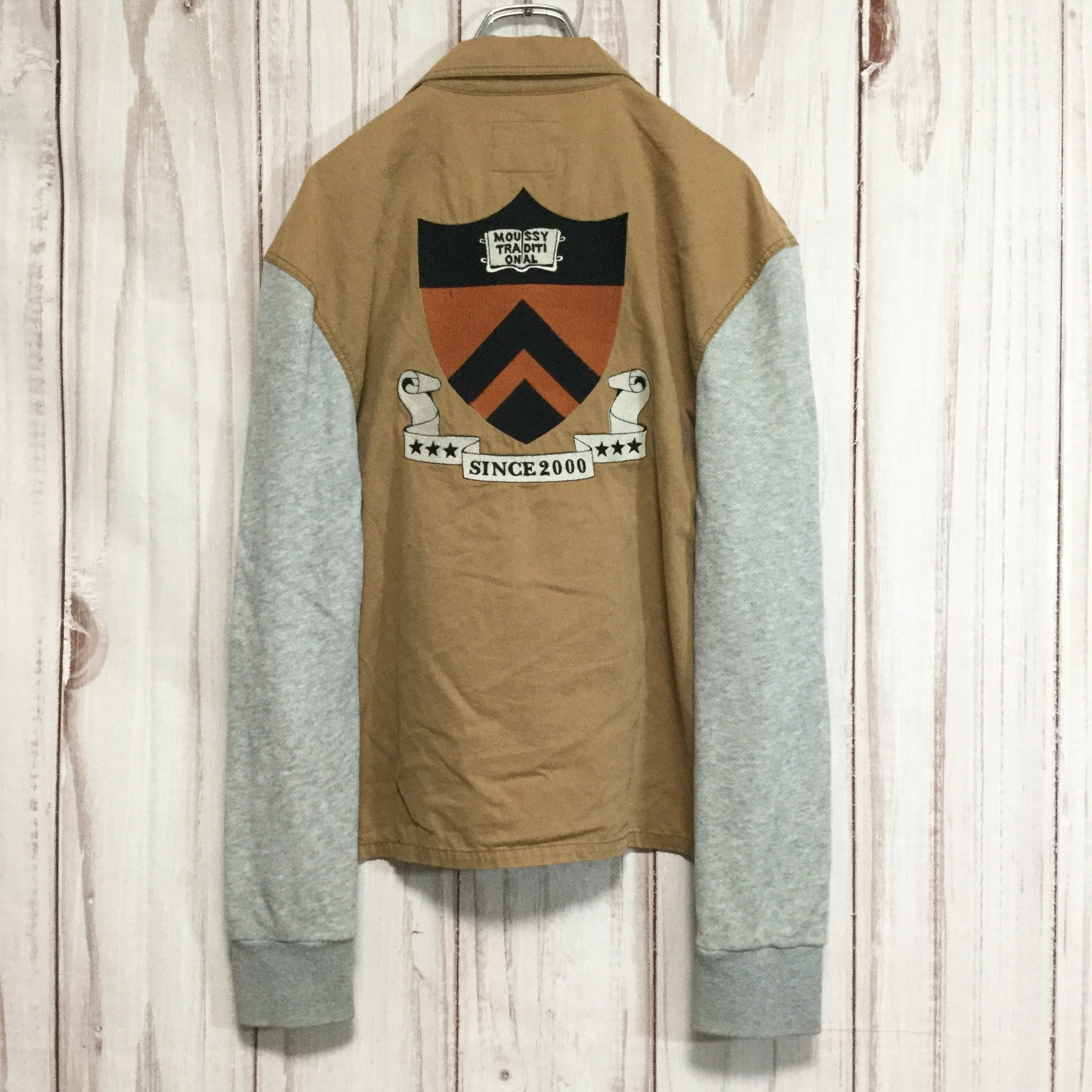 【長袖シャツ】 背面刺繍デザイン 異素材ミックス アニマル M相当 ベージュ 古着 [230829-013]