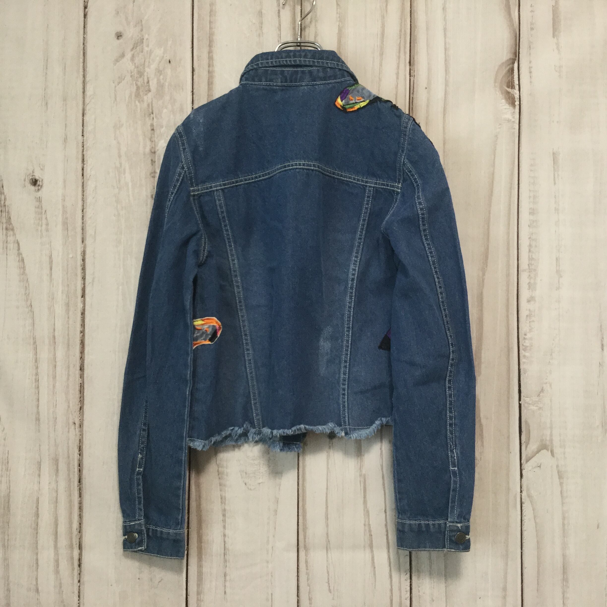 【デニムジャケット】刺繍デザイン 蝶 装飾 海外サイズ S相当 ネイビー 古着 [240406-017]