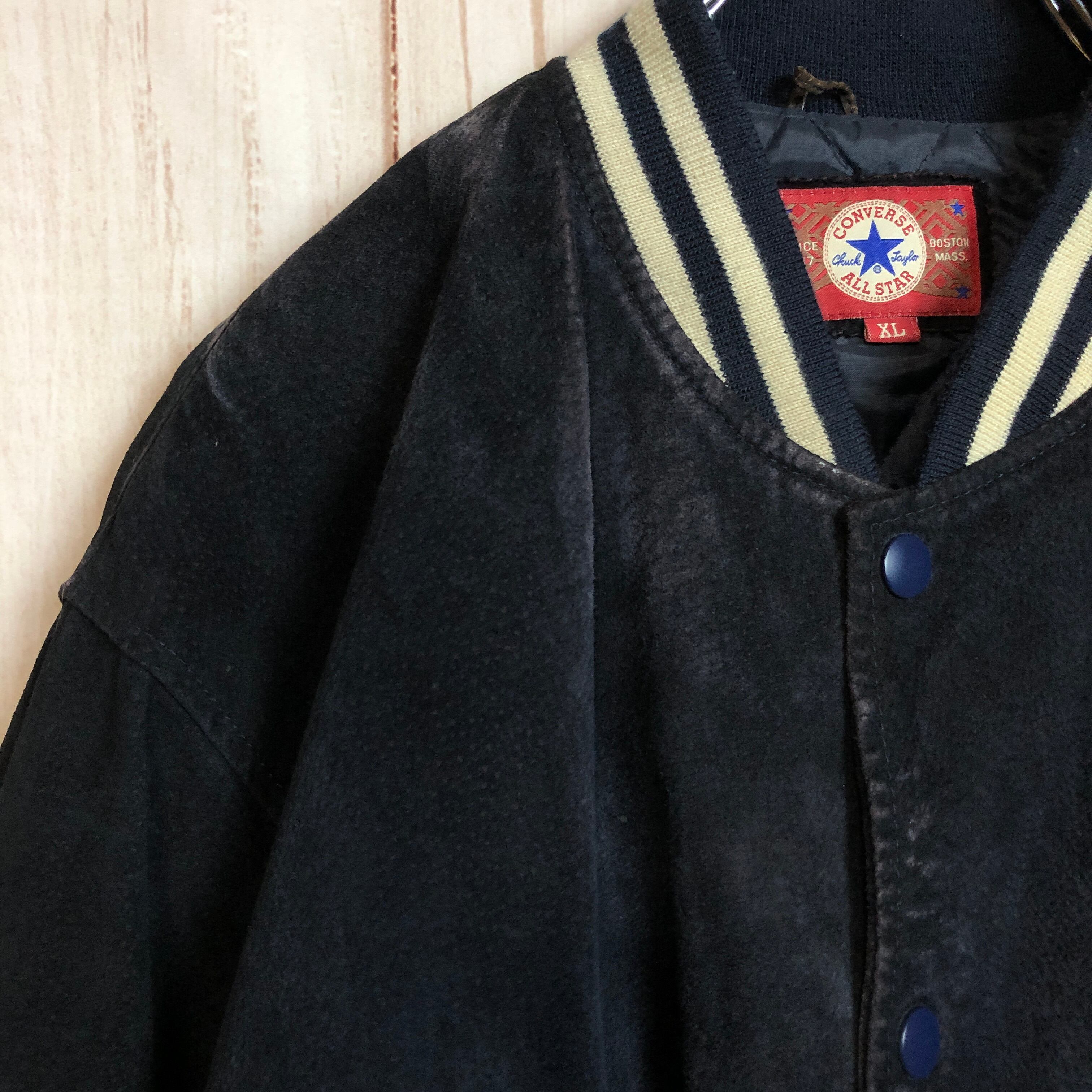 【コンバース レザースタジャン】 ビッグ刺繍 スエード 豚革 ビッグサイズ リブライン ブルゾン レザージャケット XL 黒 Converse 古着 [230929-014]