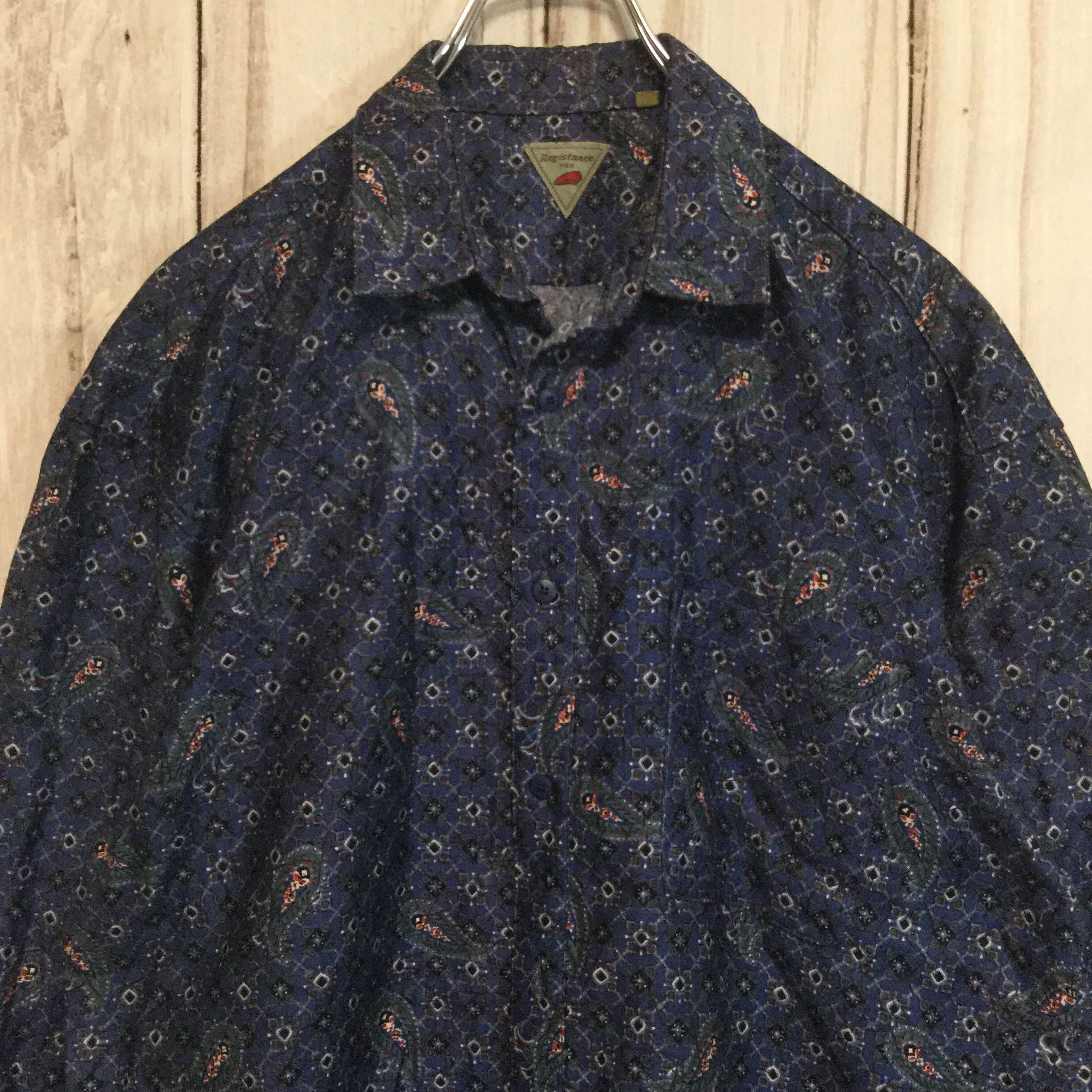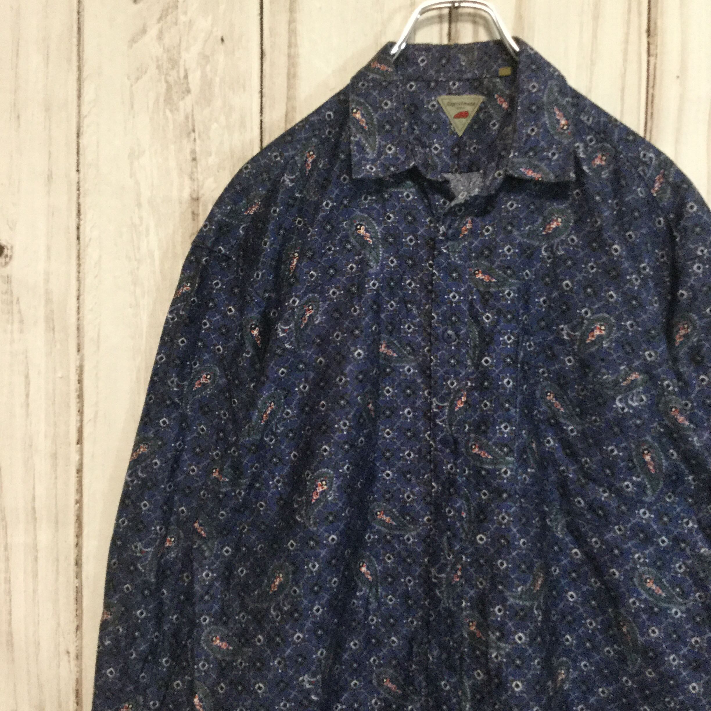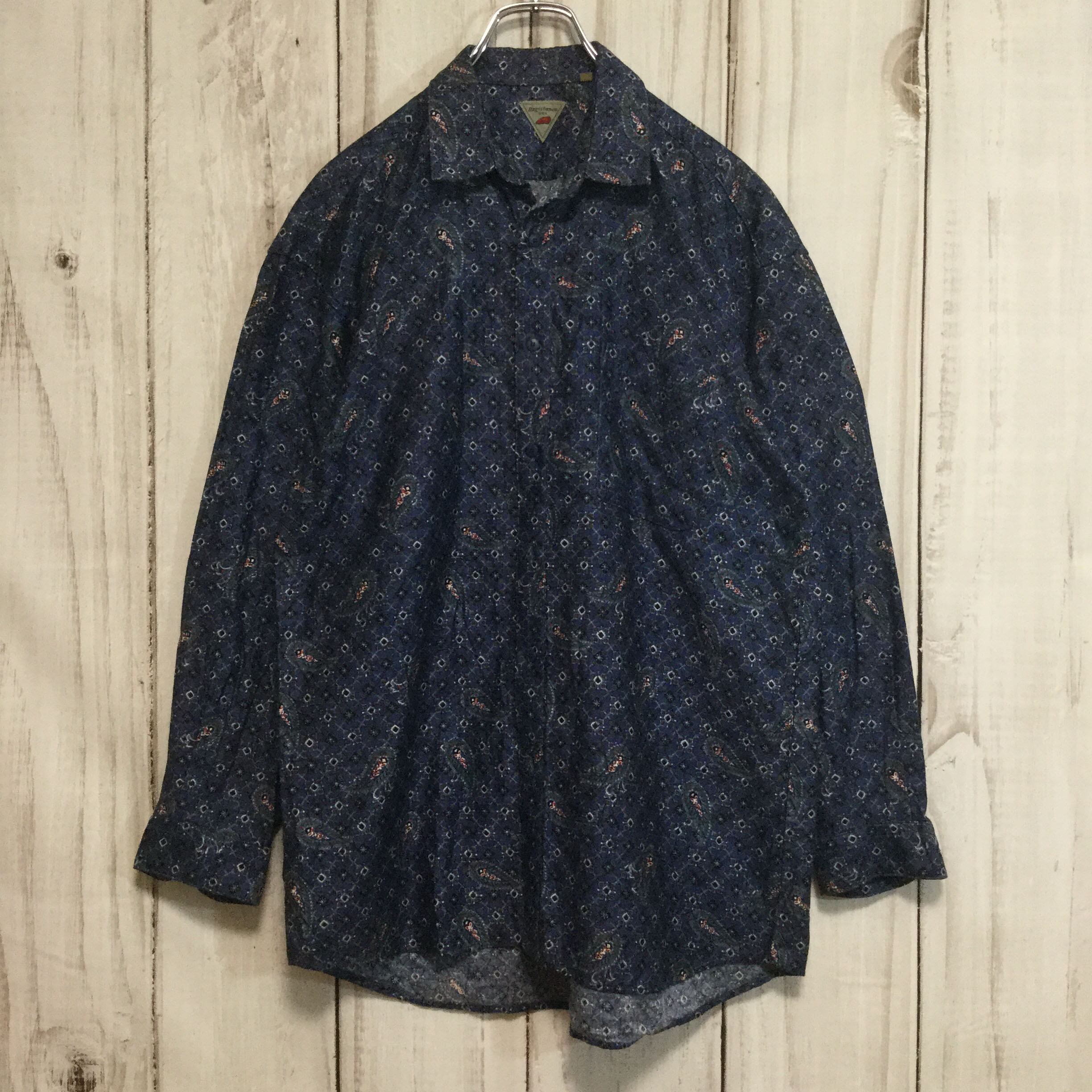 【総柄 長袖コットンシャツ】レトロ ダークカラー L 古着 [240126-006]