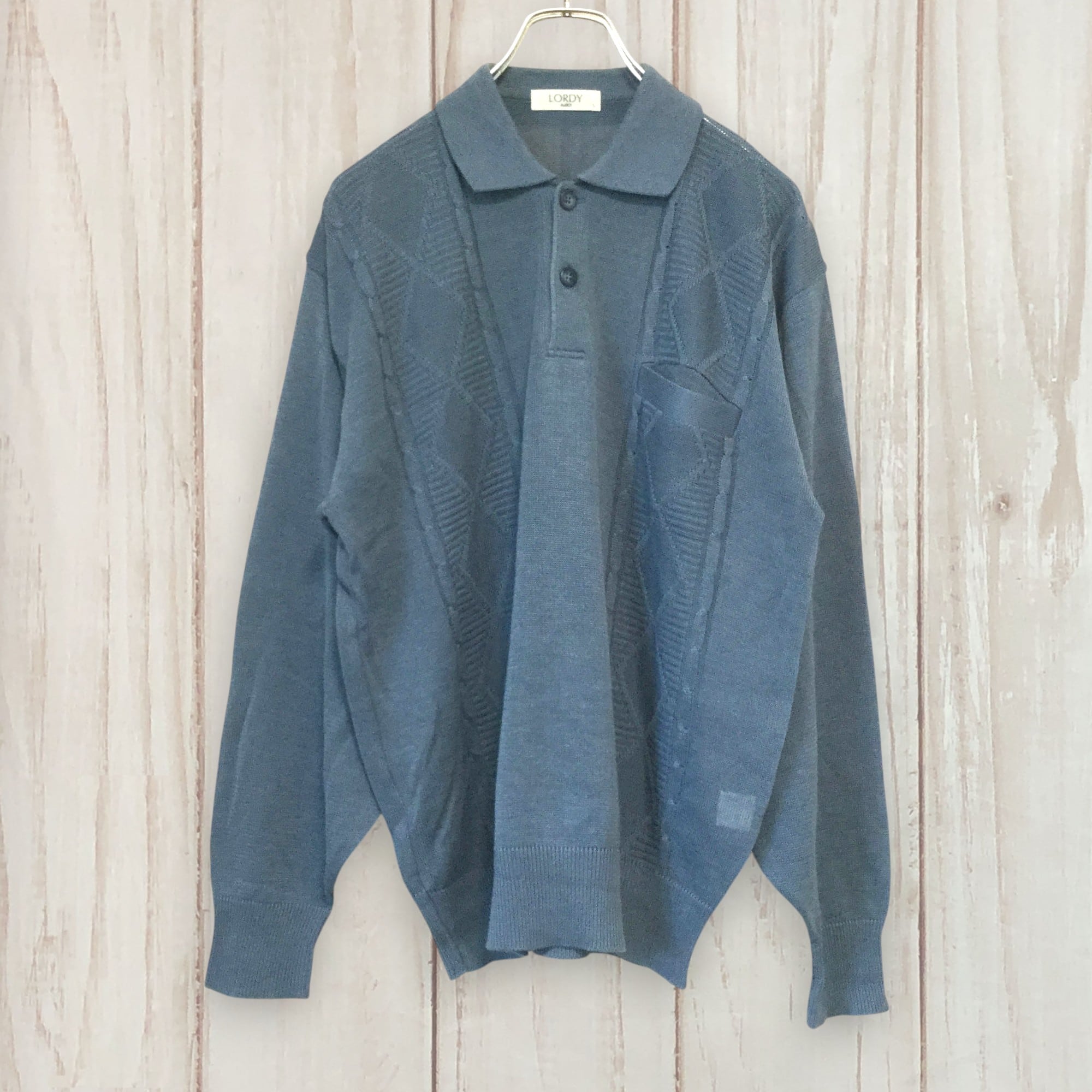 LORDY 長袖ポロシャツ サマーニット 透かし編み ケーブル編み 青 ブルー Lサイズ ポケット付き 襟付き 日本ブランド メンズ 古着 春夏 軽やか 透け感
