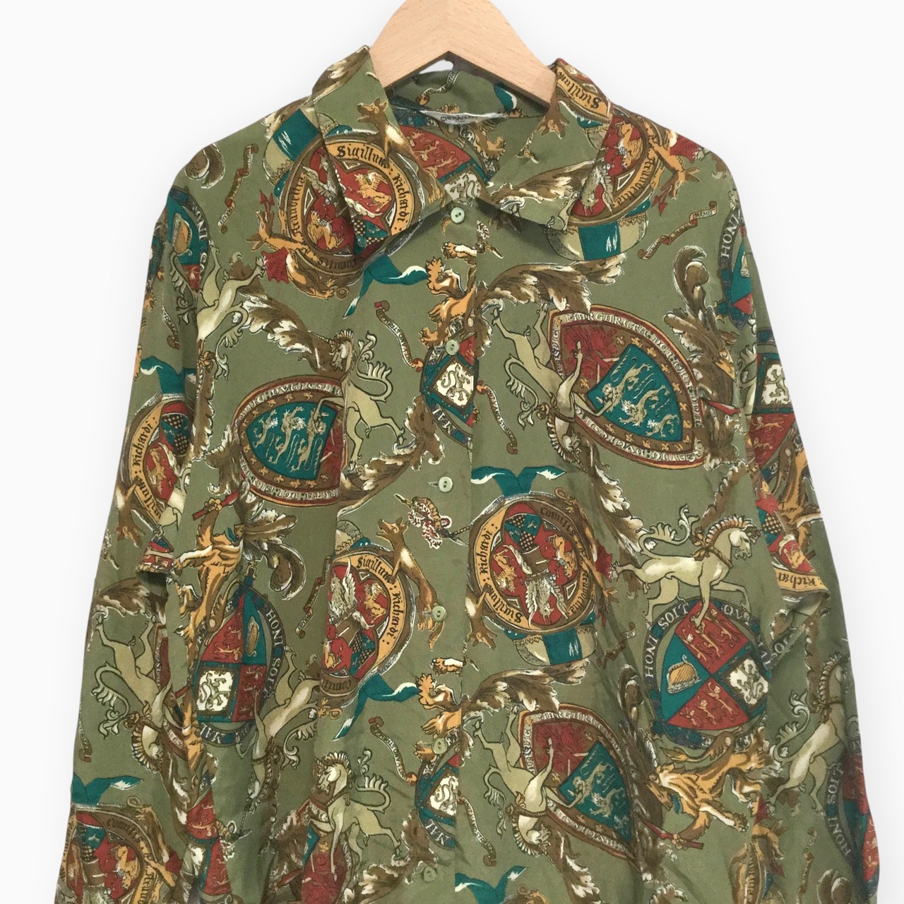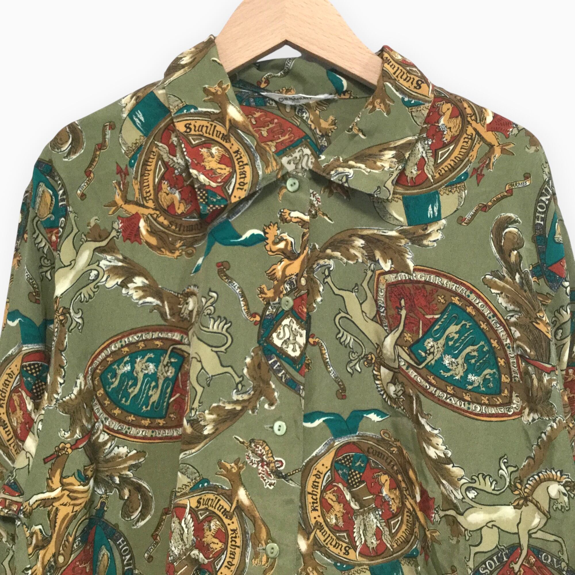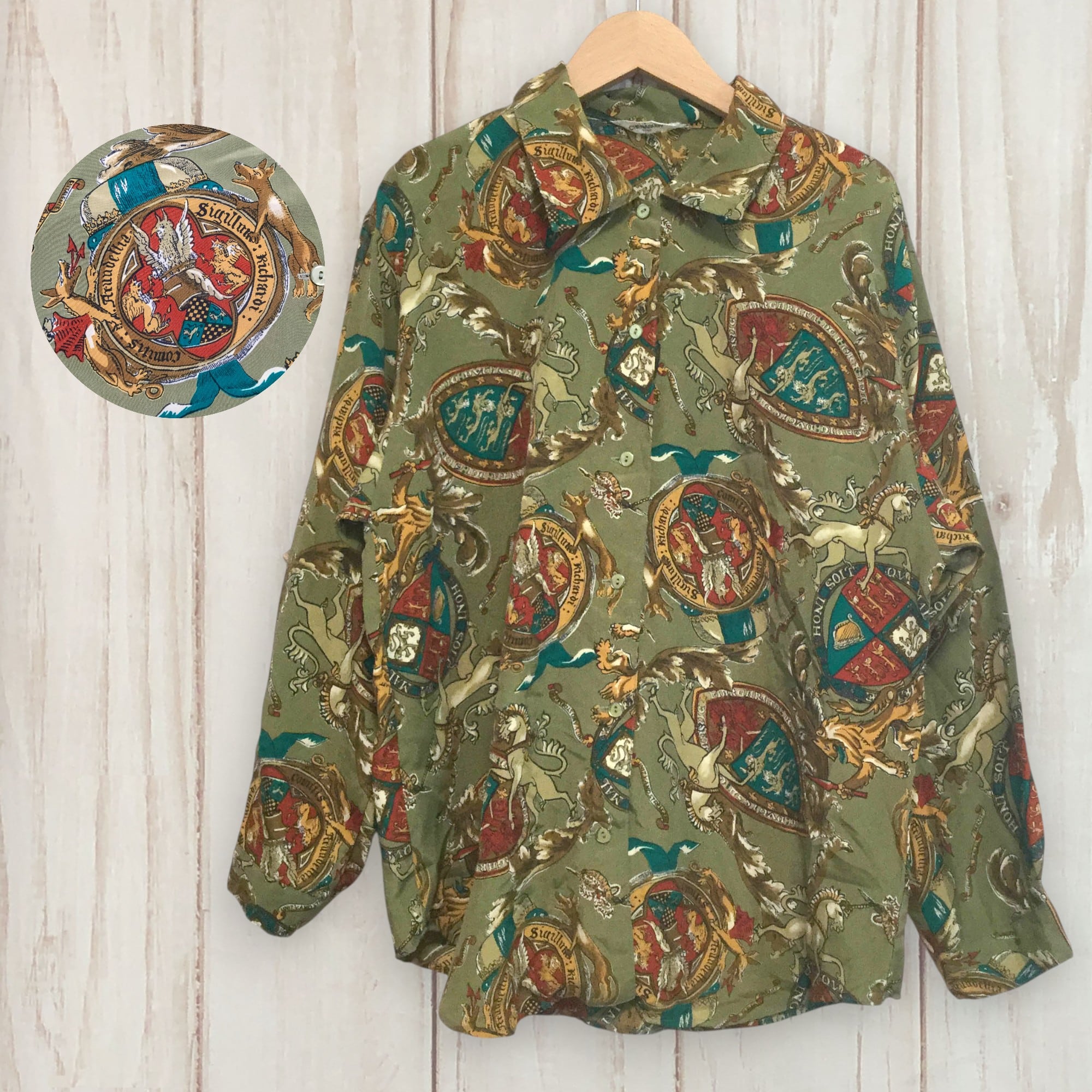 古着 ヨーロピアン 長袖総柄シャツ レトロ 日本製 ポリエステル100% レトロデザイン 柄シャツ 上品 L相当 レディース