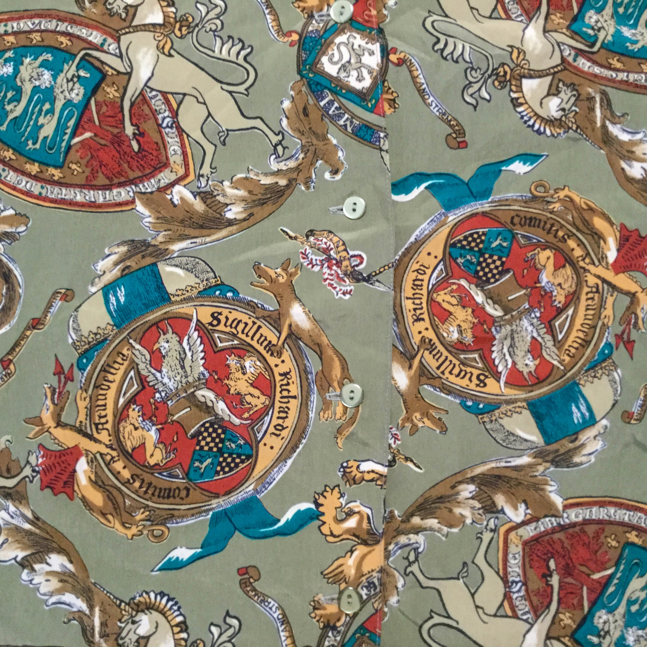 ヨーロピアン調の総柄が印象的な、上品でクラシックな雰囲気の長袖シャツです。