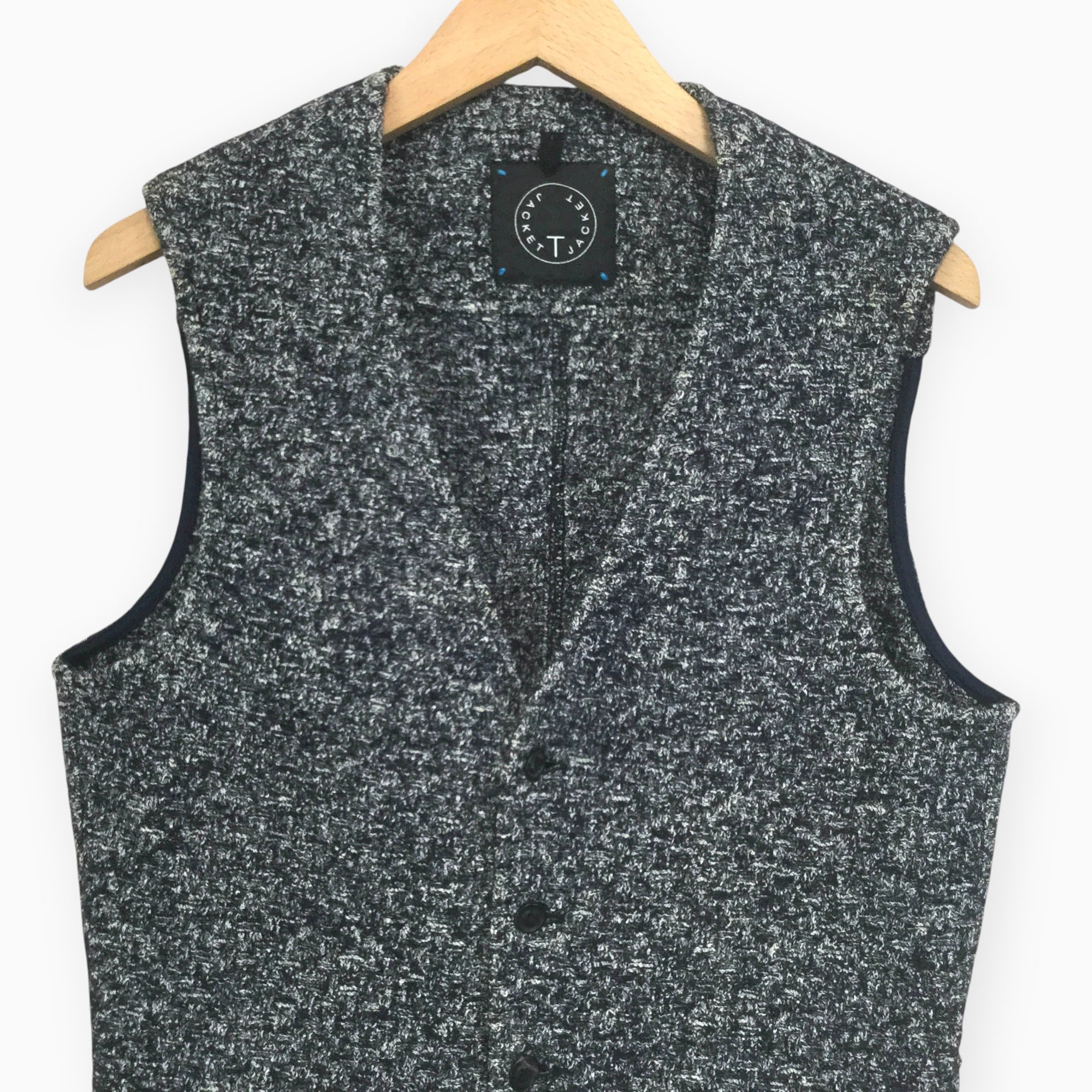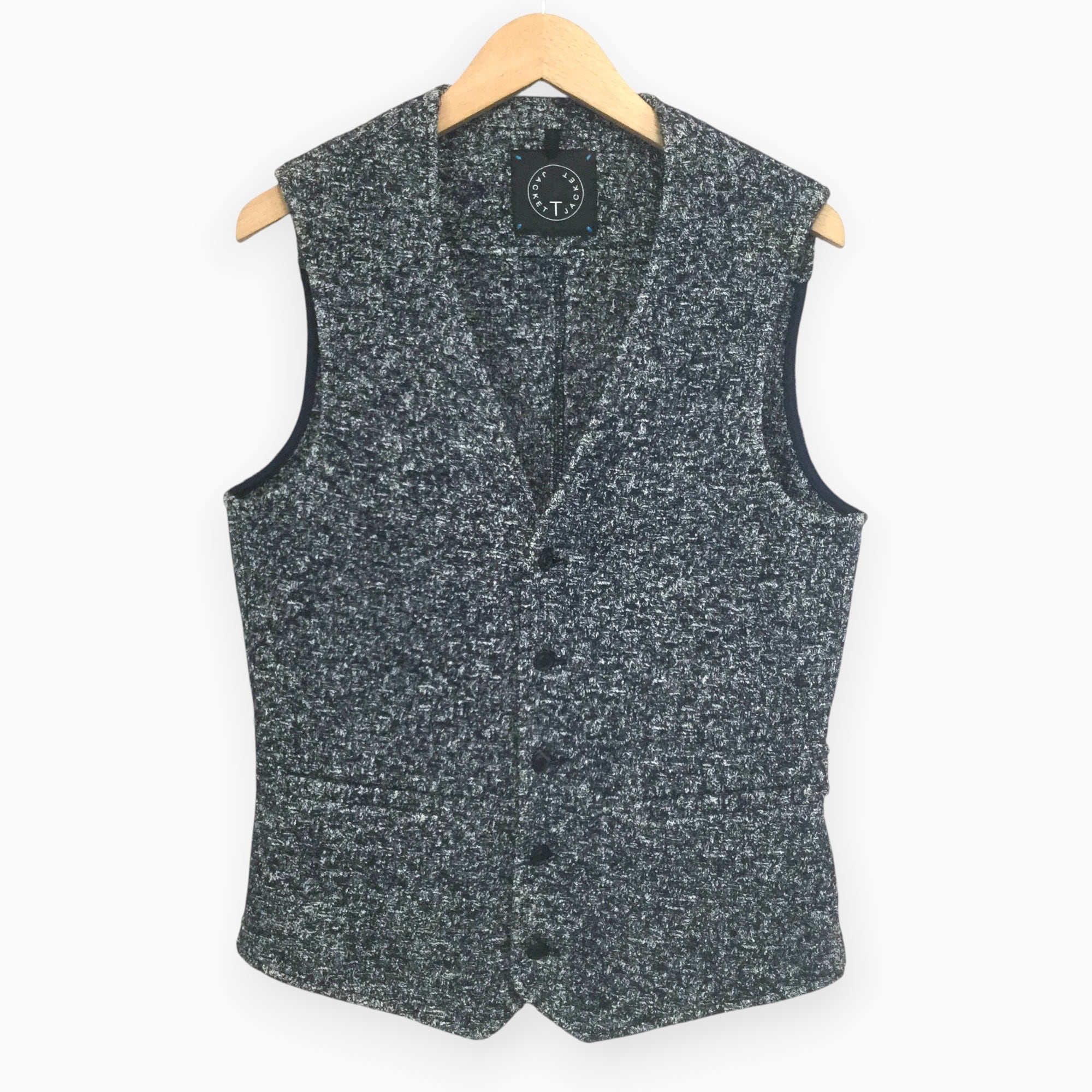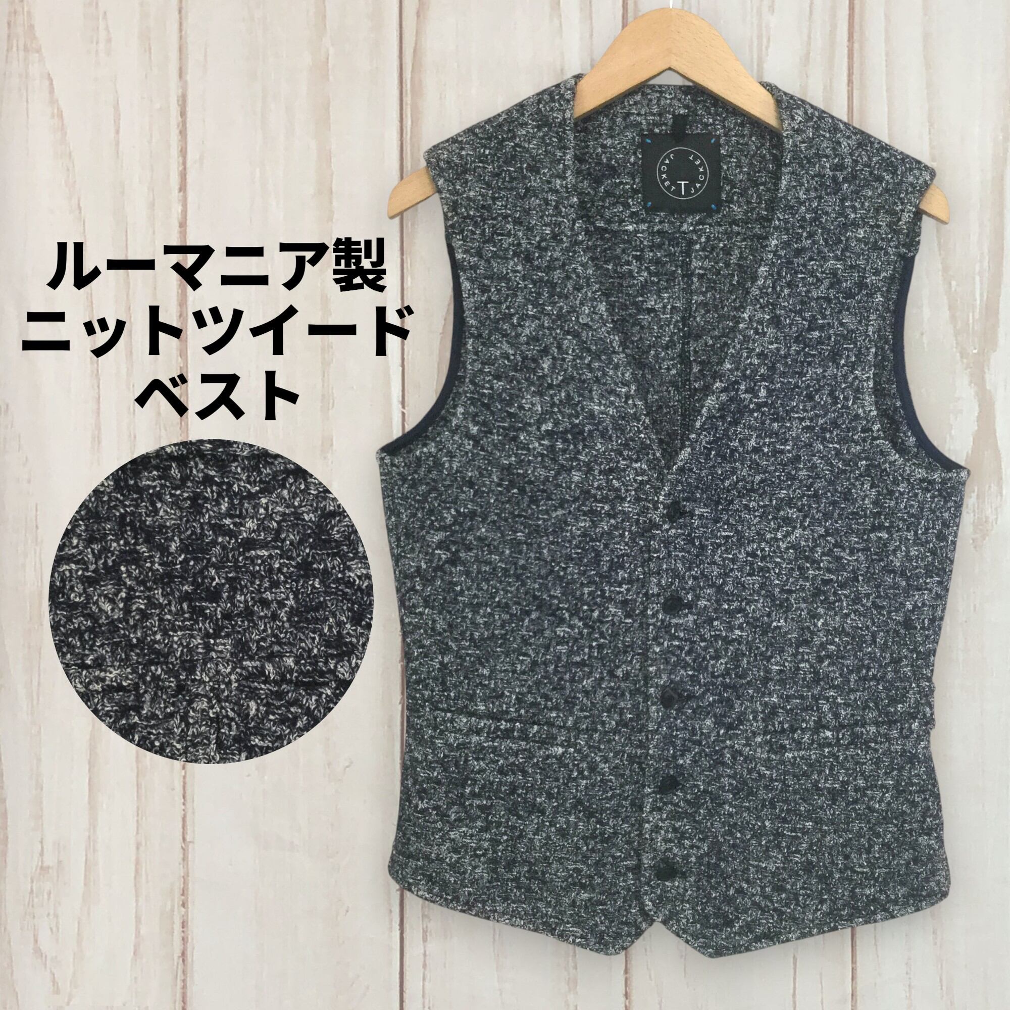 TJACKET 青 ルーマニア製 ベスト 前開き ニットベスト メンズ Mサイズ ブルー ウール混 コットン混 裏地付き ポケット付き レイヤード 古着 カジュアル 秋冬 ニット素材 裏地付 ポケット