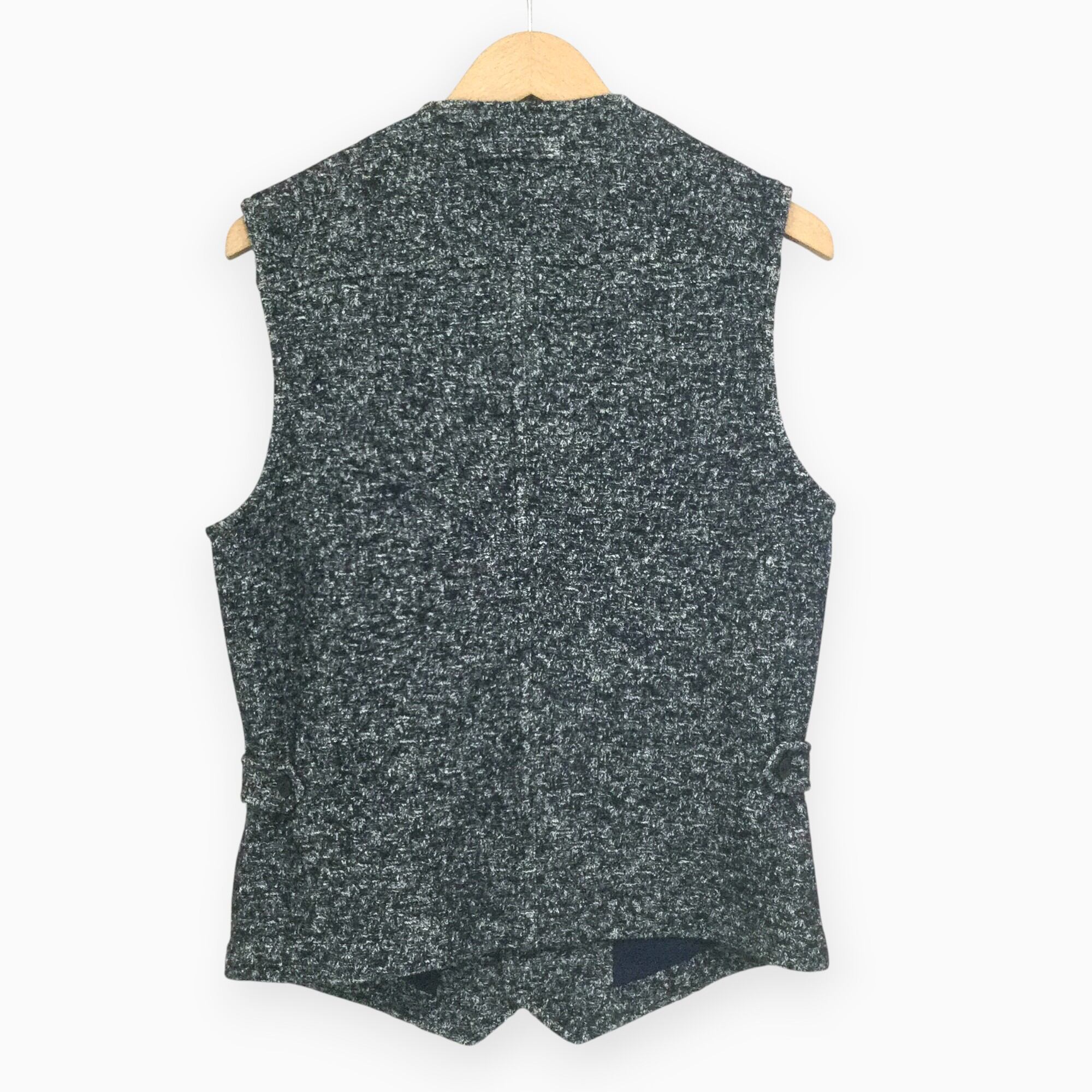 深みのあるブルーが印象的な、前開き仕様のニットベストです。