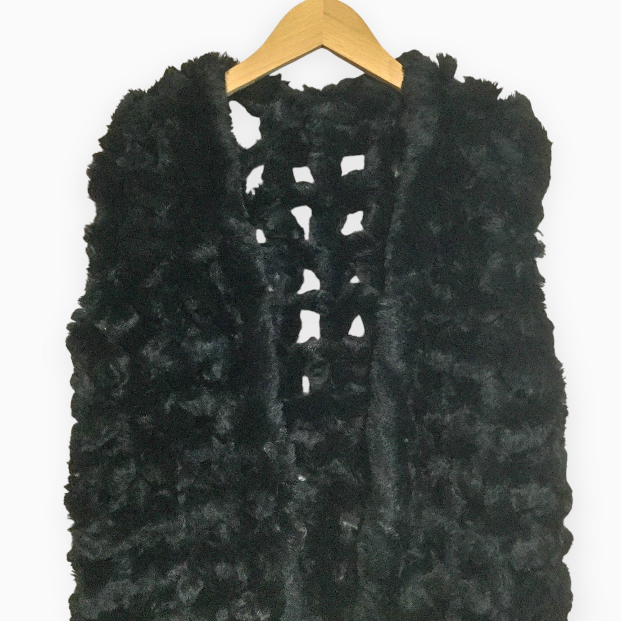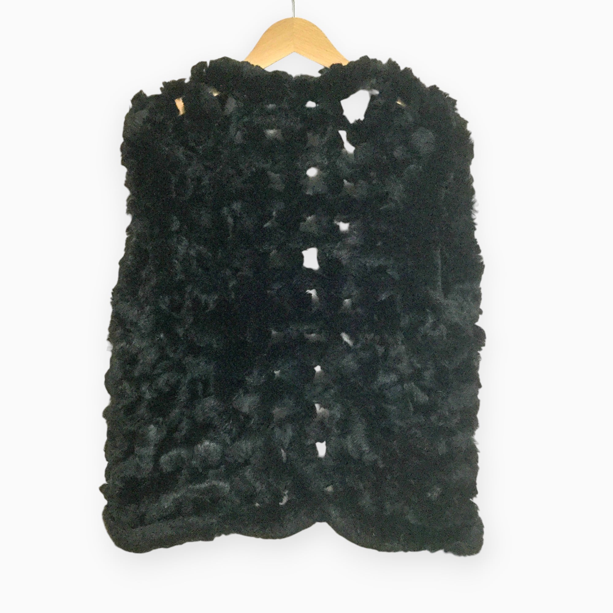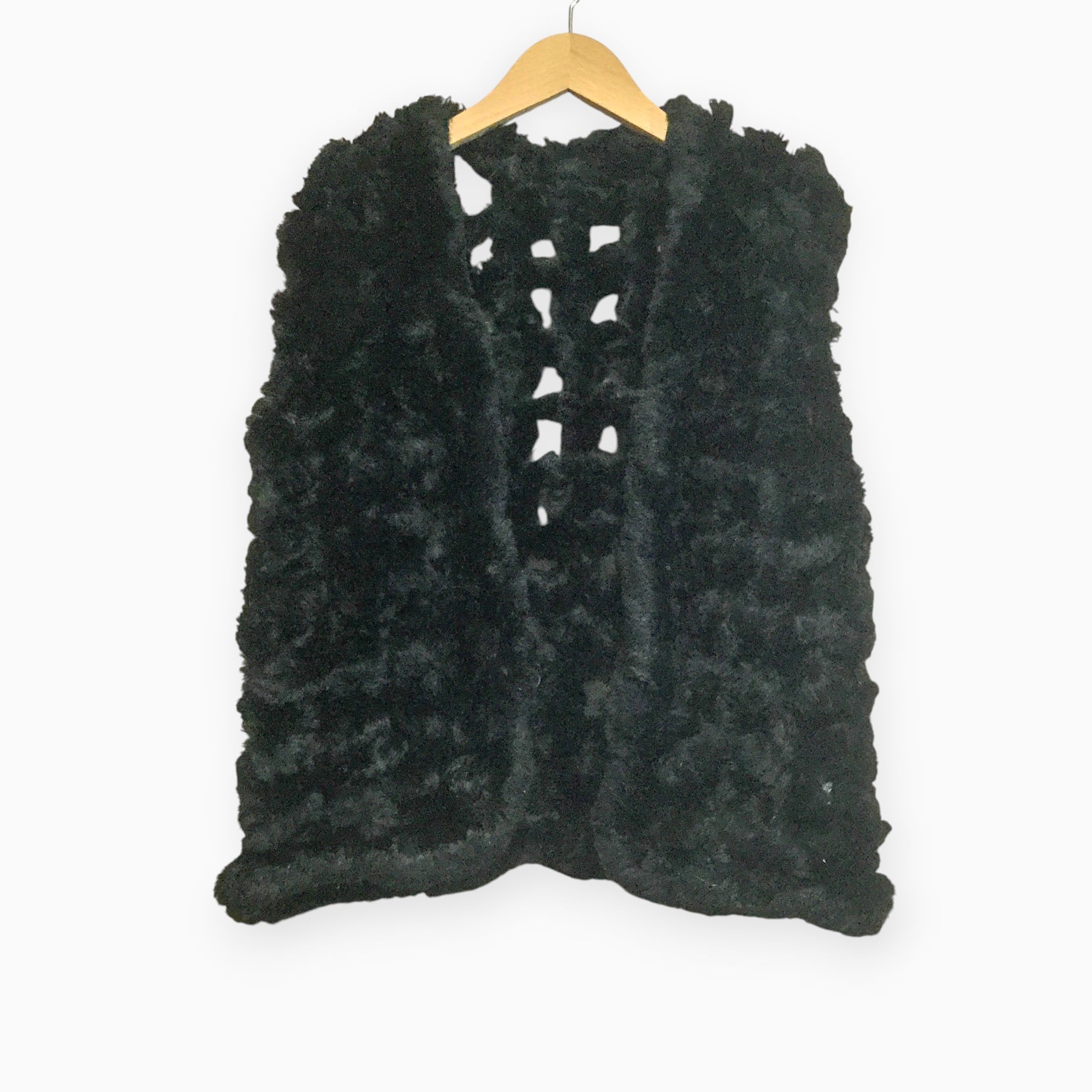 紐状にしたファーを組み合わせた、動きのあるデザインが印象的なブラックのファーベストです。