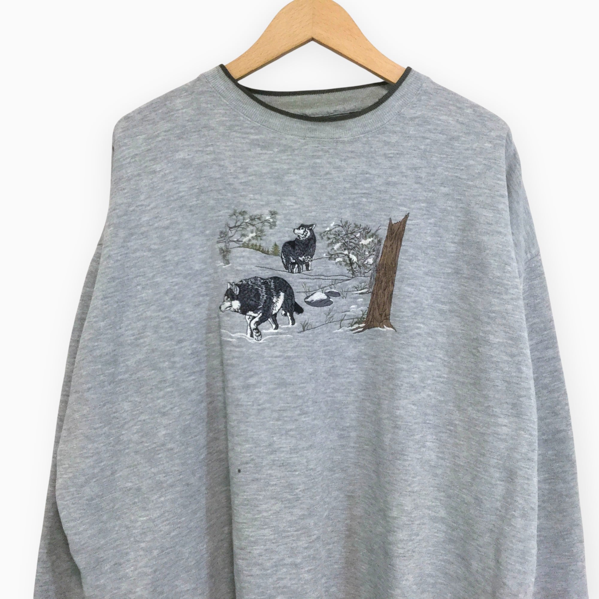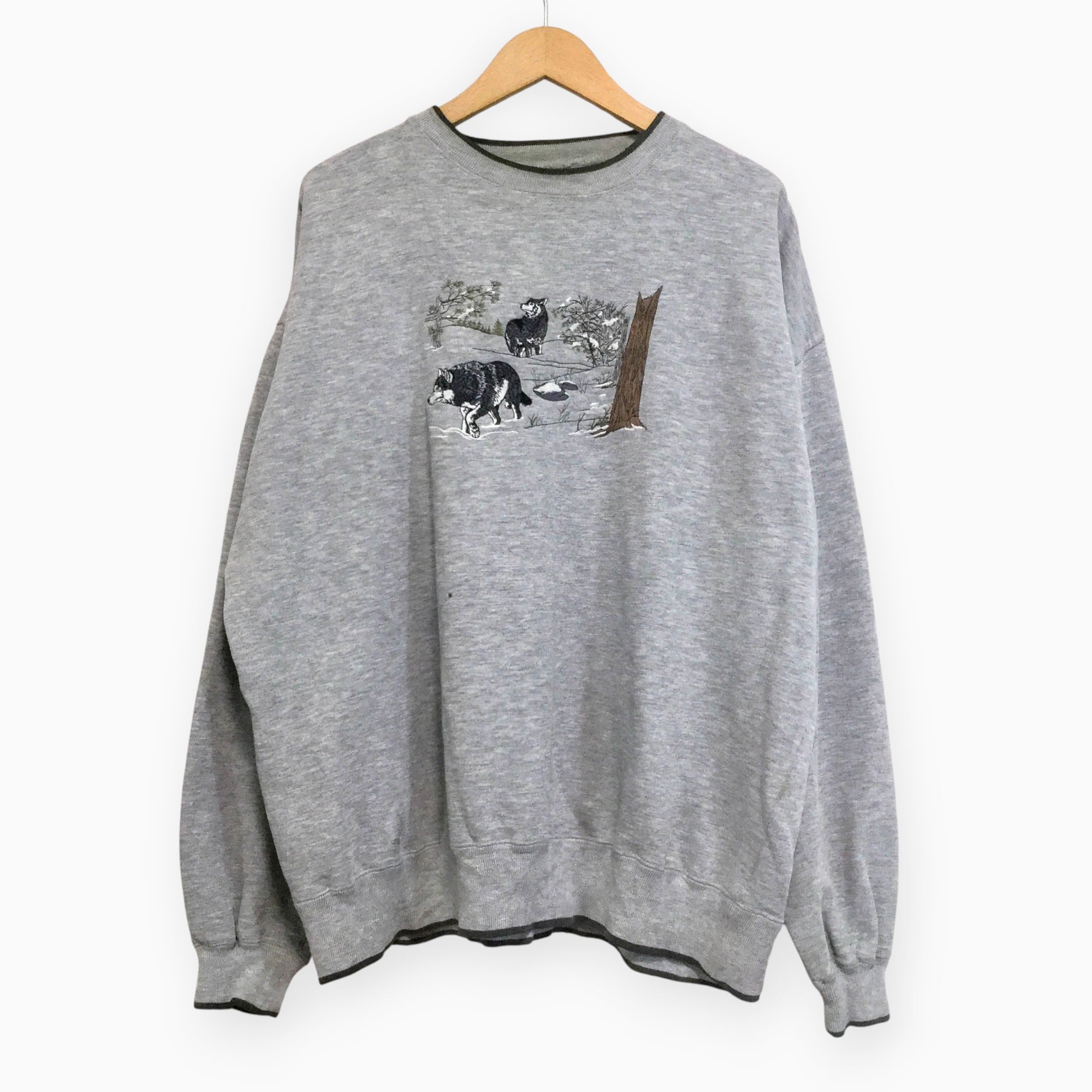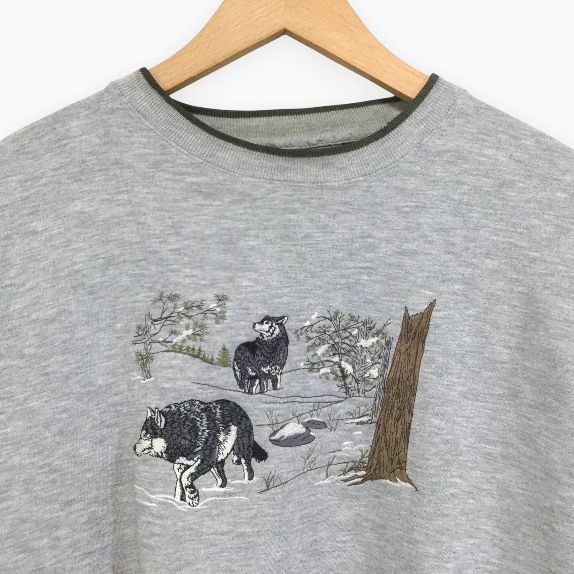 古着 長袖刺繍スウェット 刺繍 狼 オオカミ 裏起毛 XLサイズ アメリカ輸入古着 カジュアル ストリート 秋冬 XL グレー