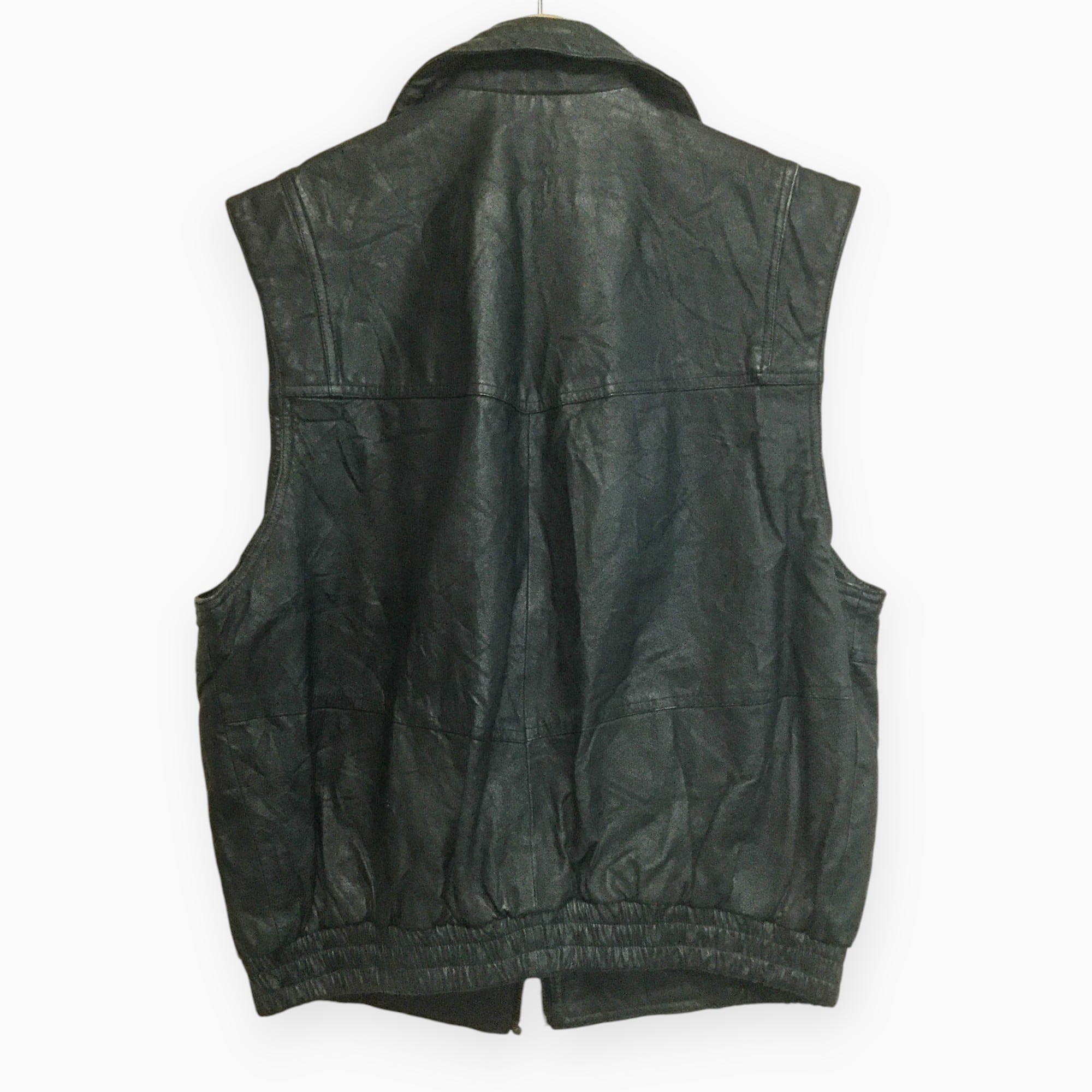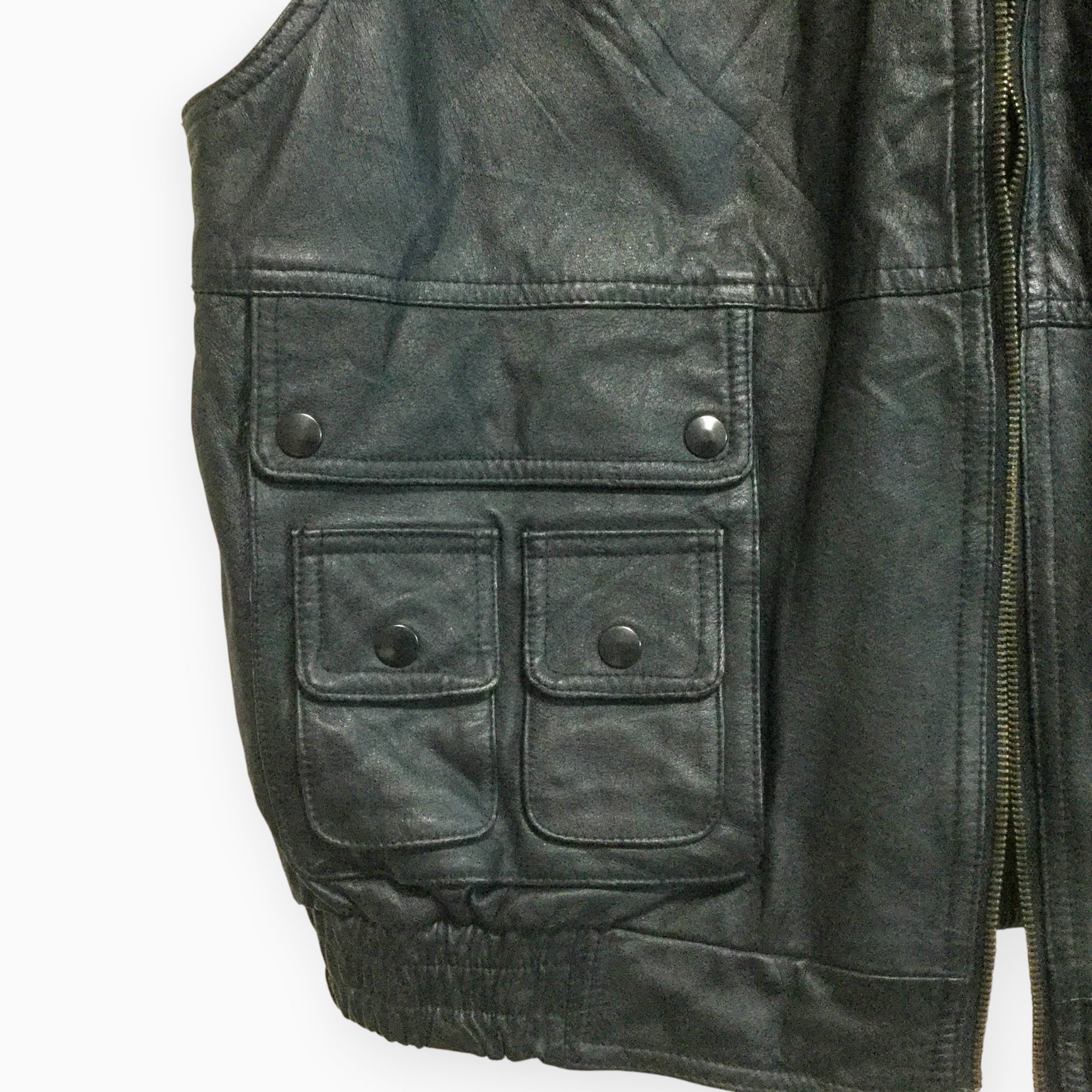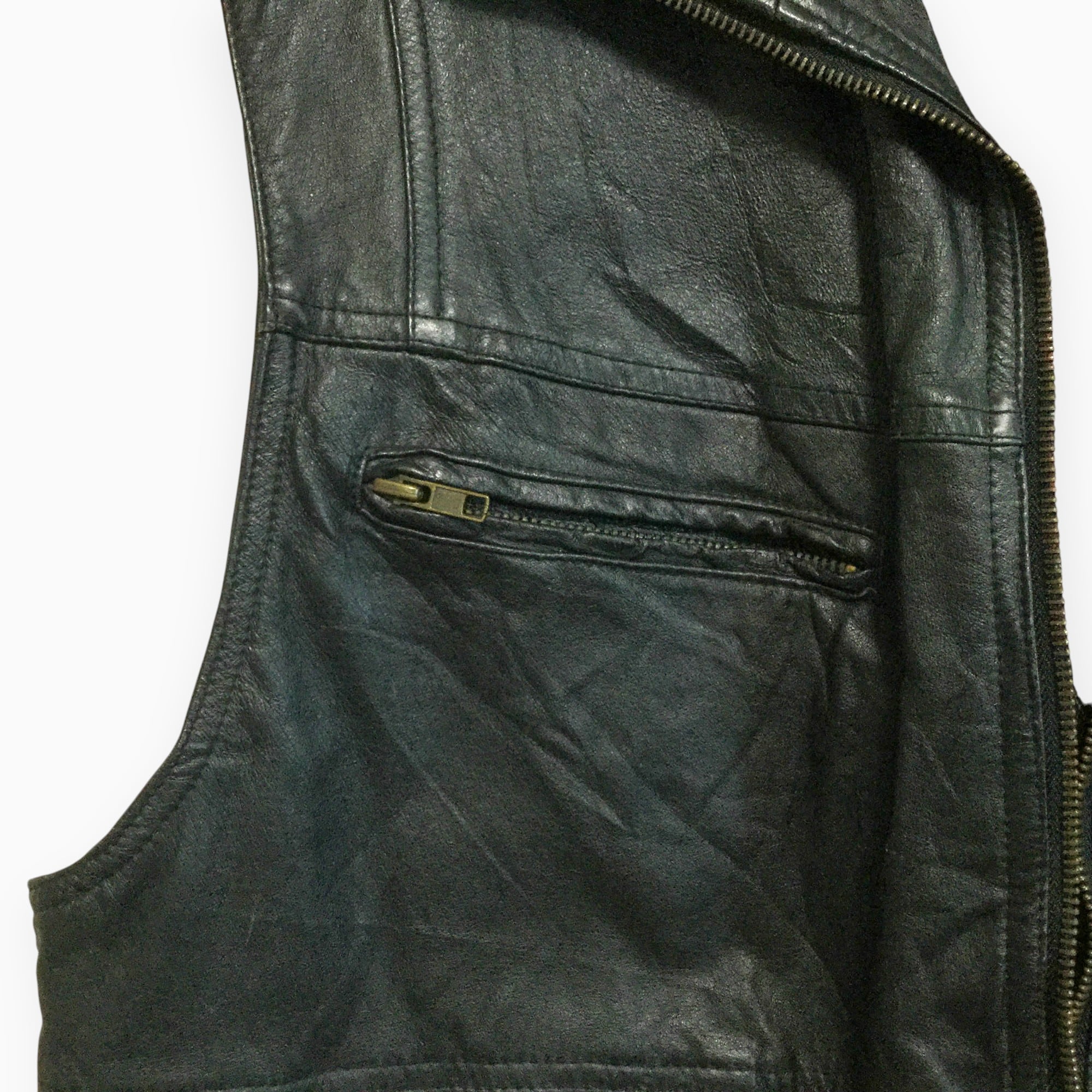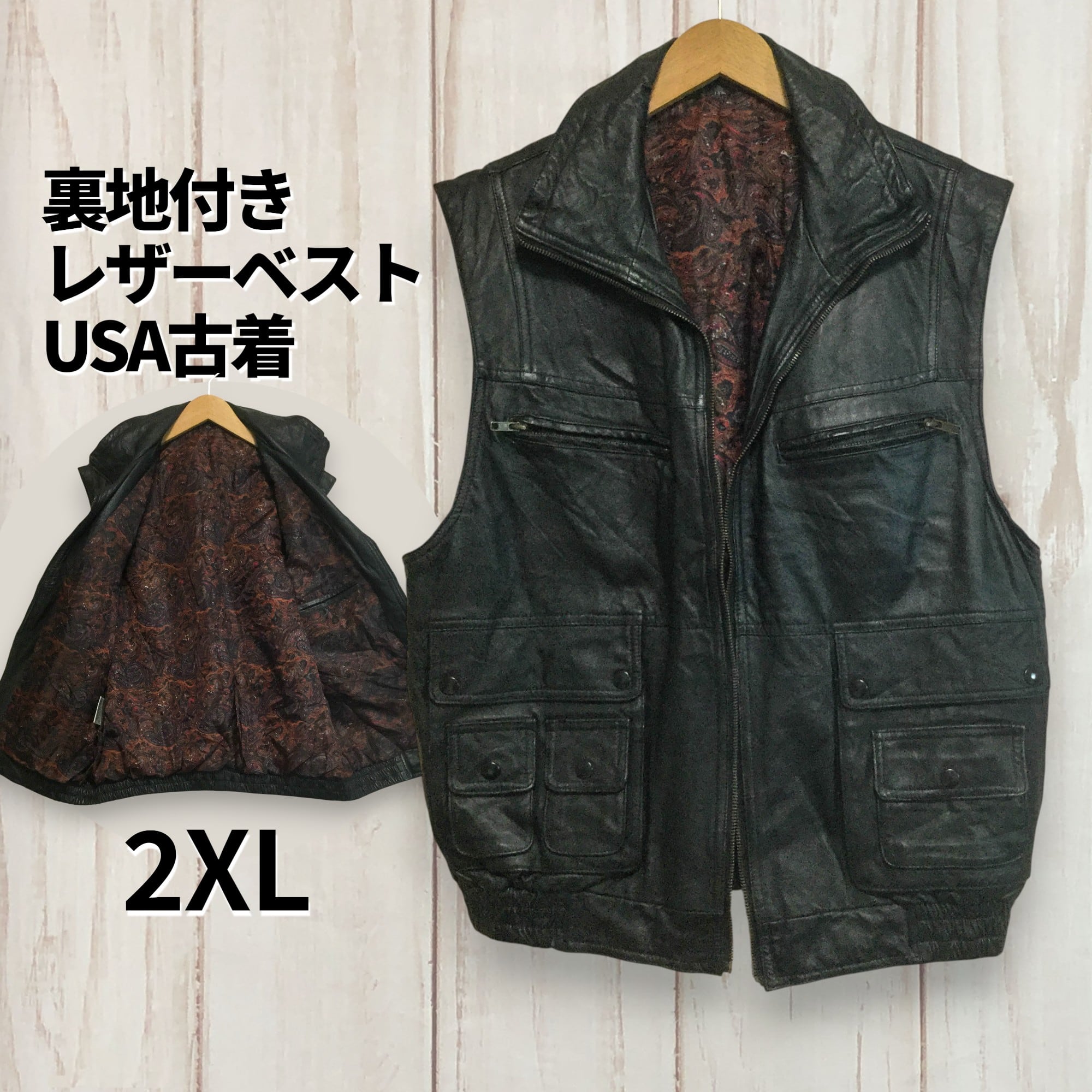 古着 レザーベスト ブラック 豚革 ナッパレザー ボタン留め ポケット付 シンプル スリムシルエット バイカー 2XL相当 黒