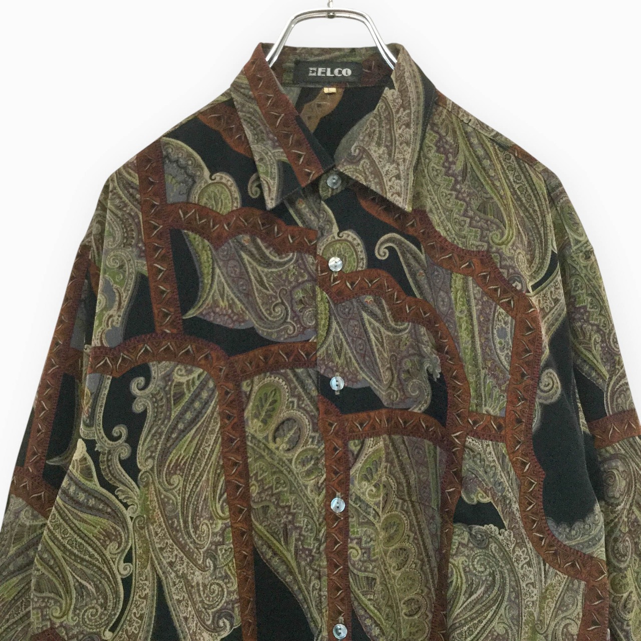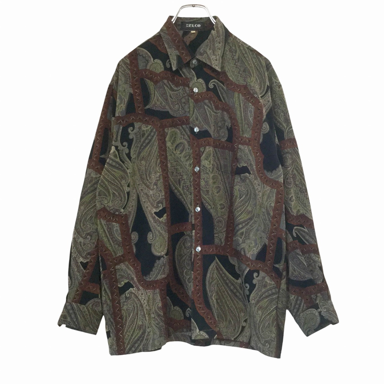 ELCO 日本製 古着 長袖シャツ 総柄シャツ ペイズリー柄 スカーフ柄 昭和レトロ 90s ポリエステル100% テロ素材 ドレープ Lサイズ メンズ ダークカラー ブラックベース モード レトロモダン 春秋 ポケット