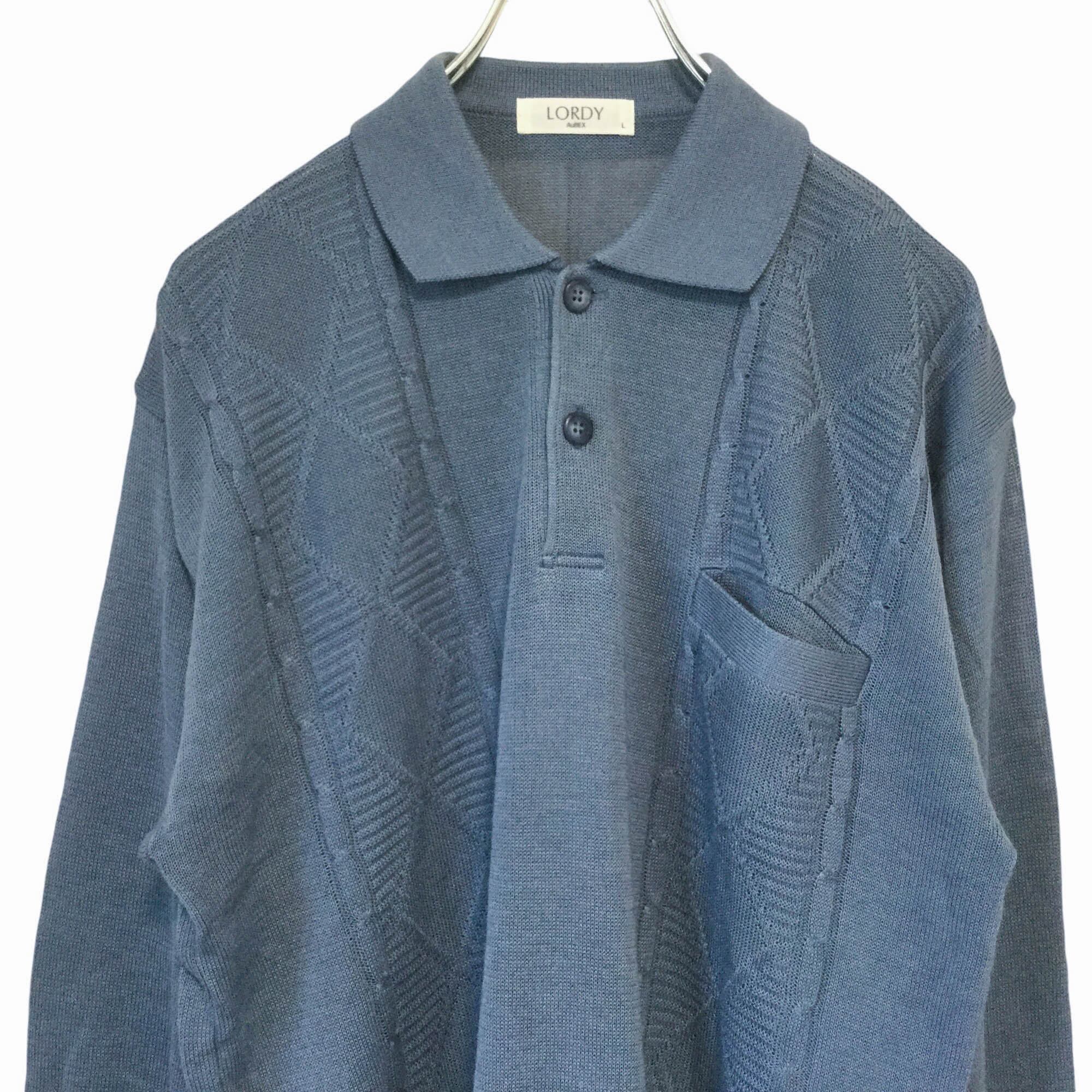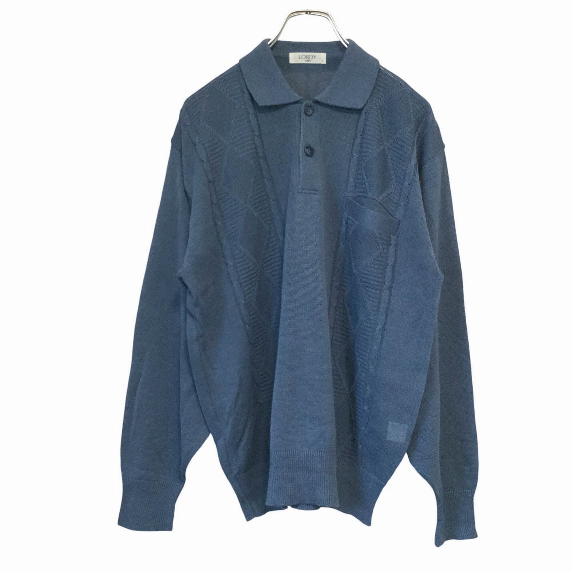 LORDY 長袖ポロシャツ サマーニット 透かし編み ケーブル編み 青 ブルー Lサイズ ポケット付き 襟付き 日本ブランド メンズ 古着 春夏 軽やか 透け感