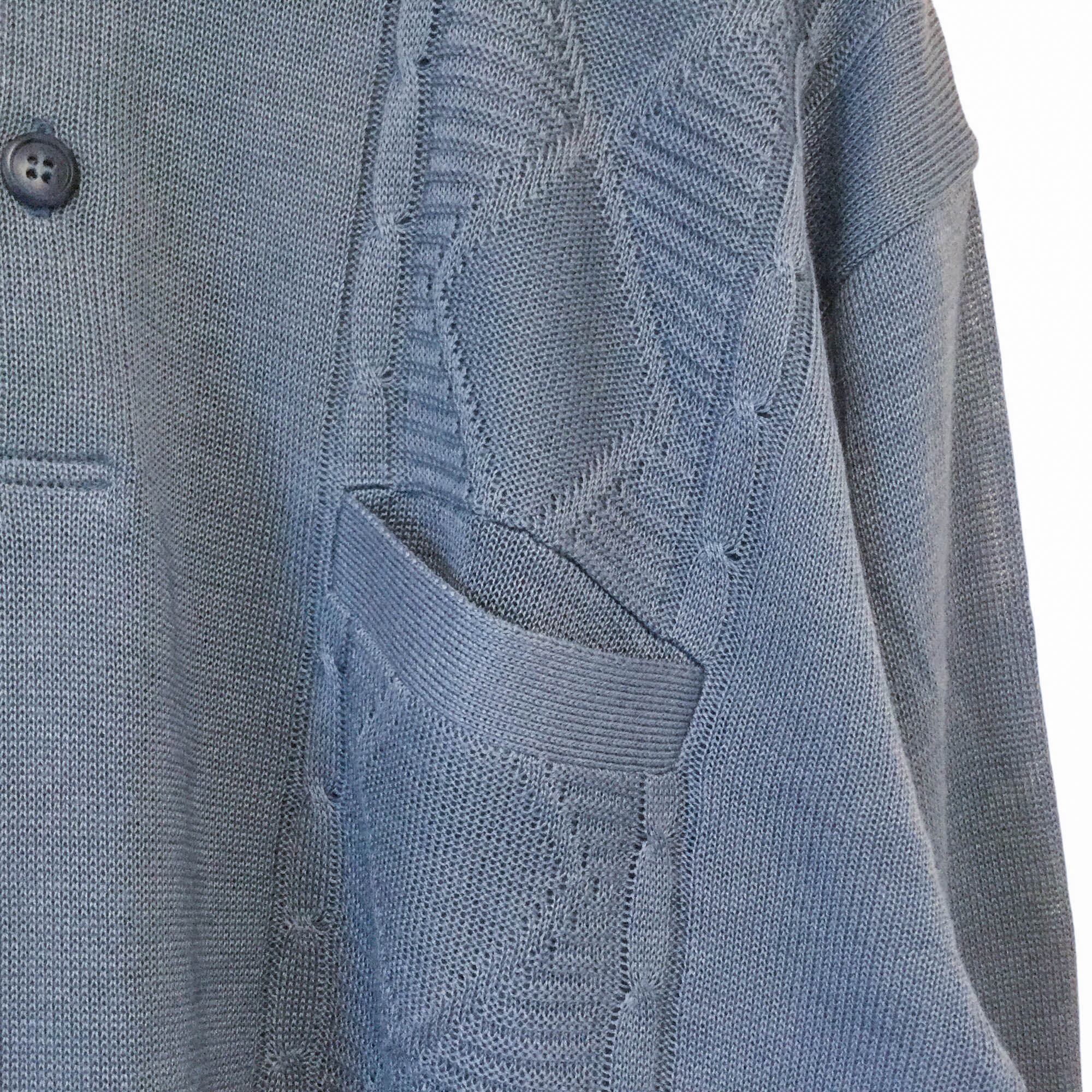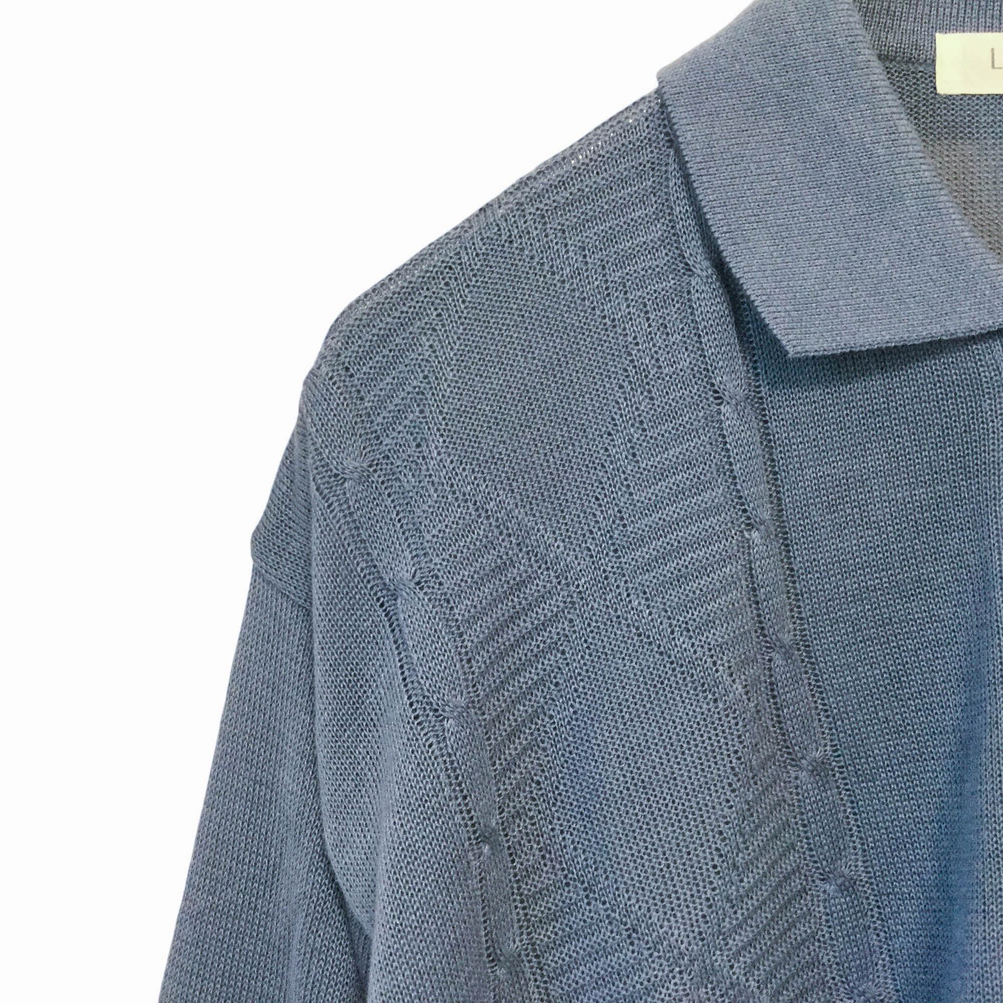 落ち着いたブルーに、透かし編みとケーブル編みが映える上品な長袖ポロシャツです。