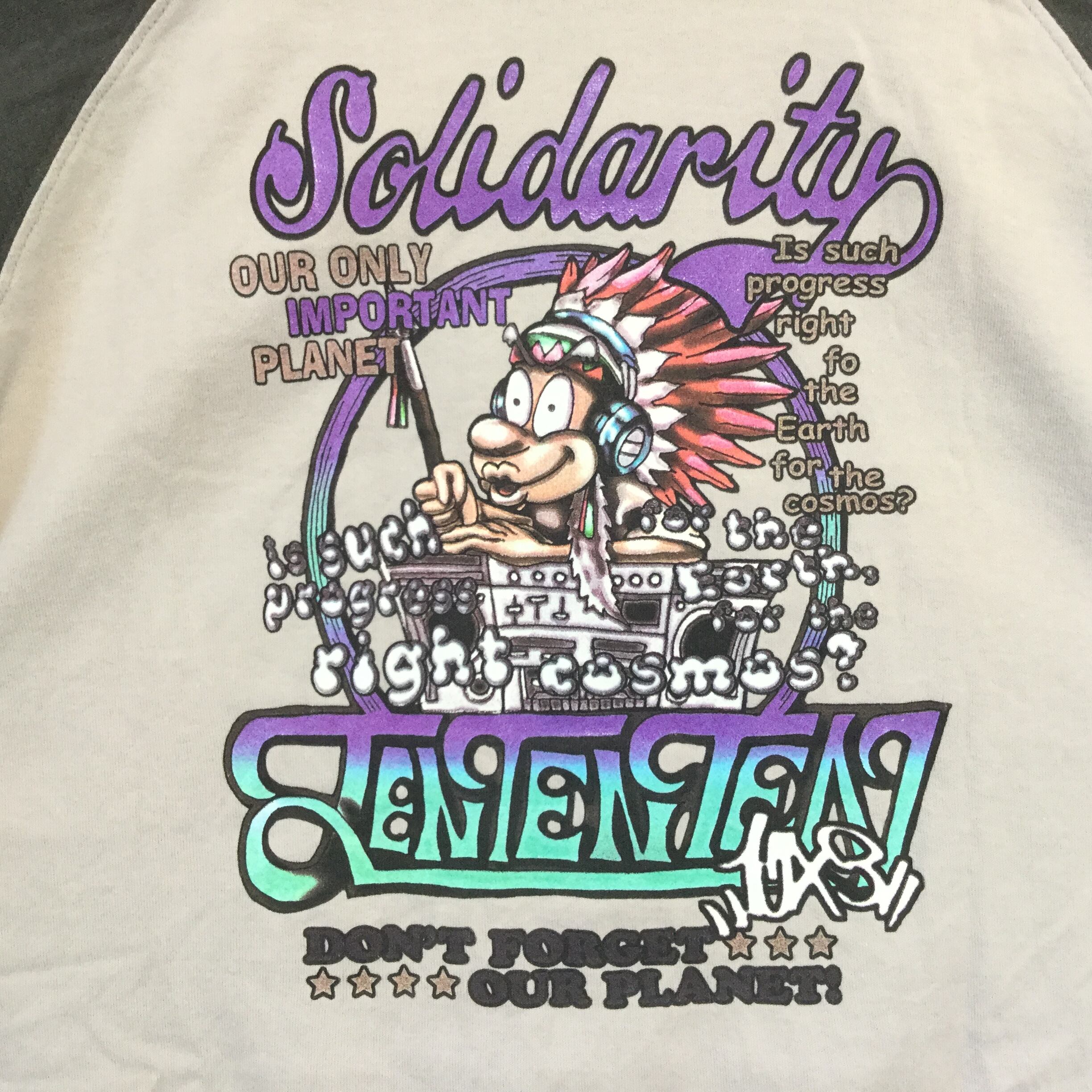 フロントはシンプル、背面に大きなイラストプリントが入ったインパクトのあるラグランTシャツです。