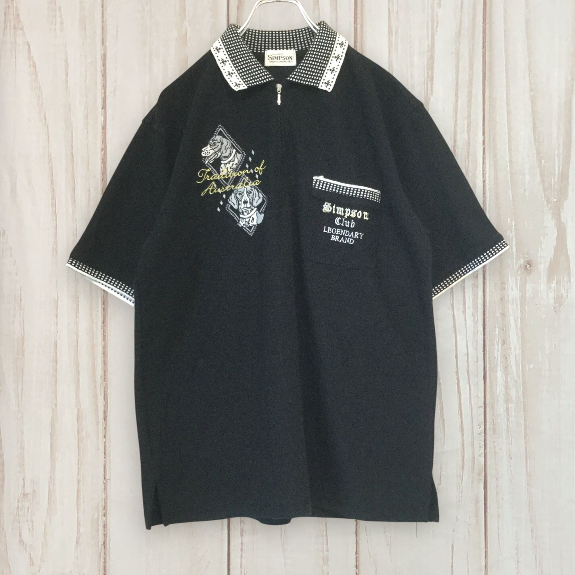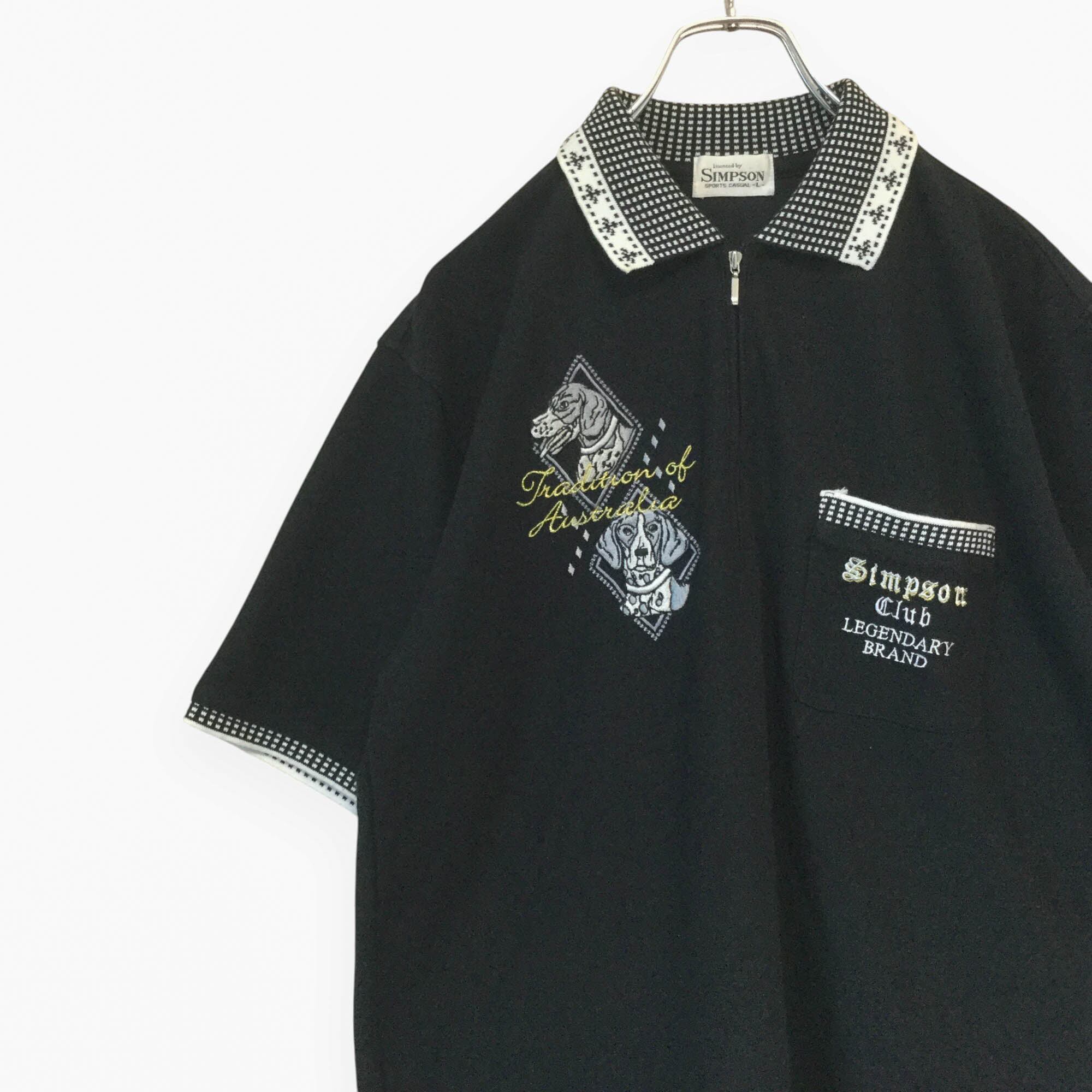 古着 シンプソン SIMPSON 半袖ポロシャツ ハーフジップ 刺繍 犬モチーフ 襟柄 切り替え ブラック Lサイズ L 黒