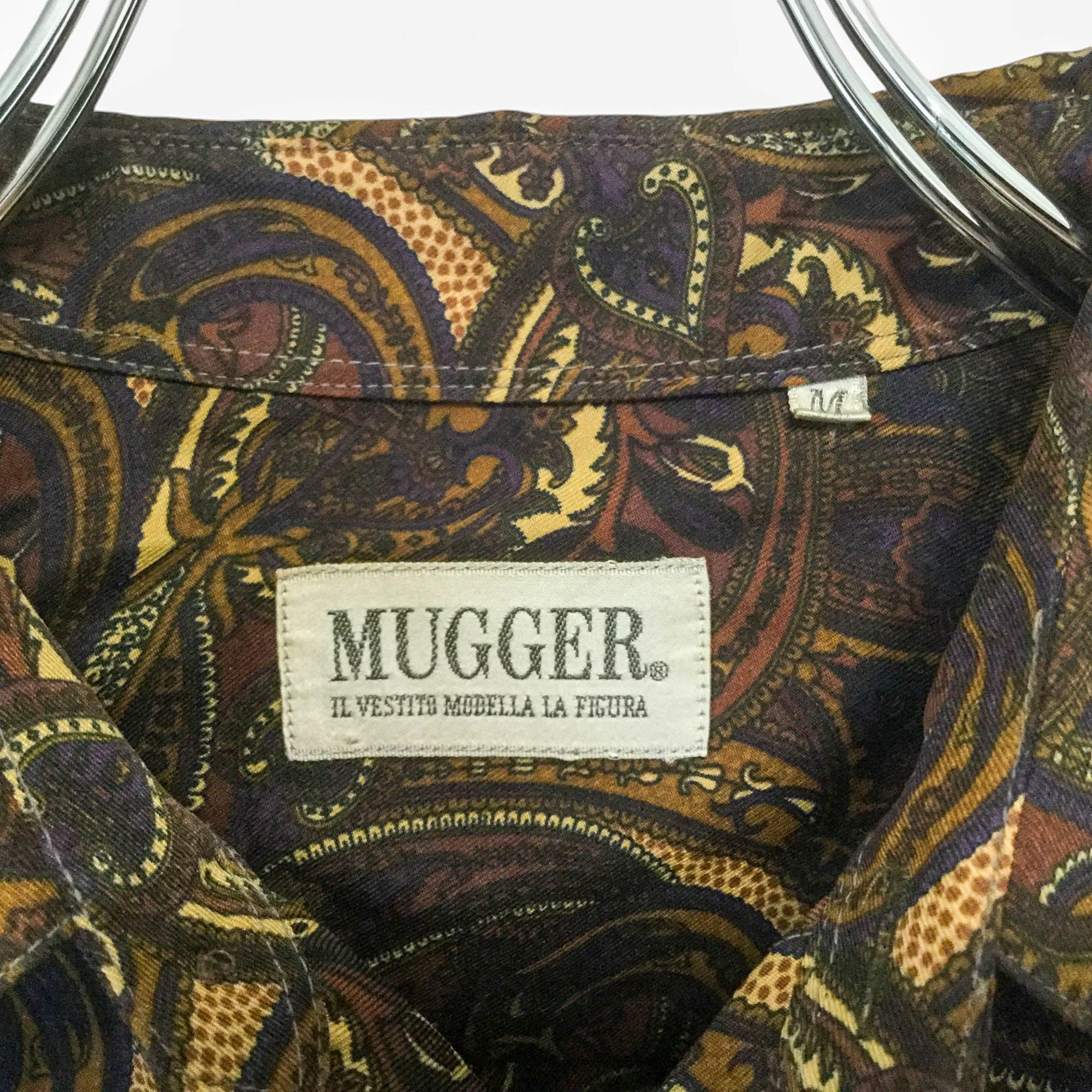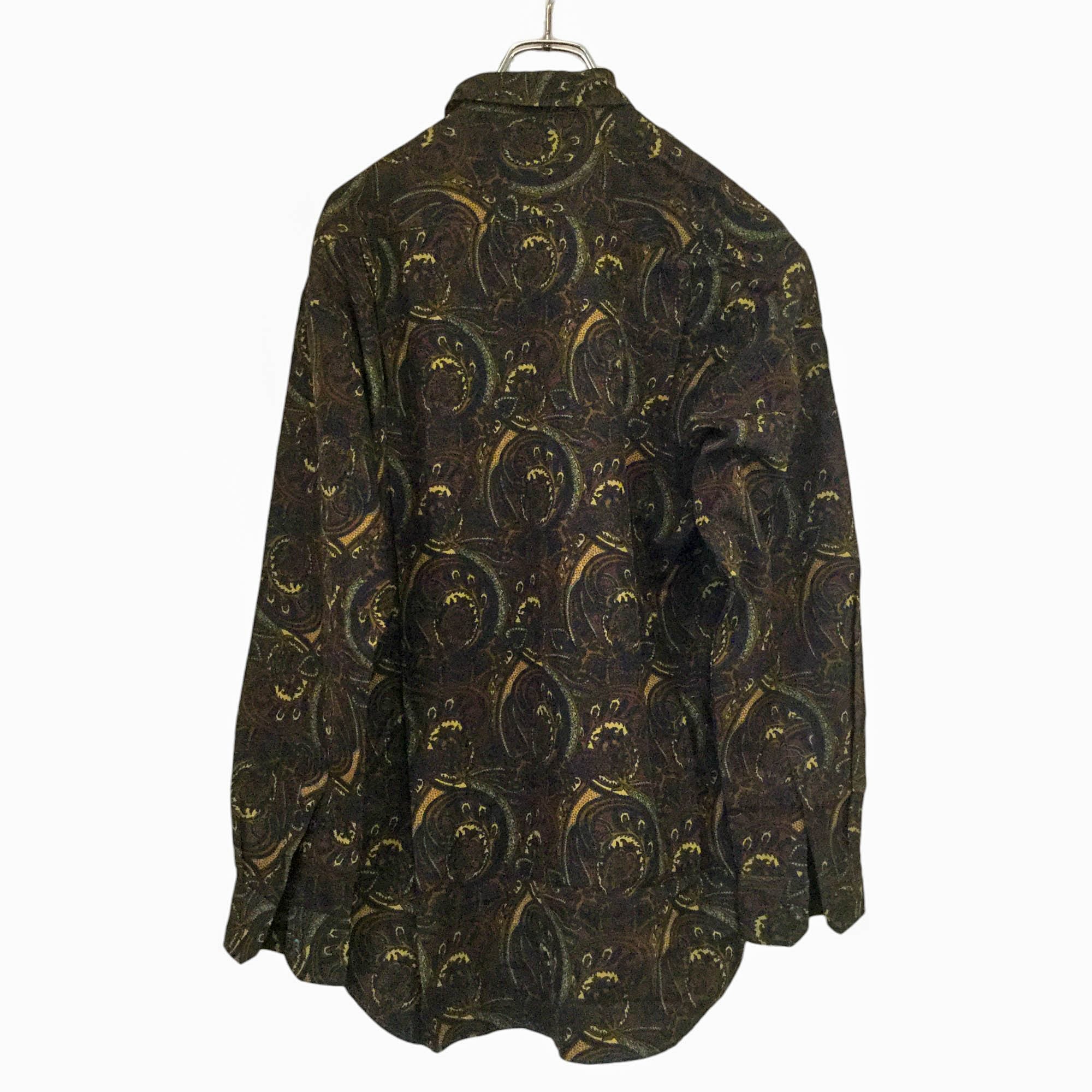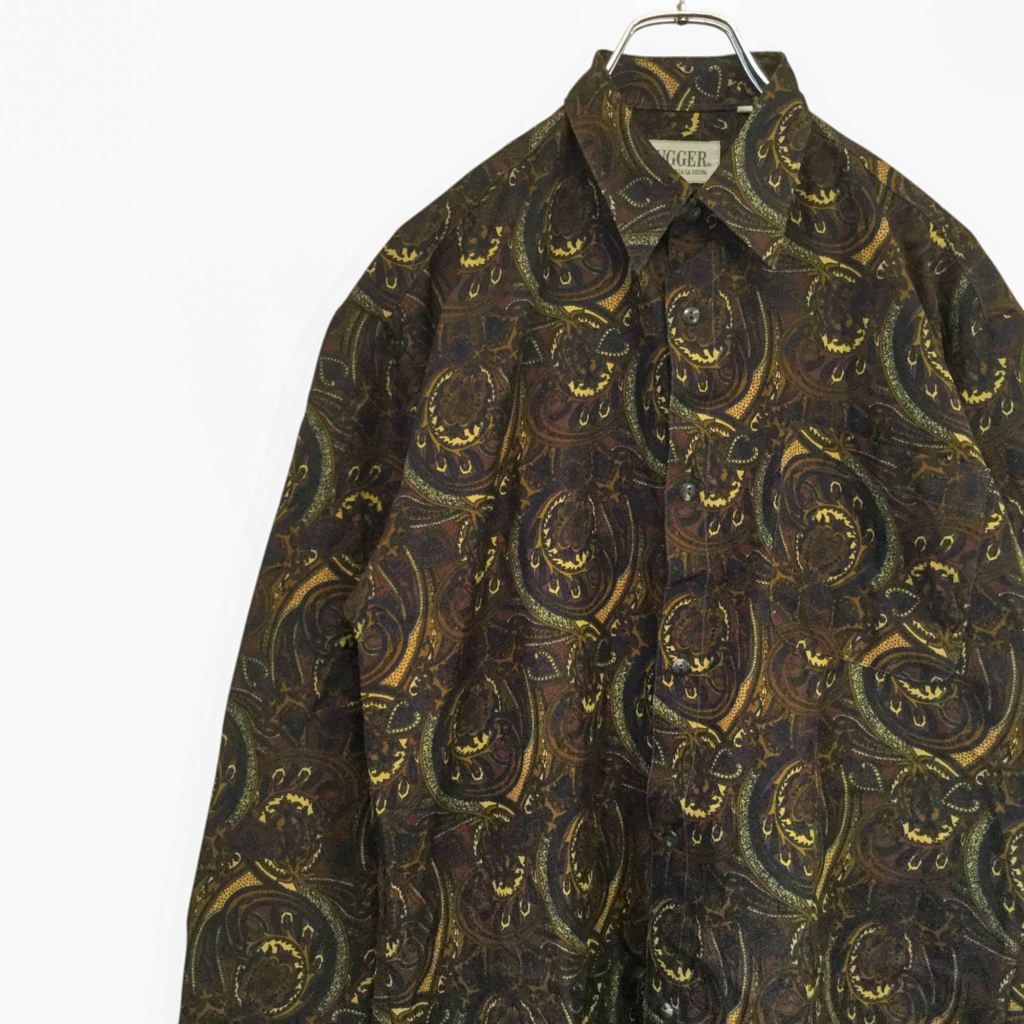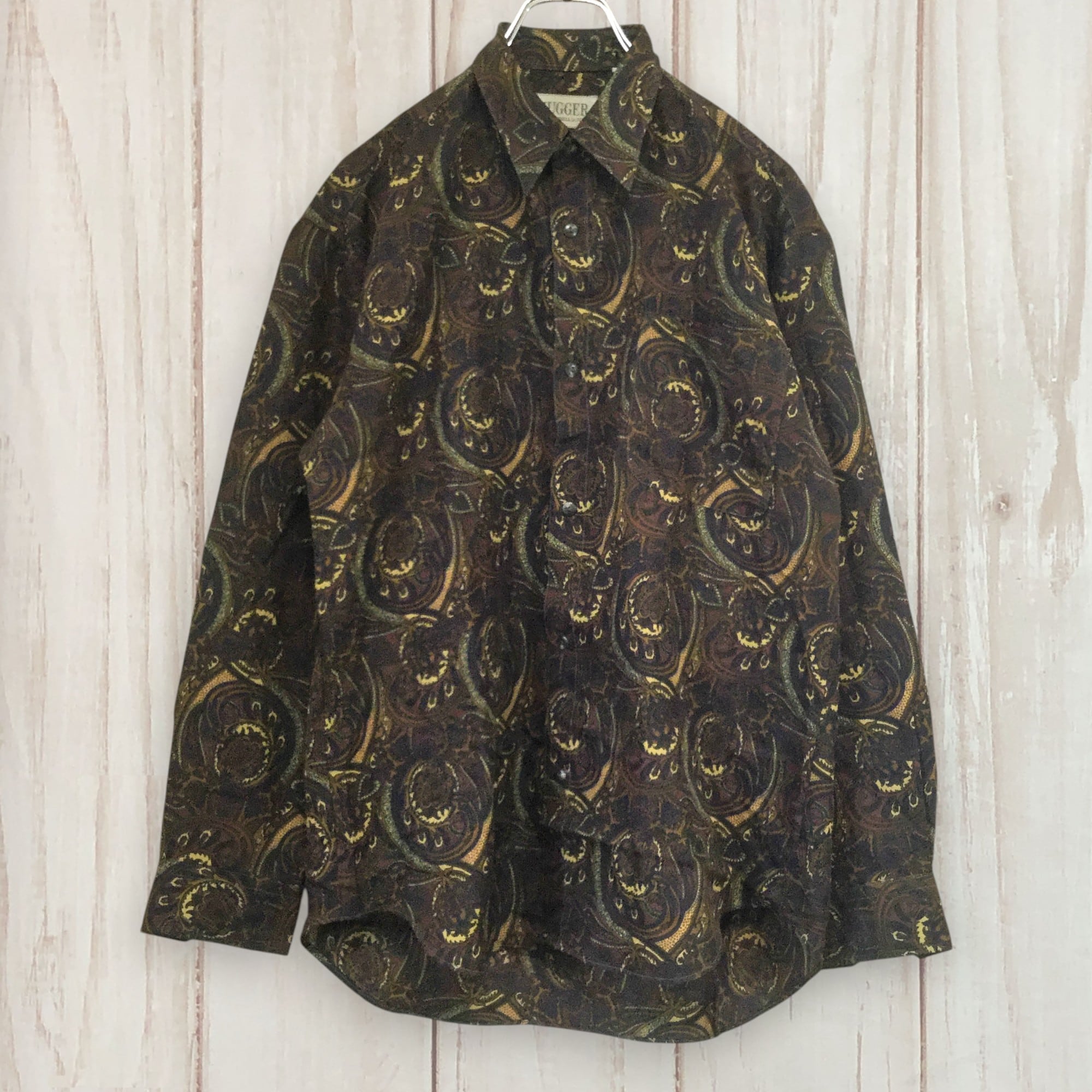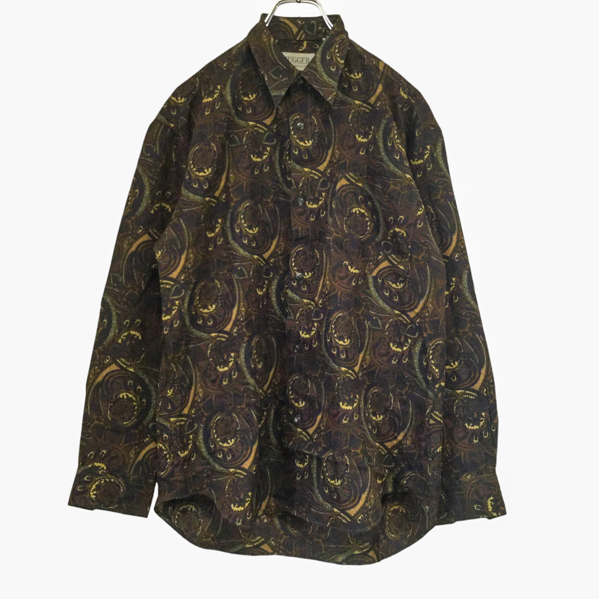 MUGGER 古着 長袖 シャツ 日本製 総柄 ペイズリー柄 スカーフ柄 ダークカラー ブラウン Mサイズ メンズ 昭和レトロ ポリエステル100% レトロデザイン ペイズリー