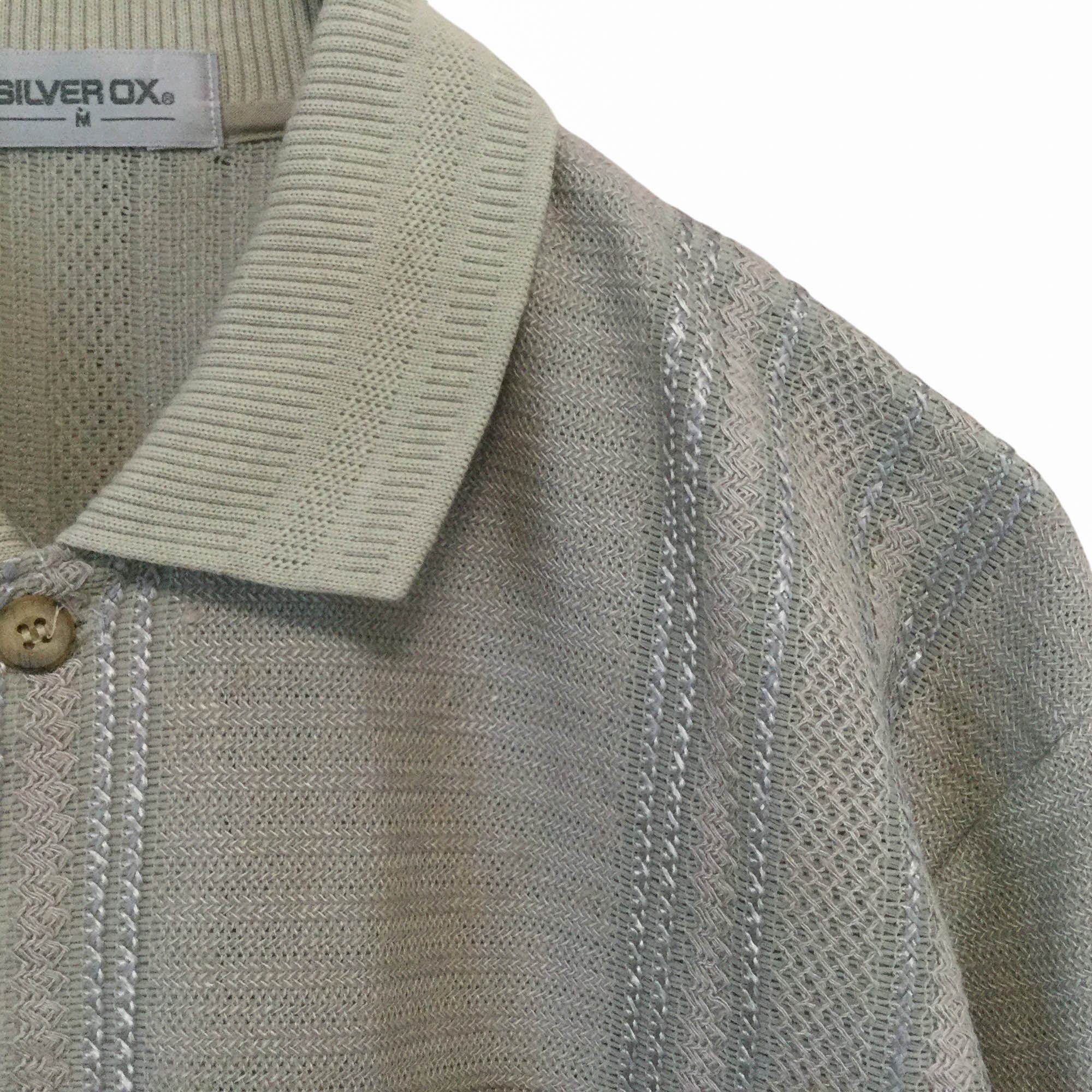 SILVER OX 古着 半袖 シャツ ニット素材 日本製 未使用品 昭和レトロ ベージュ Mサイズ メンズ 羽織り ジャガード編み レトロデザイン きれいめ