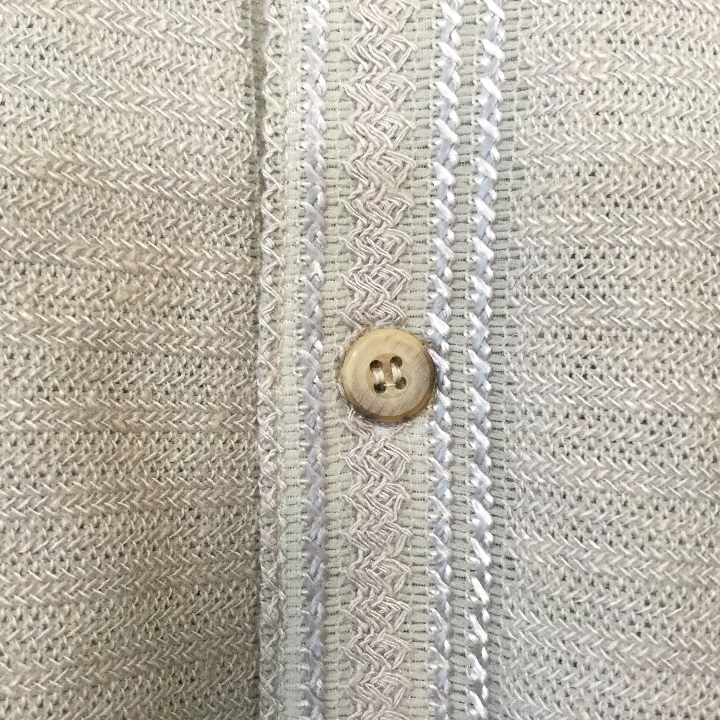 ベージュ系の落ち着いたカラーに、縦ラインを基調とした編み柄デザインが特徴的な一枚。シャツ型ながらニット素材のため、ほどよい柔らかさと上品さを兼ね備えています。