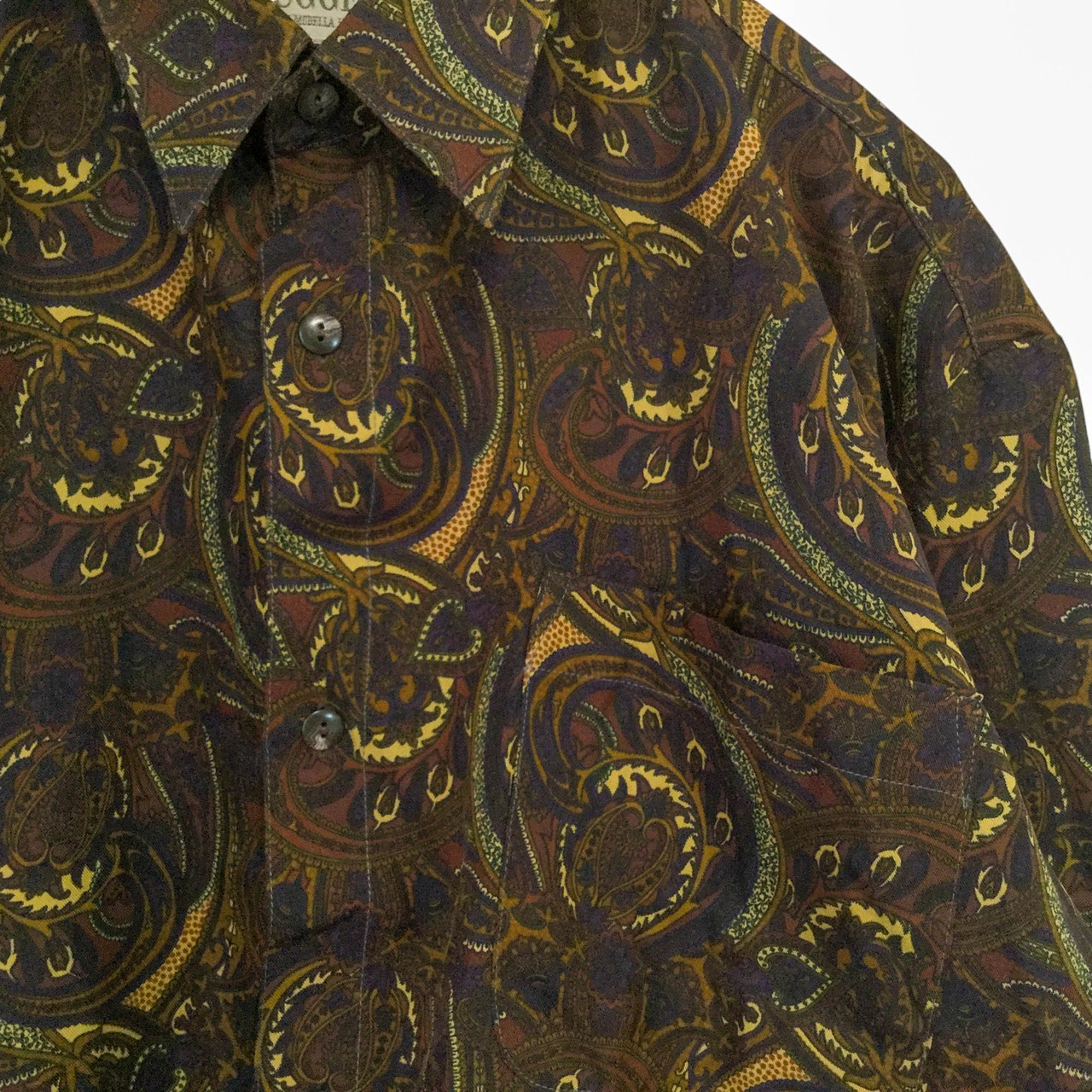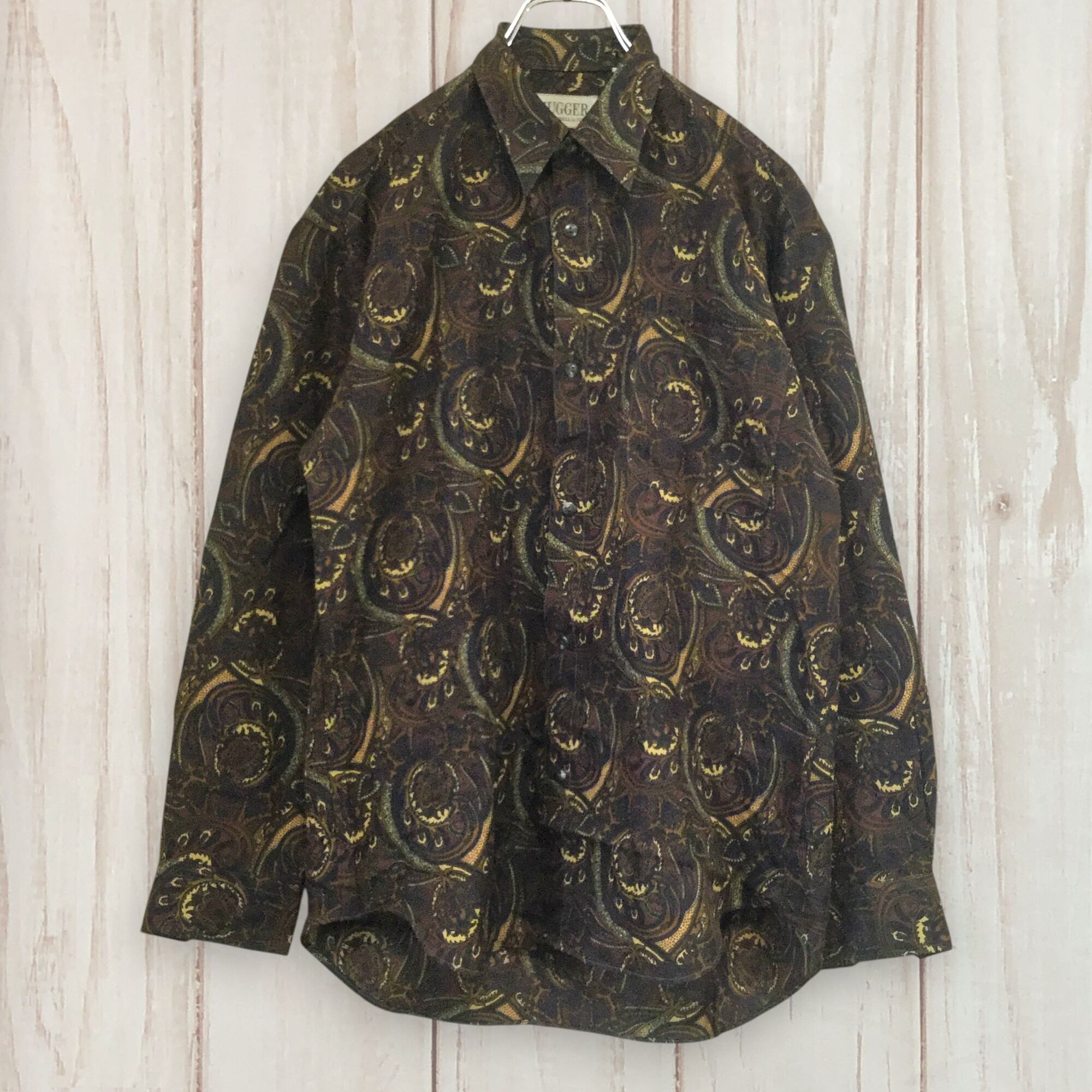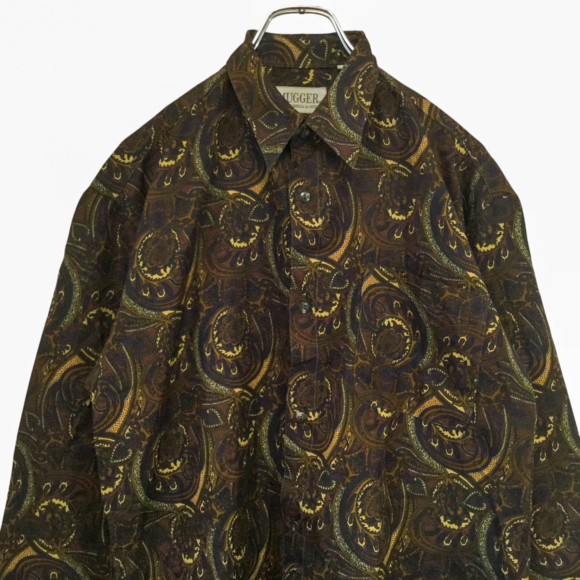 MUGGER 古着 長袖 シャツ 日本製 総柄 ペイズリー柄 スカーフ柄 ダークカラー ブラウン Mサイズ メンズ 昭和レトロ ポリエステル100% レトロデザイン ペイズリー