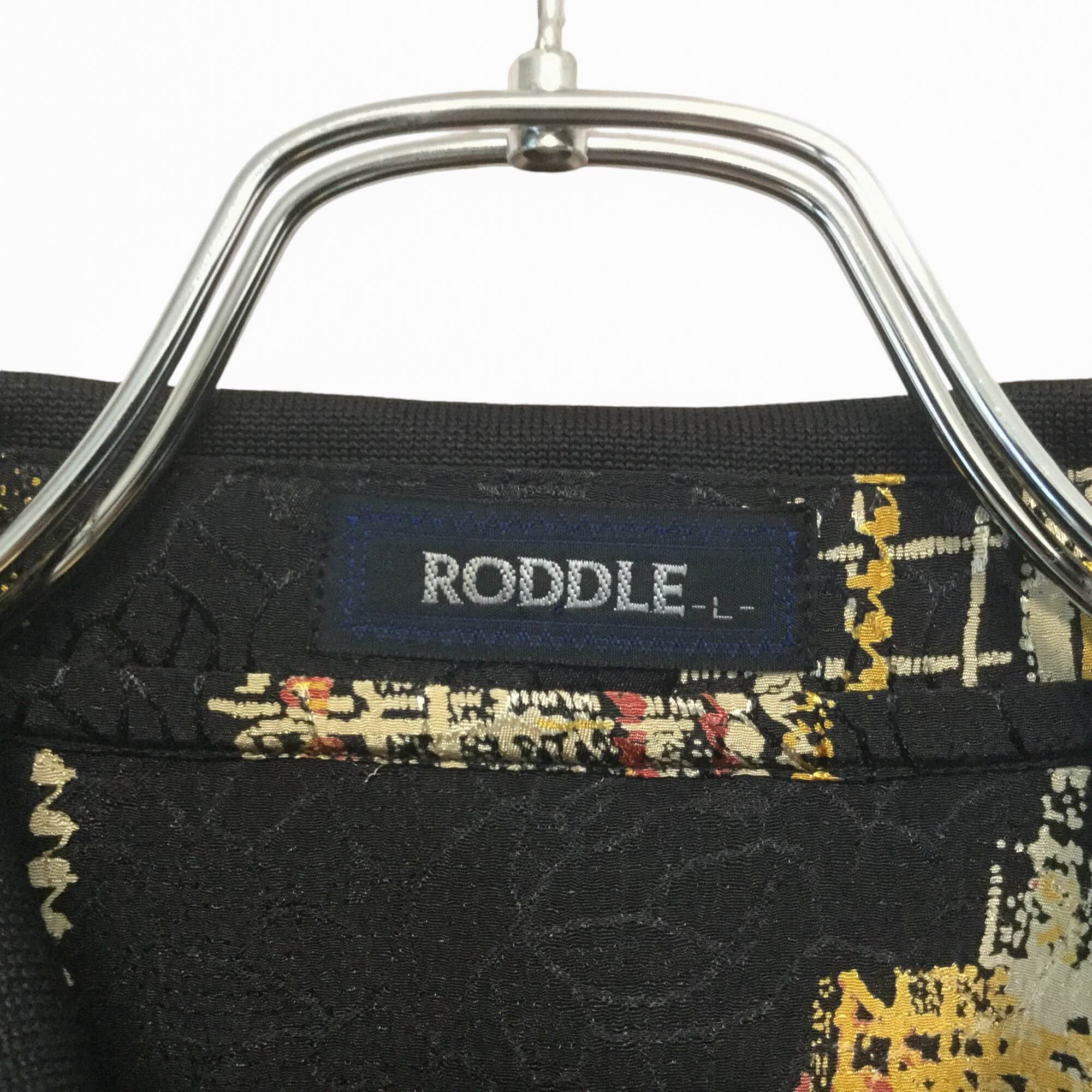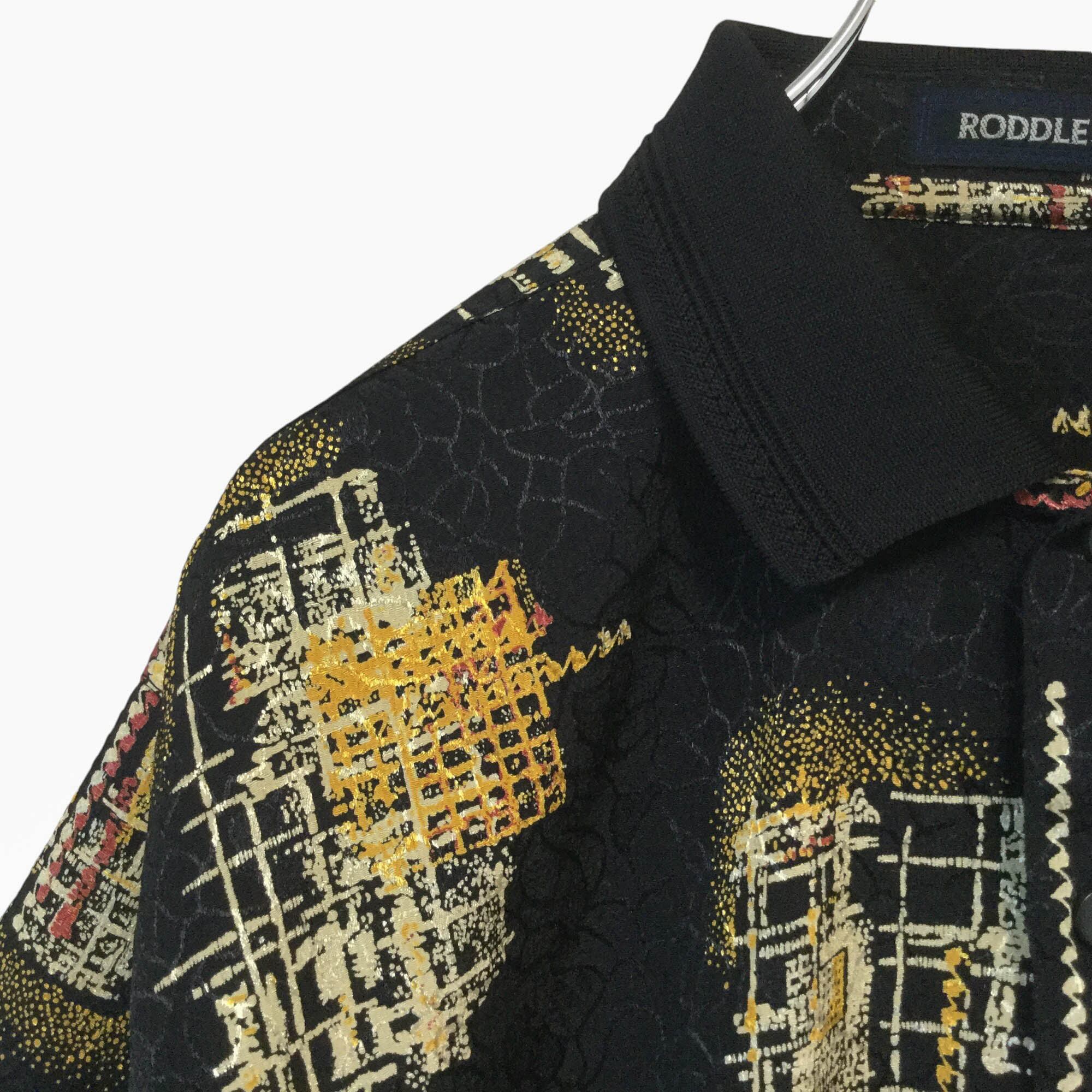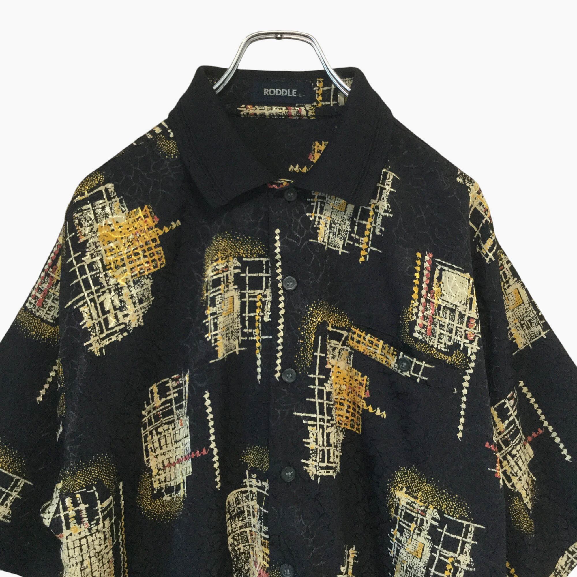 PODDLE 半袖 ポロシャツ 総柄 黒 ブラック 昭和レトロ レトロ柄 アート柄 柄シャツ ポリエステル Lサイズ メンズ 古着 個性派 ゆったり ダークカラー