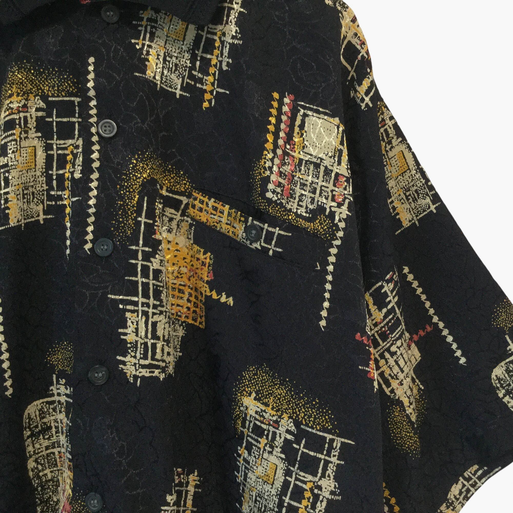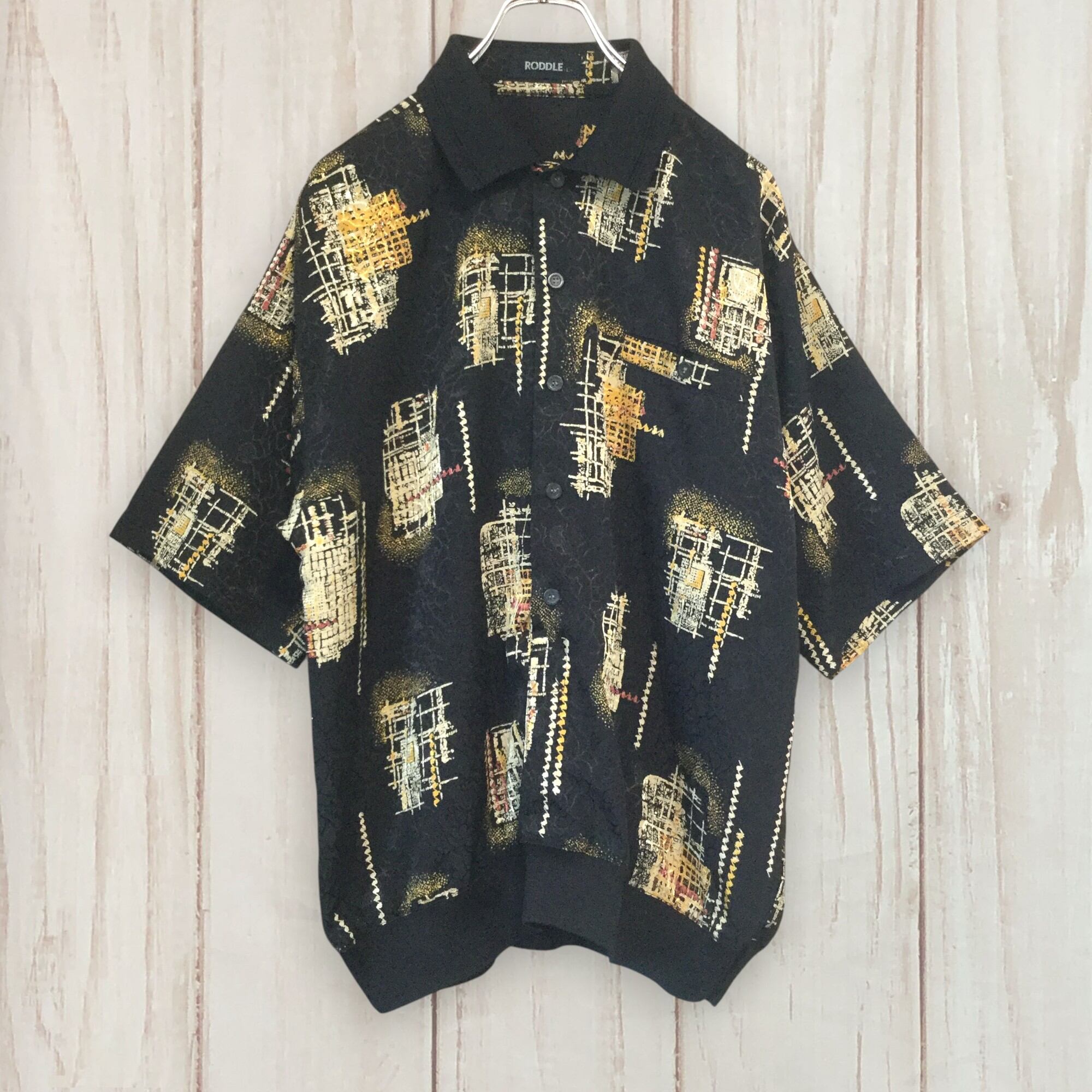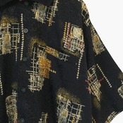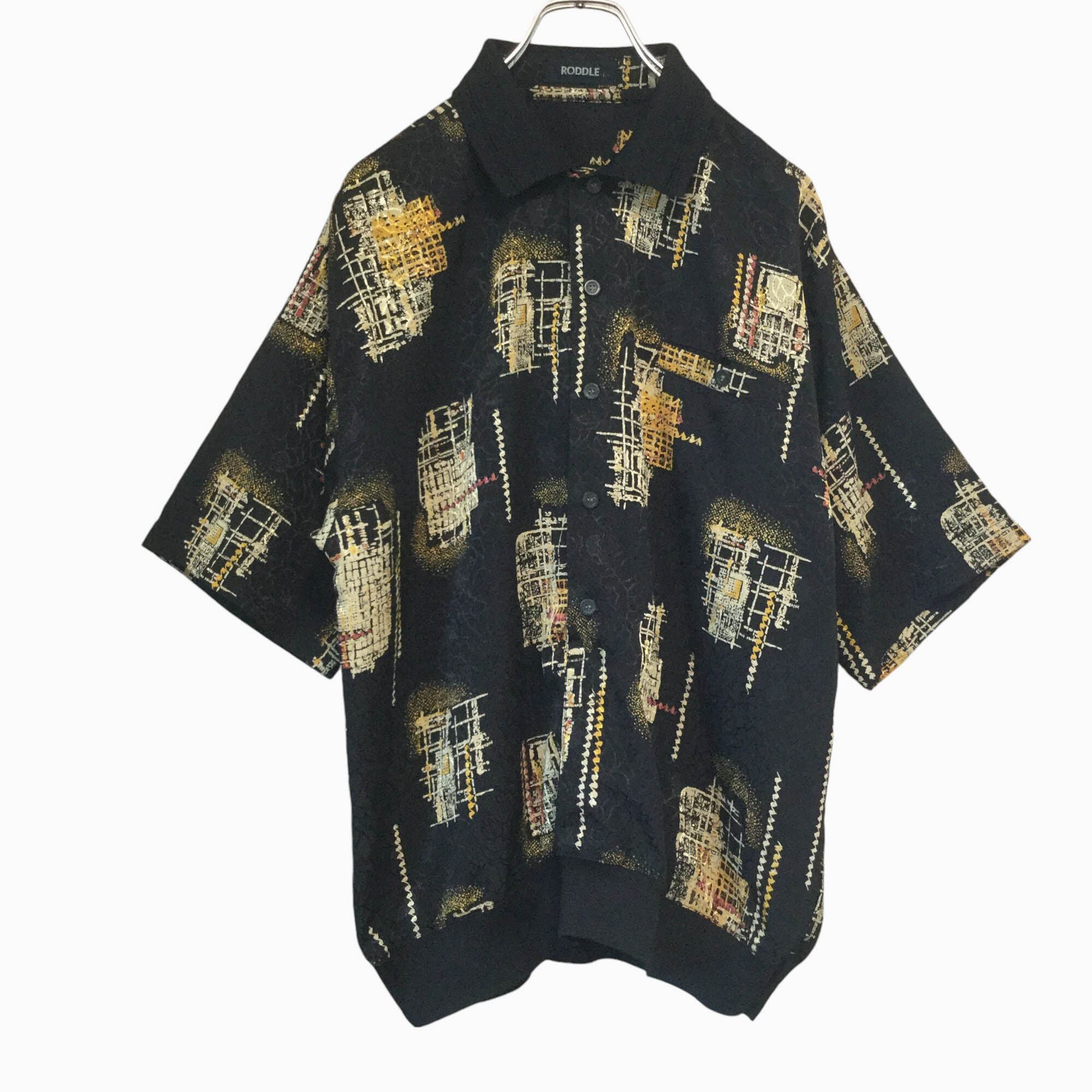 古着 半袖ポロシャツ PODDLE 総柄 アート柄 レトロ柄 ブラック ポリエステル ゆったり 個性派 メンズ XL相当