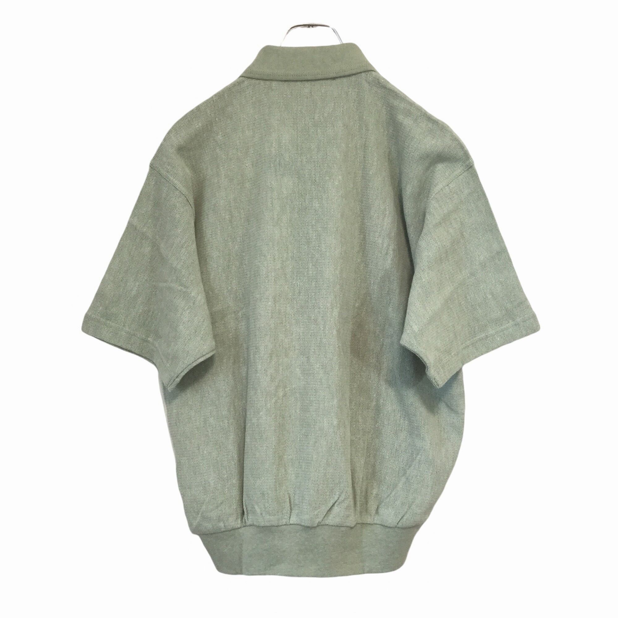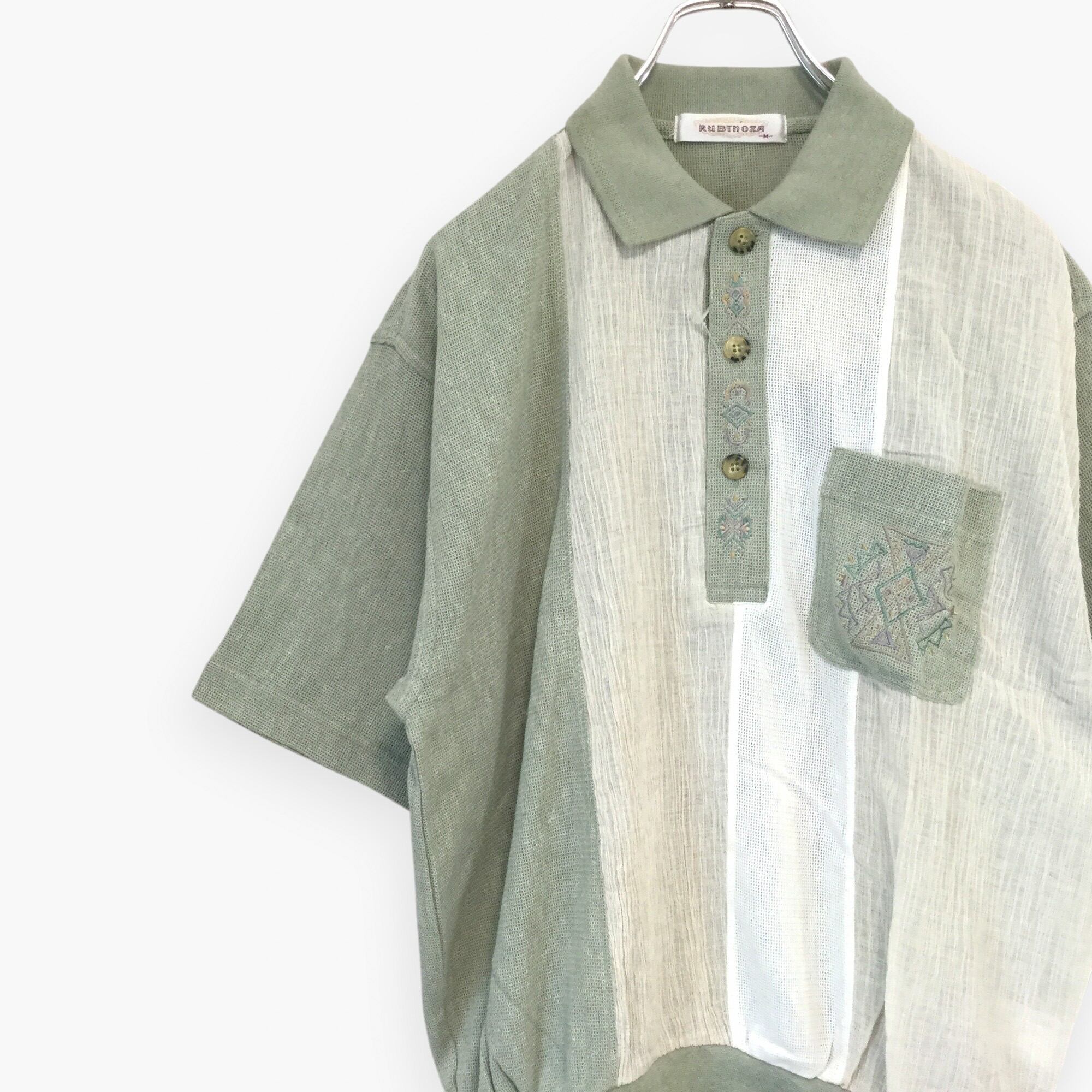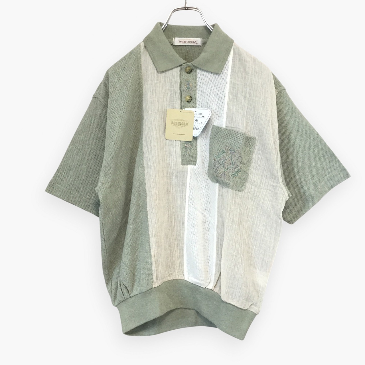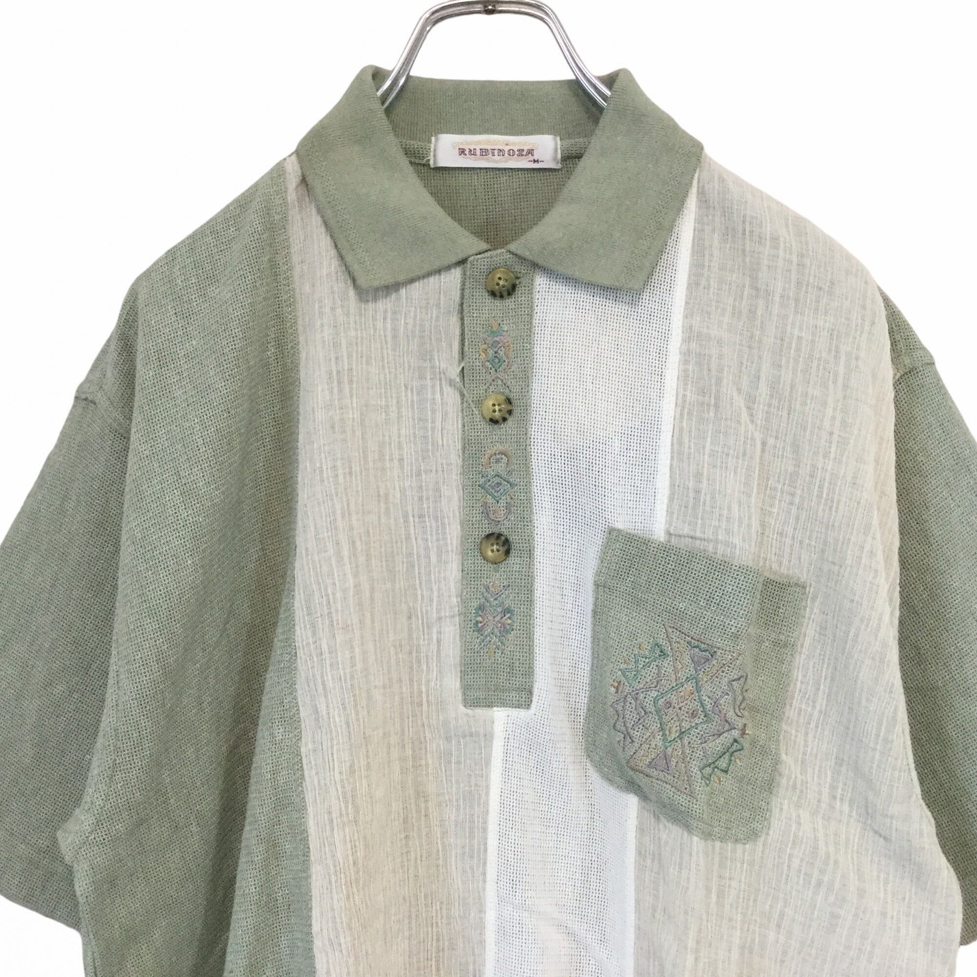 古着 半袖ポロシャツ RUBINOZA しじら織 ニット素材 麻混 切替配色 刺繍ロゴ 胸ポケット サマーニット 未使用 涼感 M